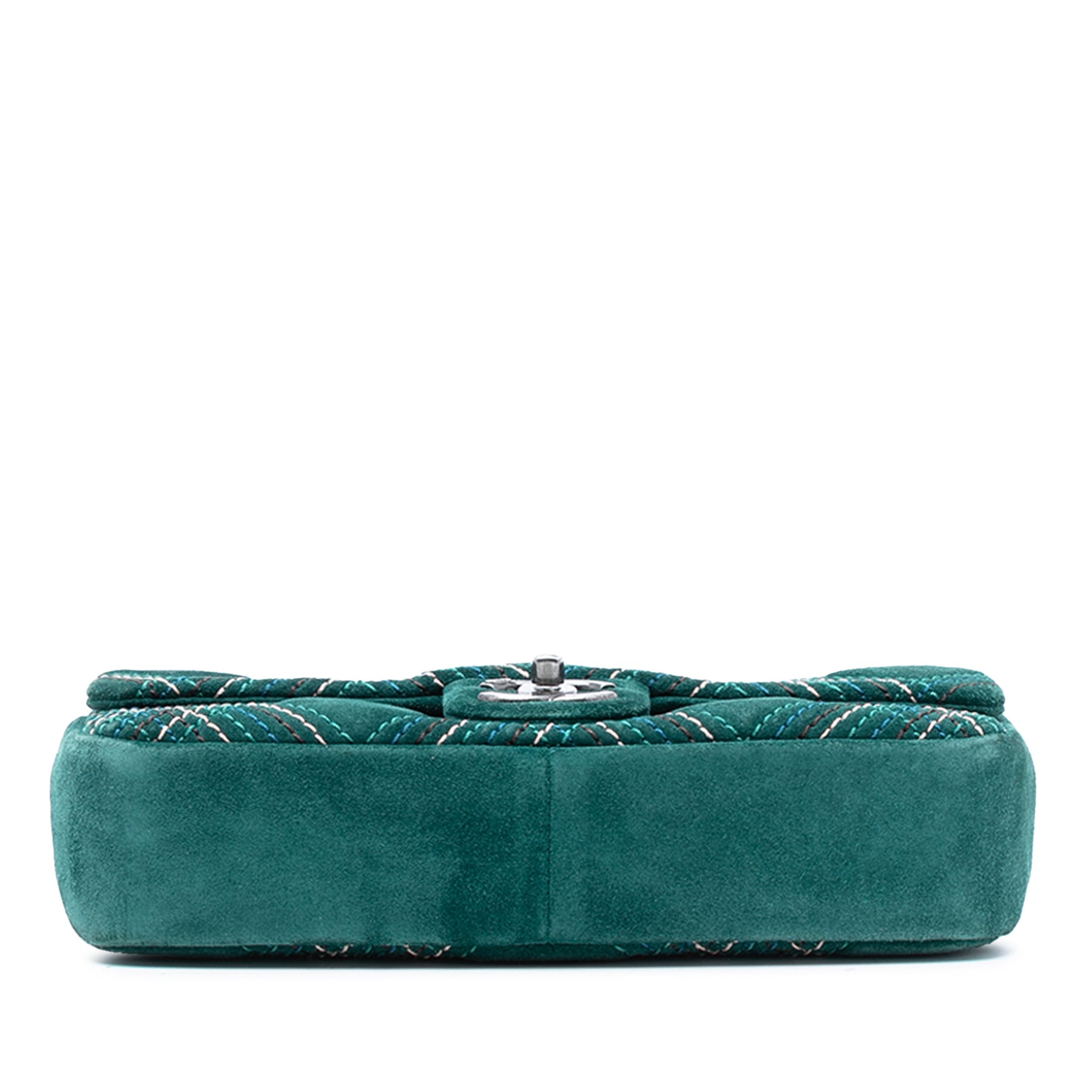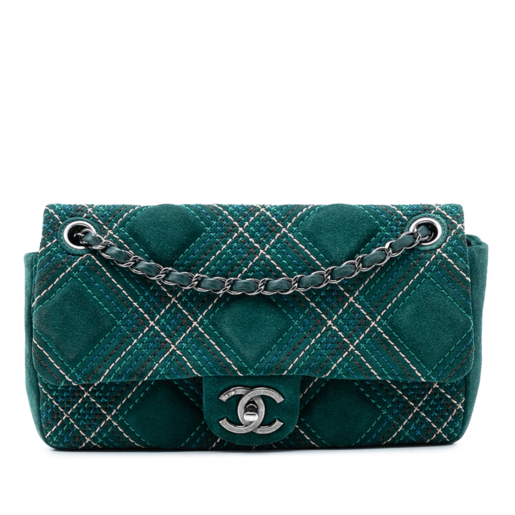 Le sac Saltire est en daim, avec des bandoulières en chaîne tressée de cuir, un rabat à fermoir tourniquet et une poche intérieure zippée. Il est en excellent état.