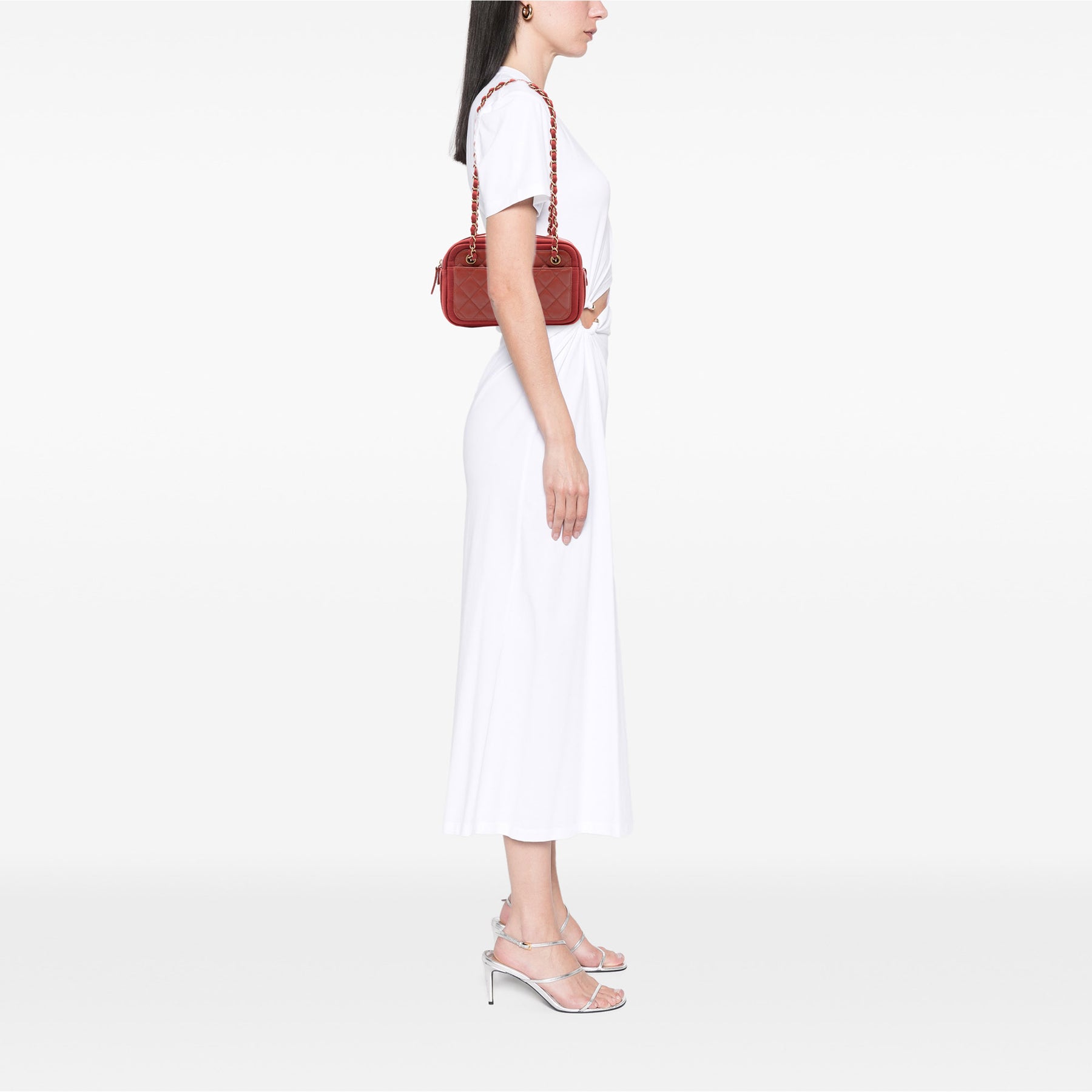 Ce sac bandoulière est confectionné en cuir et coton, avec une bandoulière en chaîne tressée de coton, une fermeture zippée sur le dessus, des poches extérieures plaquées et des poches intérieures zippées et plaquées. Il est en bon état.