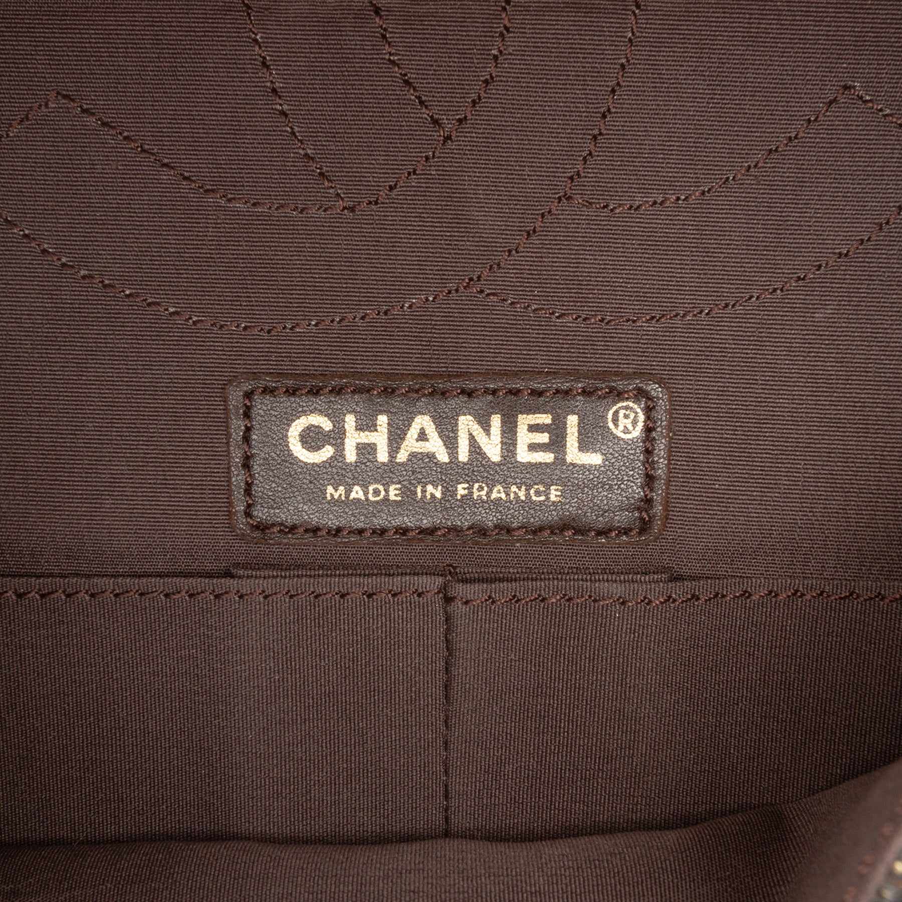 Ce sac à rabat est confectionné en tweed laqué et possède des anses en chaîne dorée, un rabat avant avec fermeture à tourniquet, une poche plaquée extérieure au dos, ainsi que des poches intérieures zippées et plaquées. Il est en excellent état.