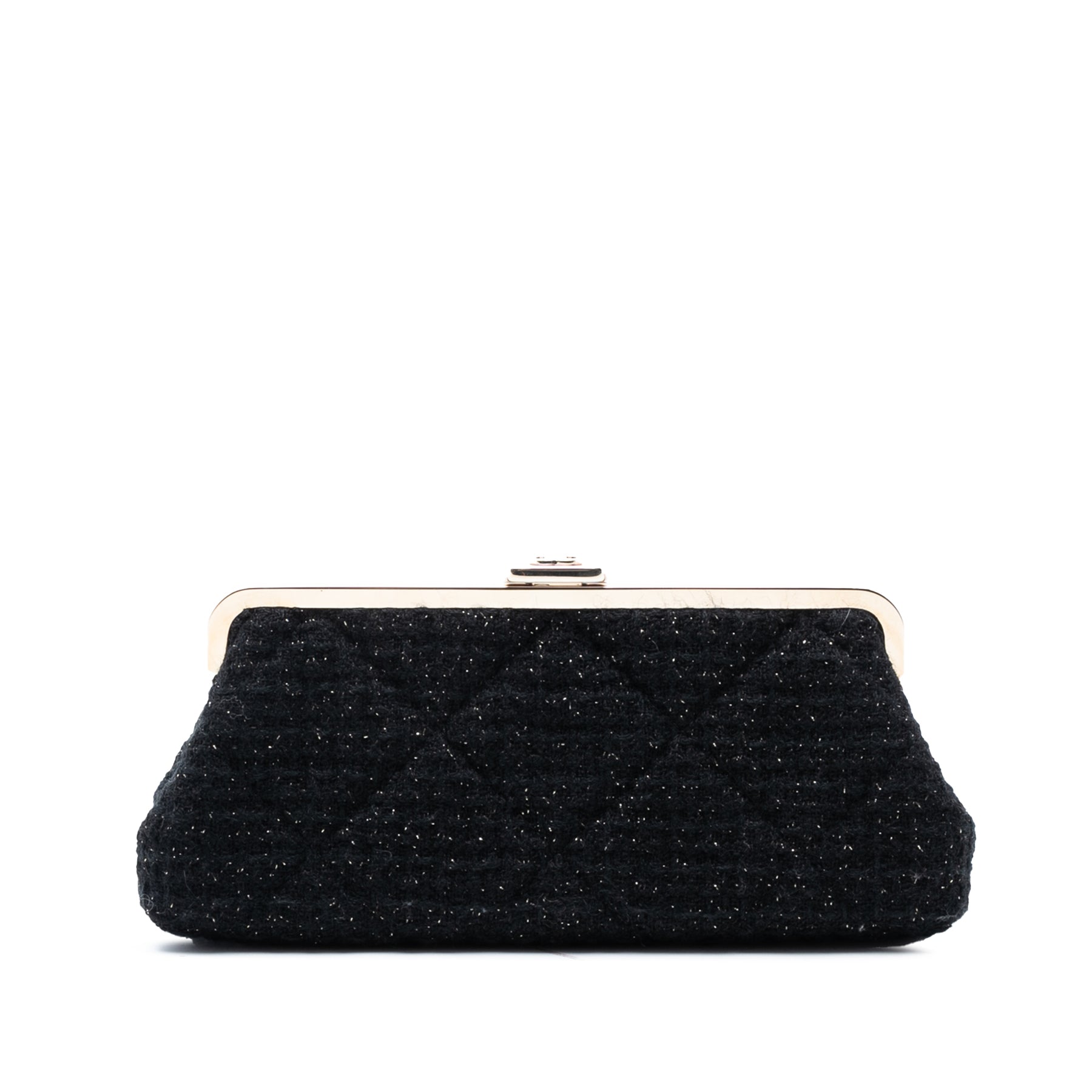 Cette pochette est en tweed matelassé, avec une fermeture à fermoir baiser et des poches intérieures plaquées. Elle est en excellent état.