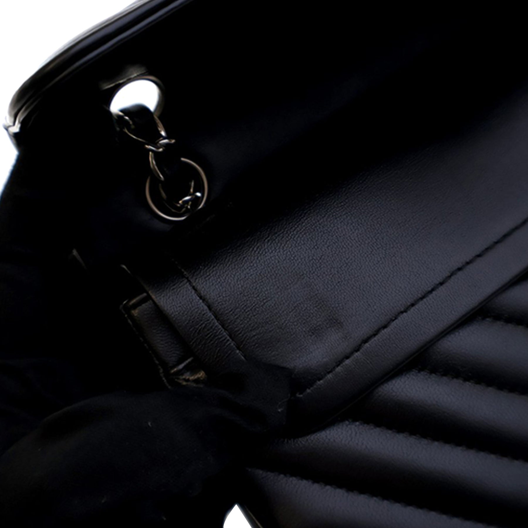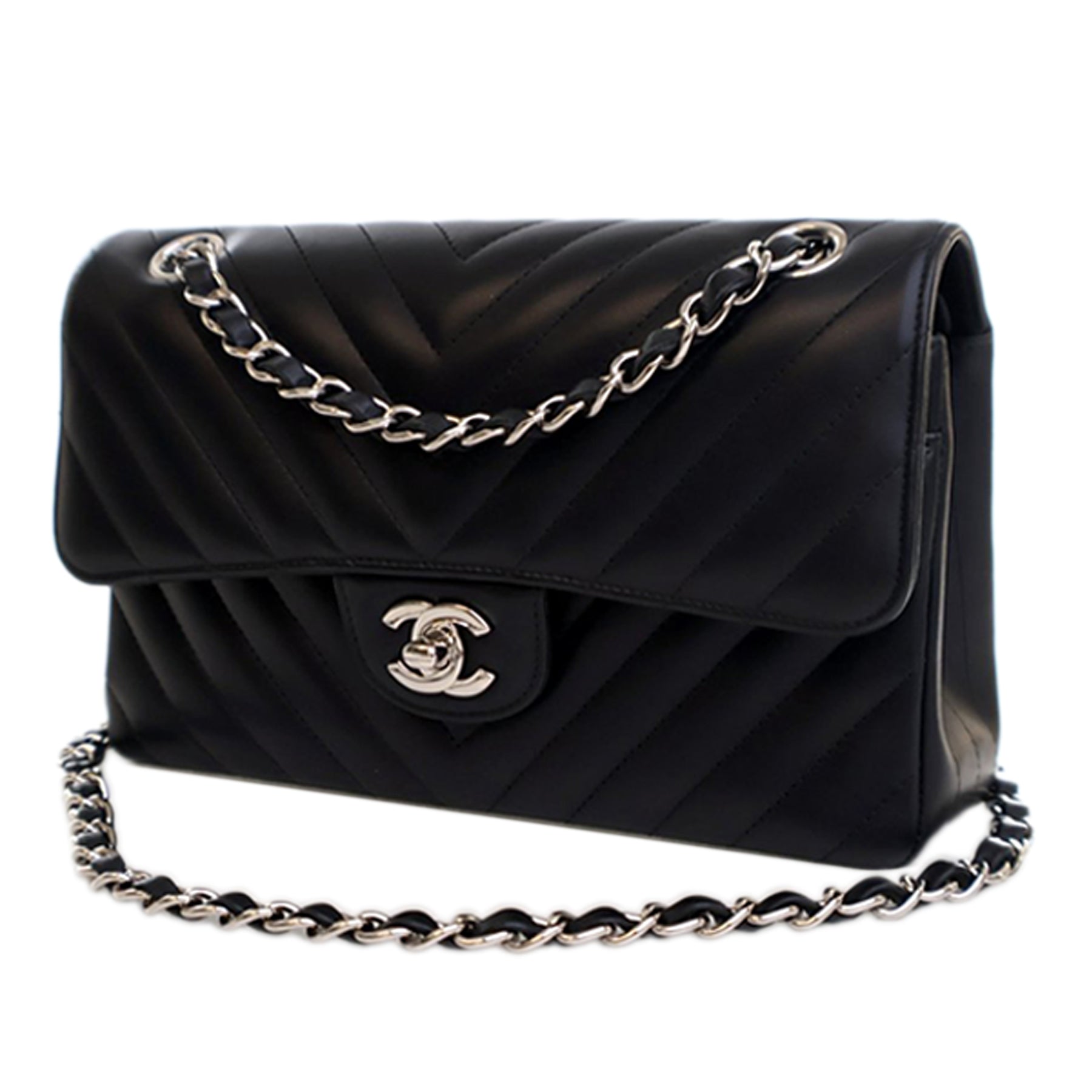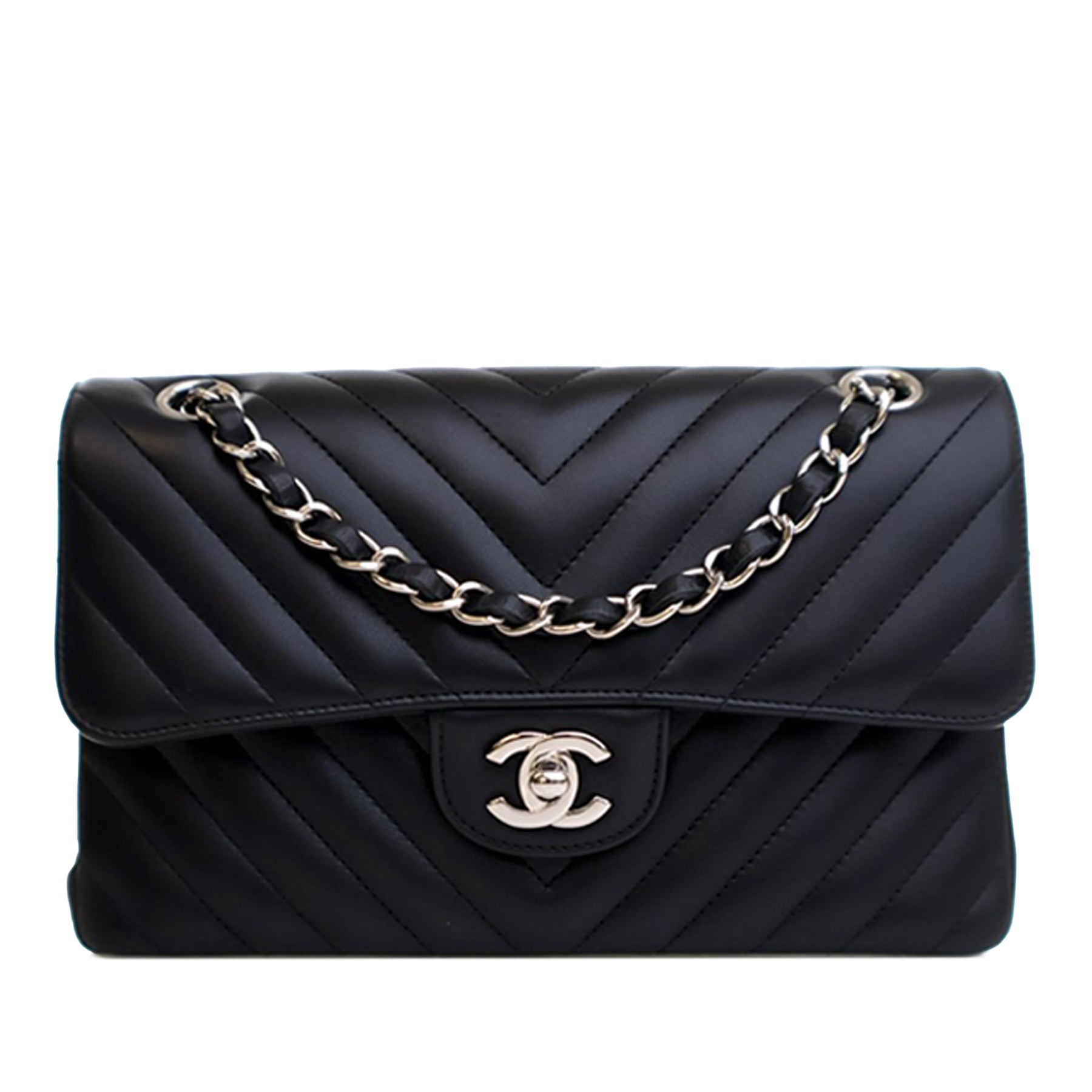 Ce sac bandoulière est confectionné en cuir matelassé à chevrons, avec des bandoulières en chaîne tressée de cuir, un double rabat avant orné de C entrelacés et d'une fermeture à tourniquet, une poche plaquée extérieure au dos, ainsi que des poches intérieures zippées et plaquées. Il est en excellent état.