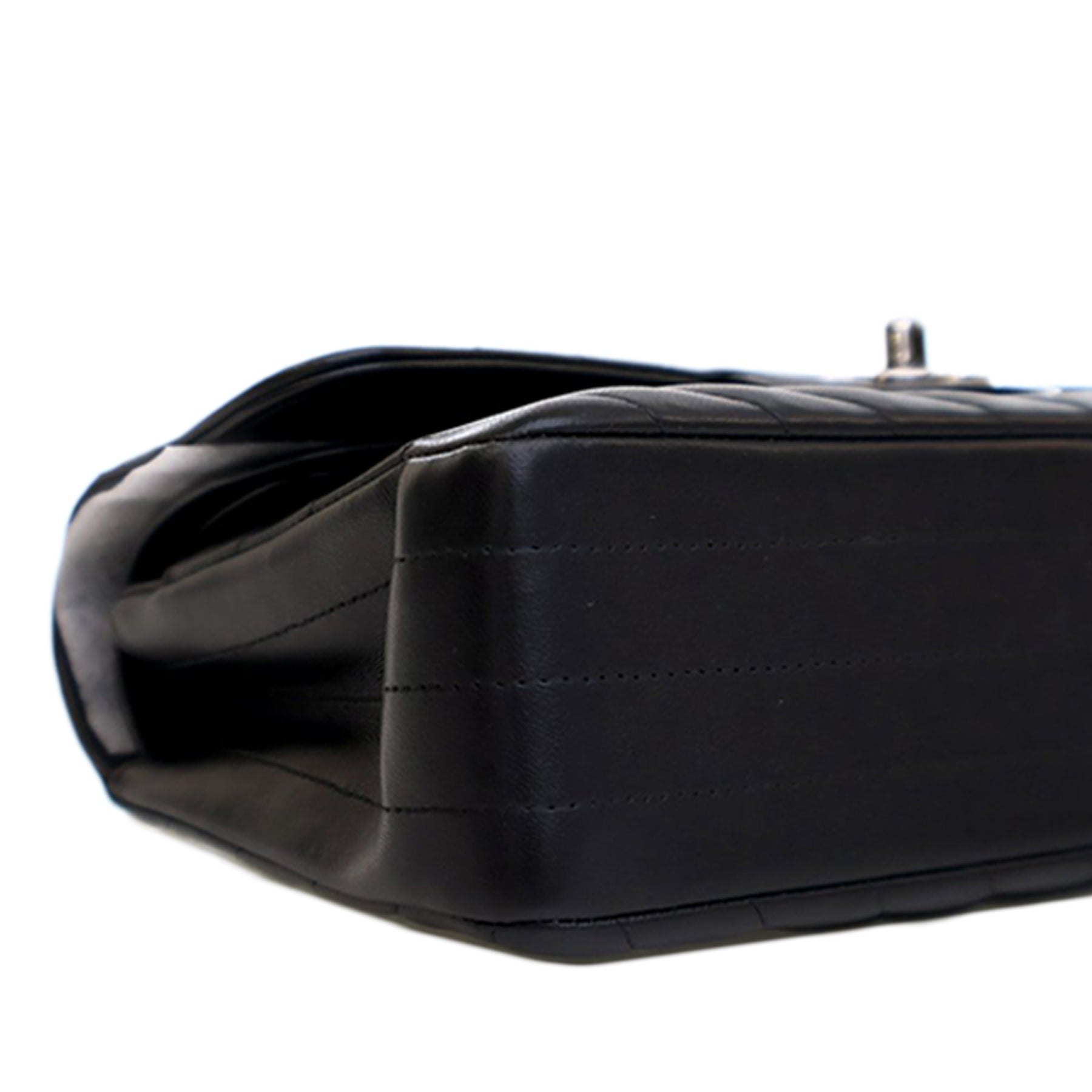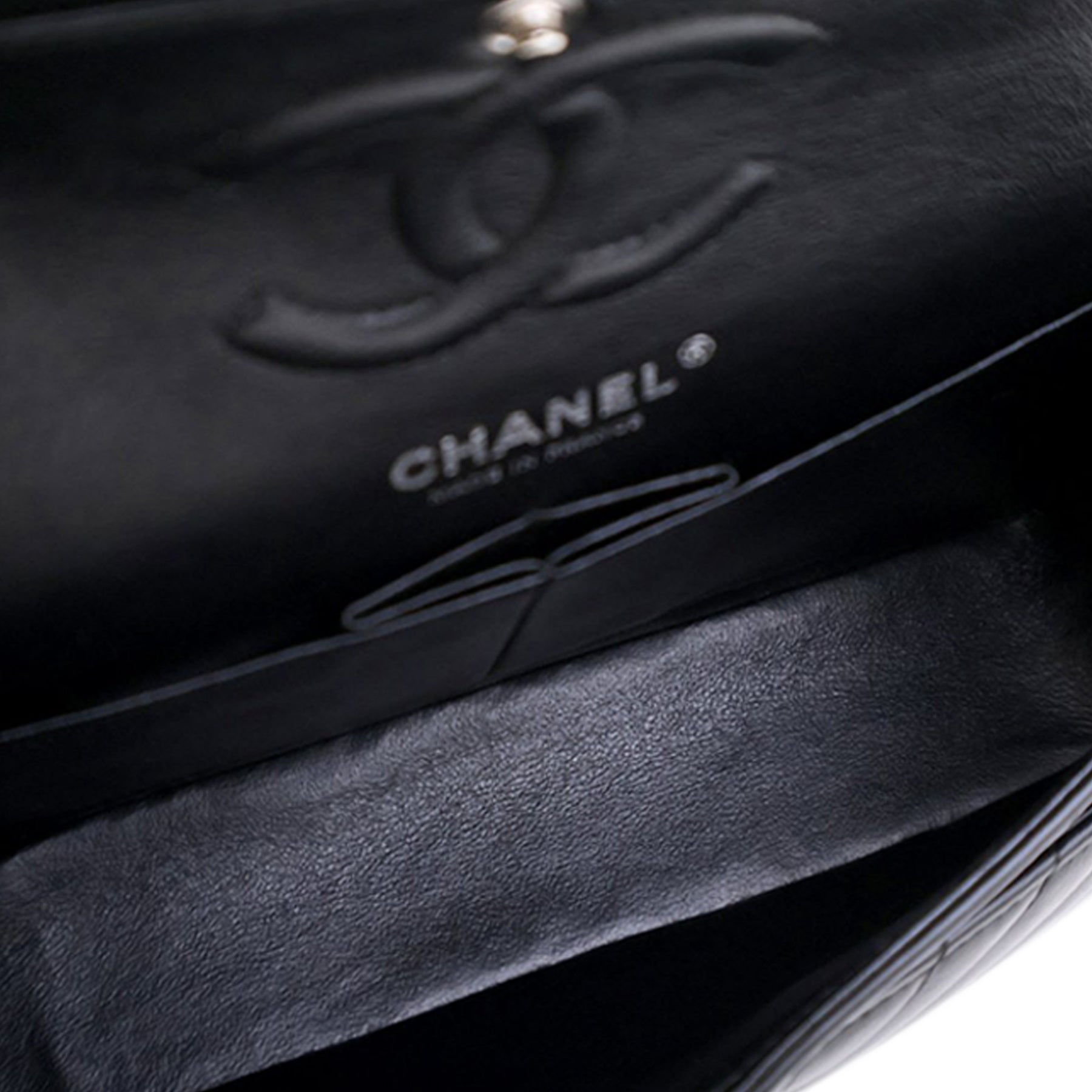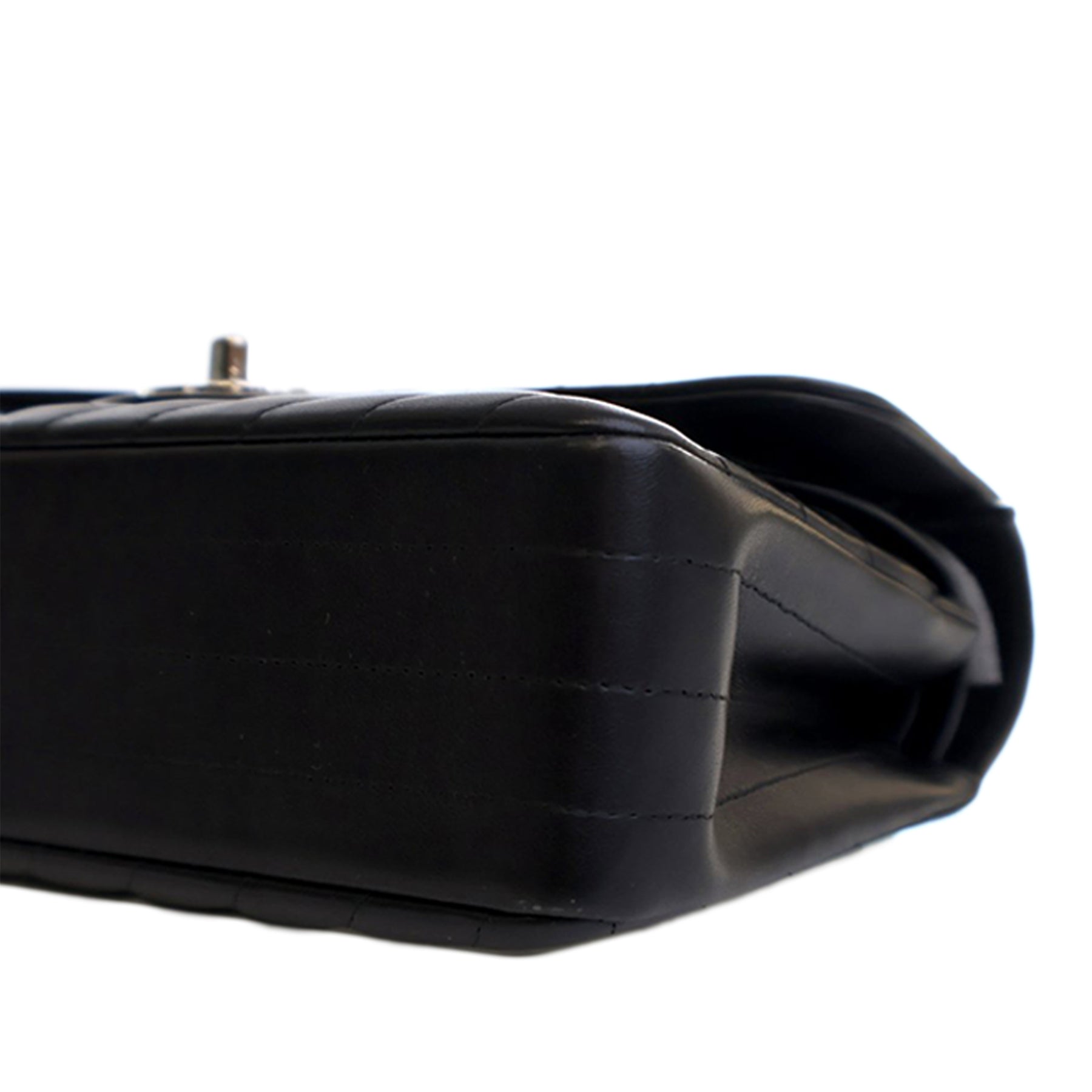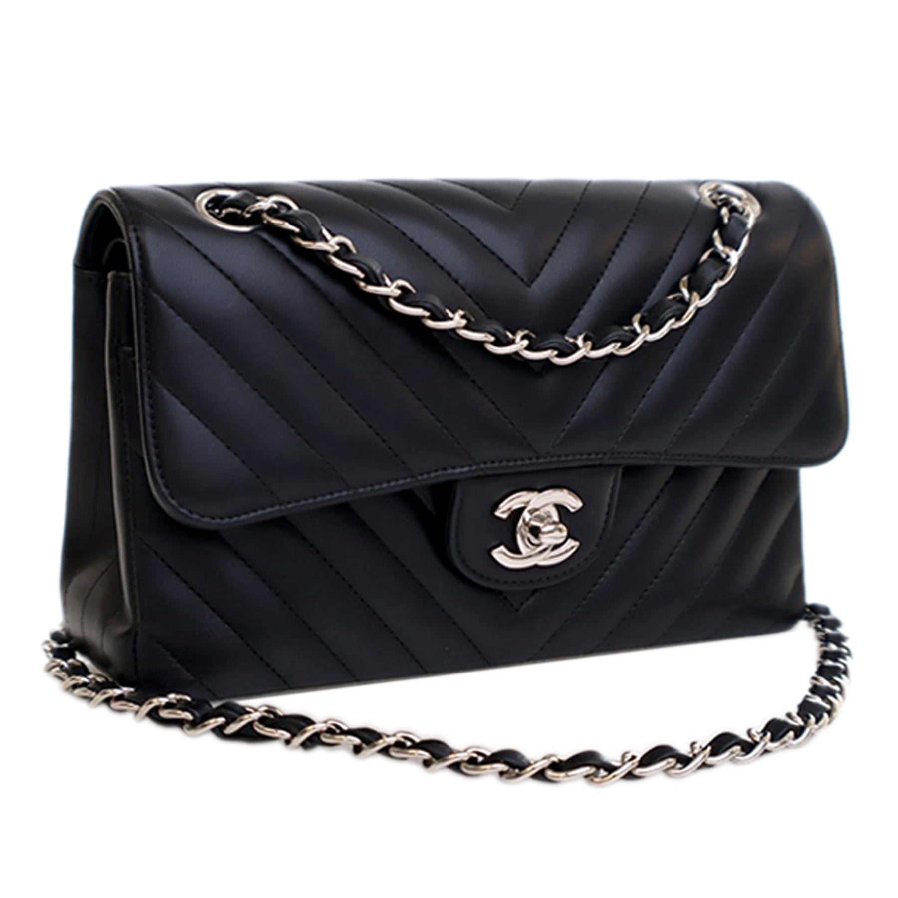 Ce sac bandoulière est confectionné en cuir matelassé à chevrons, avec des bandoulières en chaîne tressée de cuir, un double rabat avant orné de C entrelacés et d'une fermeture à tourniquet, une poche plaquée extérieure au dos, ainsi que des poches intérieures zippées et plaquées. Il est en excellent état.