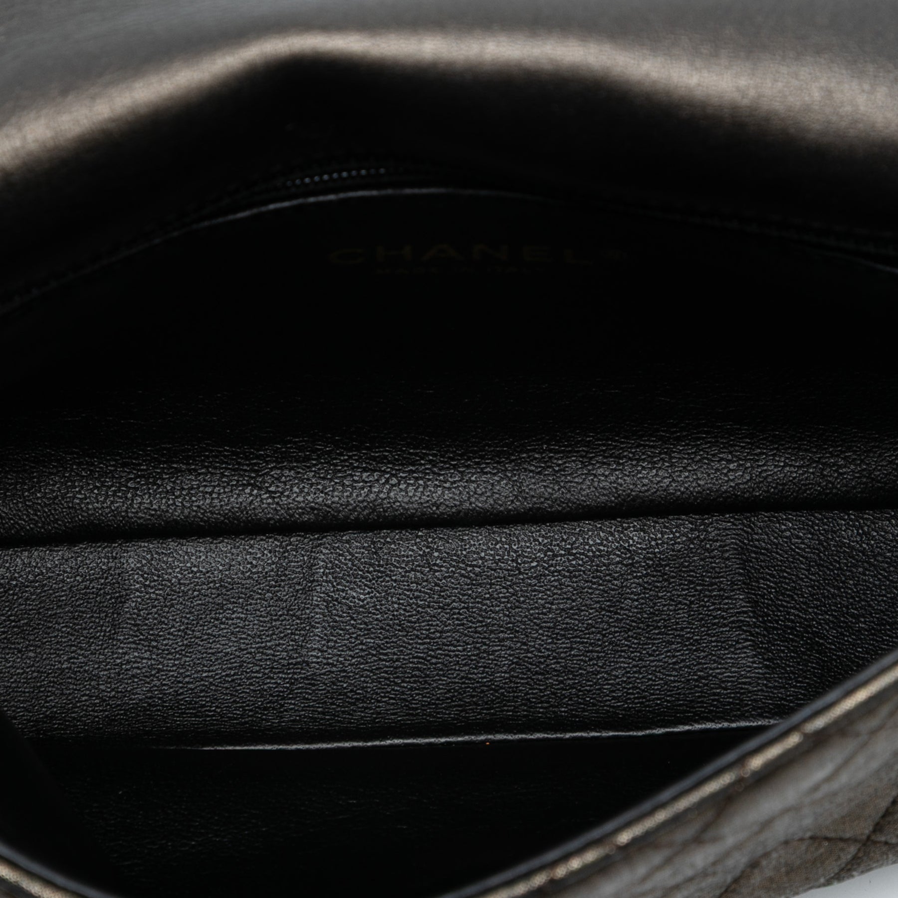 Ce sac à rabat est confectionné en tissu matelassé métallisé irisé, possède une bandoulière chaîne en tissu tissé, un logo CC orné de cristaux, une fermeture à rabat aimantée et une poche intérieure zippée. Il est en bon état.