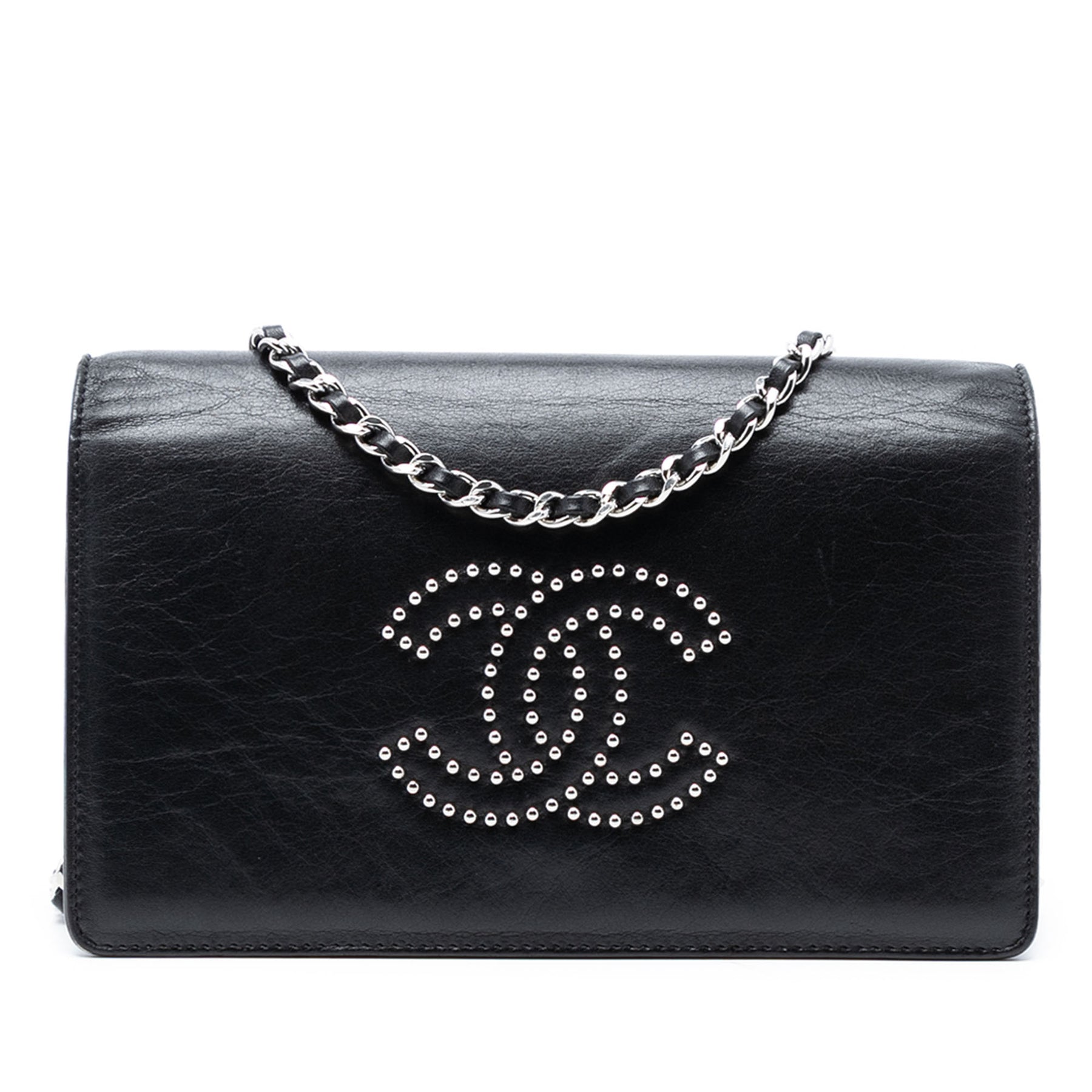 Ce portefeuille à chaîne est confectionné en cuir d'agneau clouté et possède une bandoulière en chaîne tressée de cuir, un rabat avant à fermeture magnétique, ainsi que des poches intérieures zippées et plaquées. Il est en bon état.