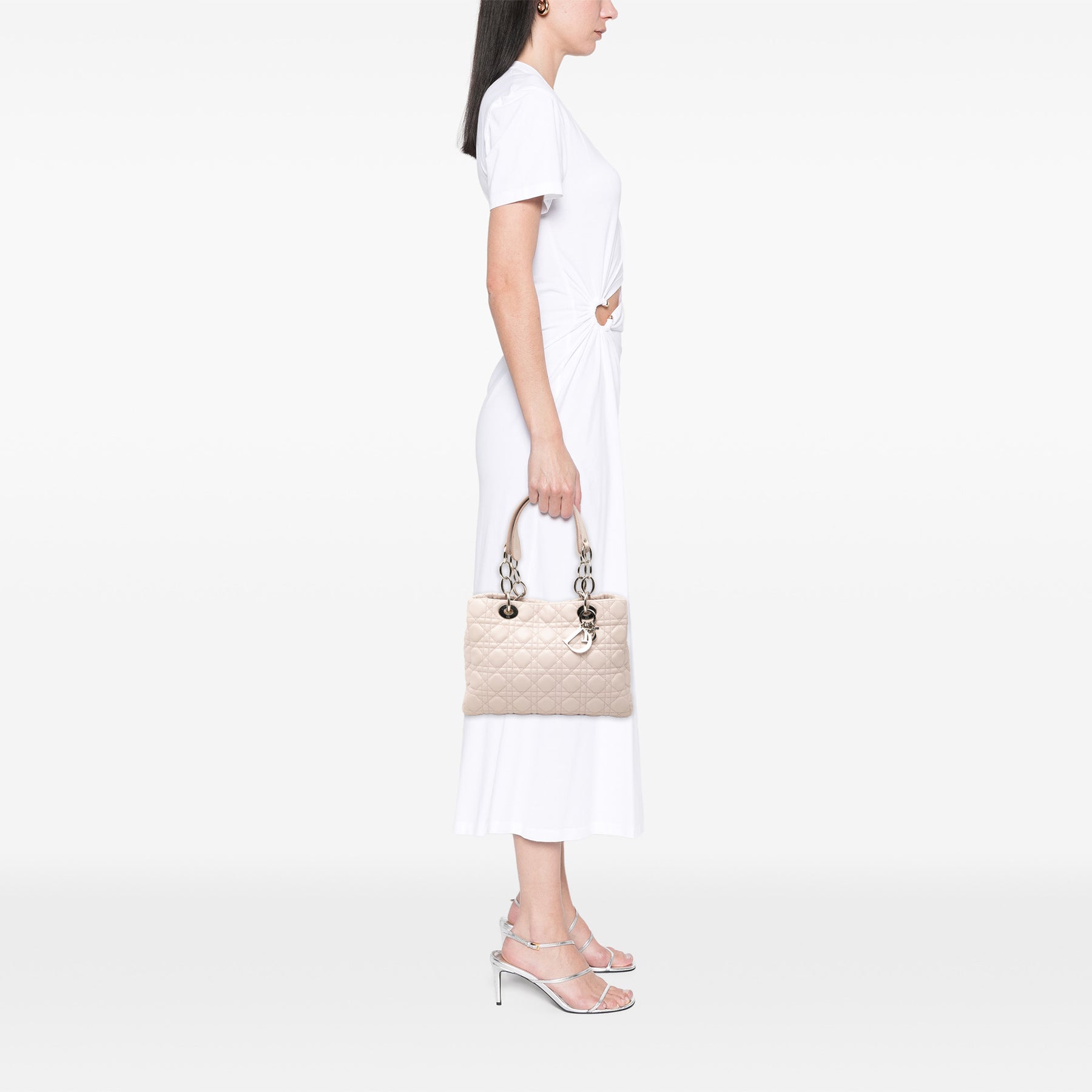 Le sac cabas Cannage Shopper est confectionné en cuir d'agneau matelassé et possède des bandoulières en chaîne et cuir, une ouverture sur le dessus avec fermeture magnétique, ainsi que des poches intérieures zippées et plaquées. Il est en bon état.