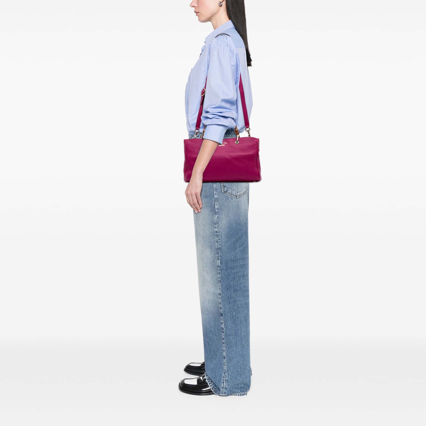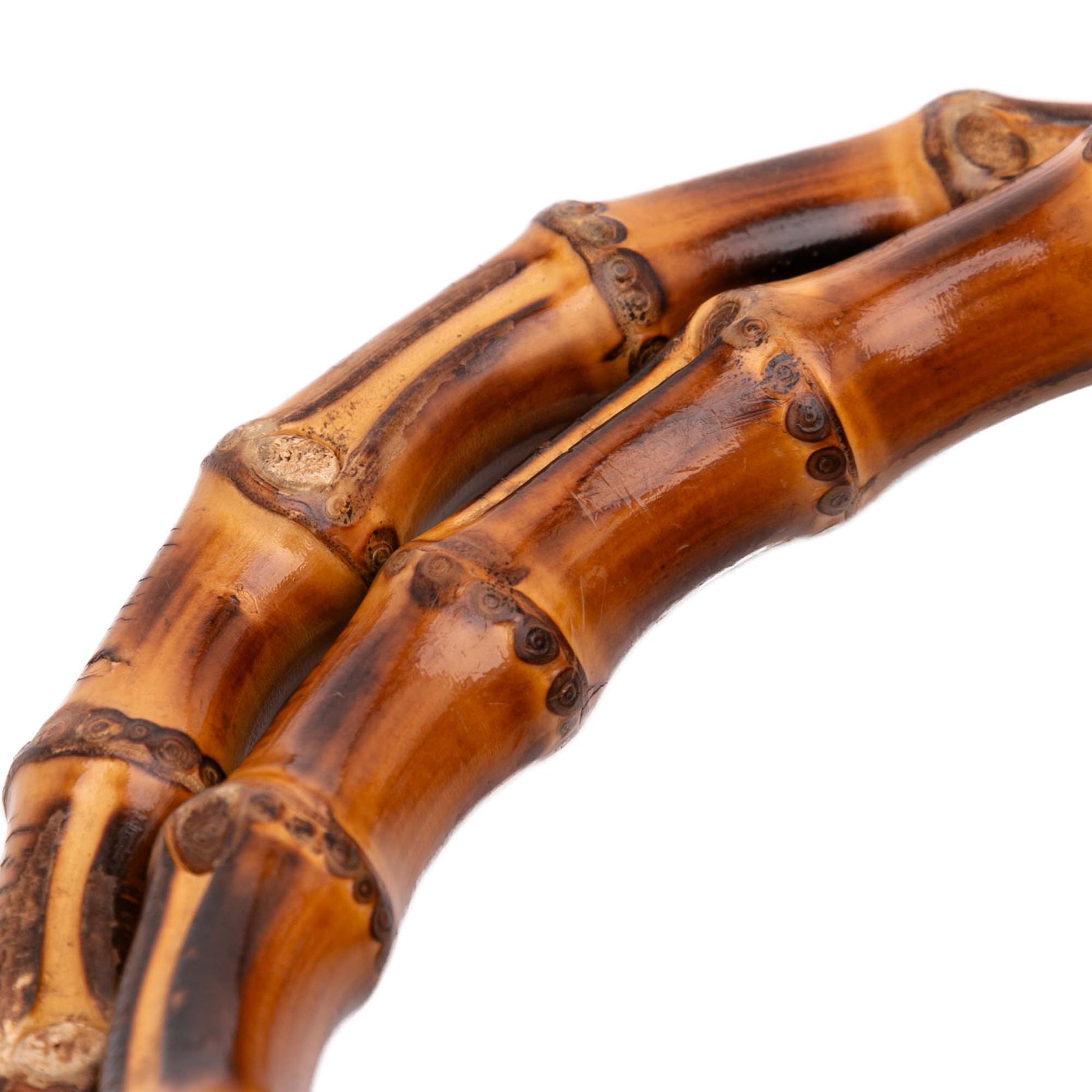 Le sac Bamboo Shopper est en cuir, avec des poignées en bambou, une bandoulière plate amovible en cuir, une ouverture sur le dessus avec fermeture magnétique, des compartiments intérieurs zippés et plaqués, ainsi que des poches intérieures zippées et plaquées. Il est en bon état.