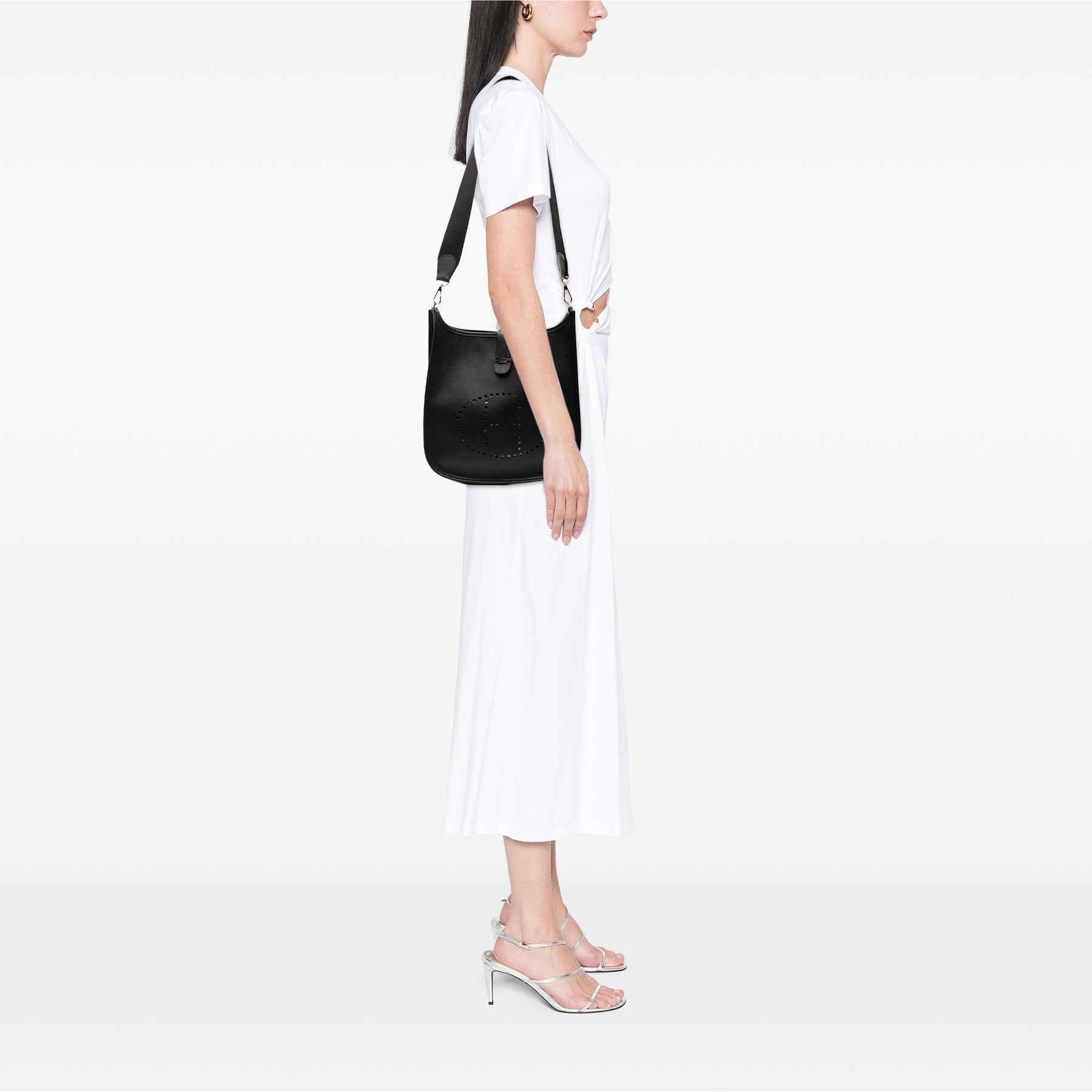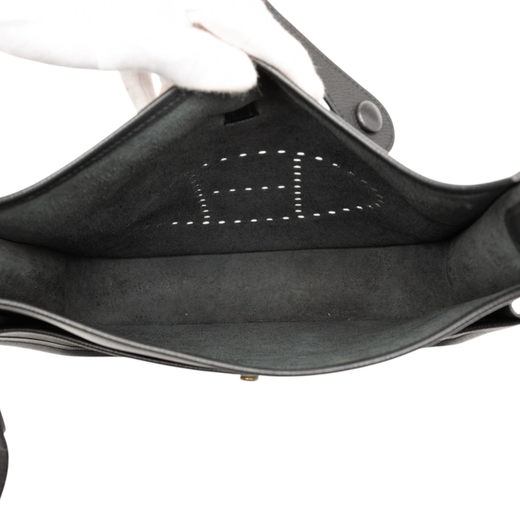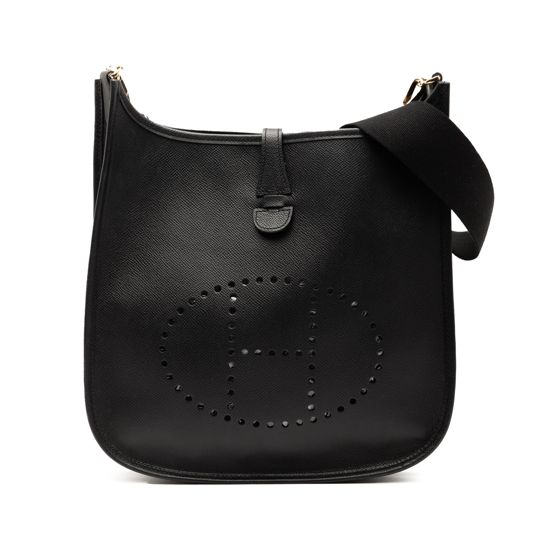 Ce sac Evelyne II est confectionné en cuir Epsom noir et possède une bandoulière plate, une poche plaquée extérieure au dos et une ouverture sur le dessus avec fermeture à bandoulière plate. Il est en bon état.