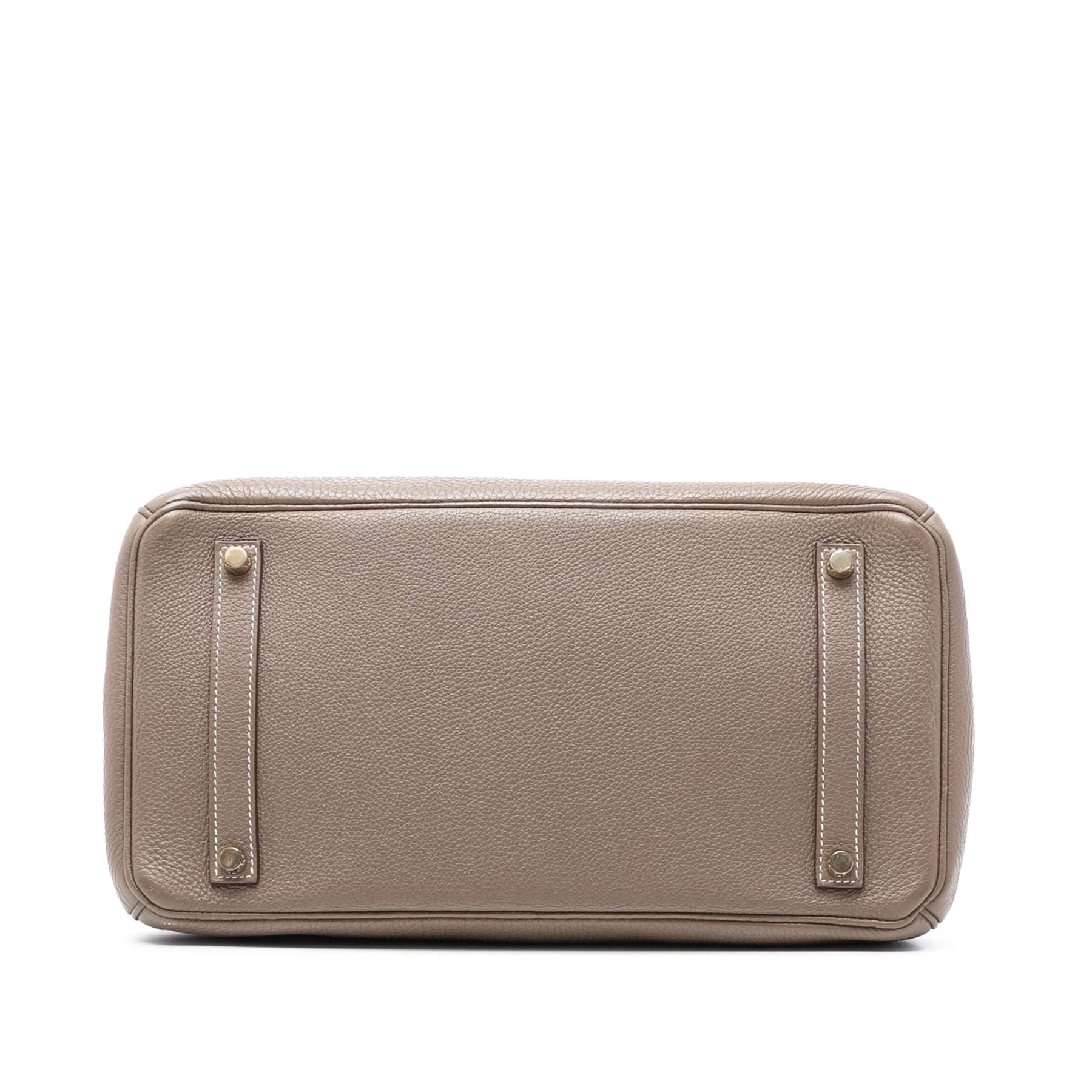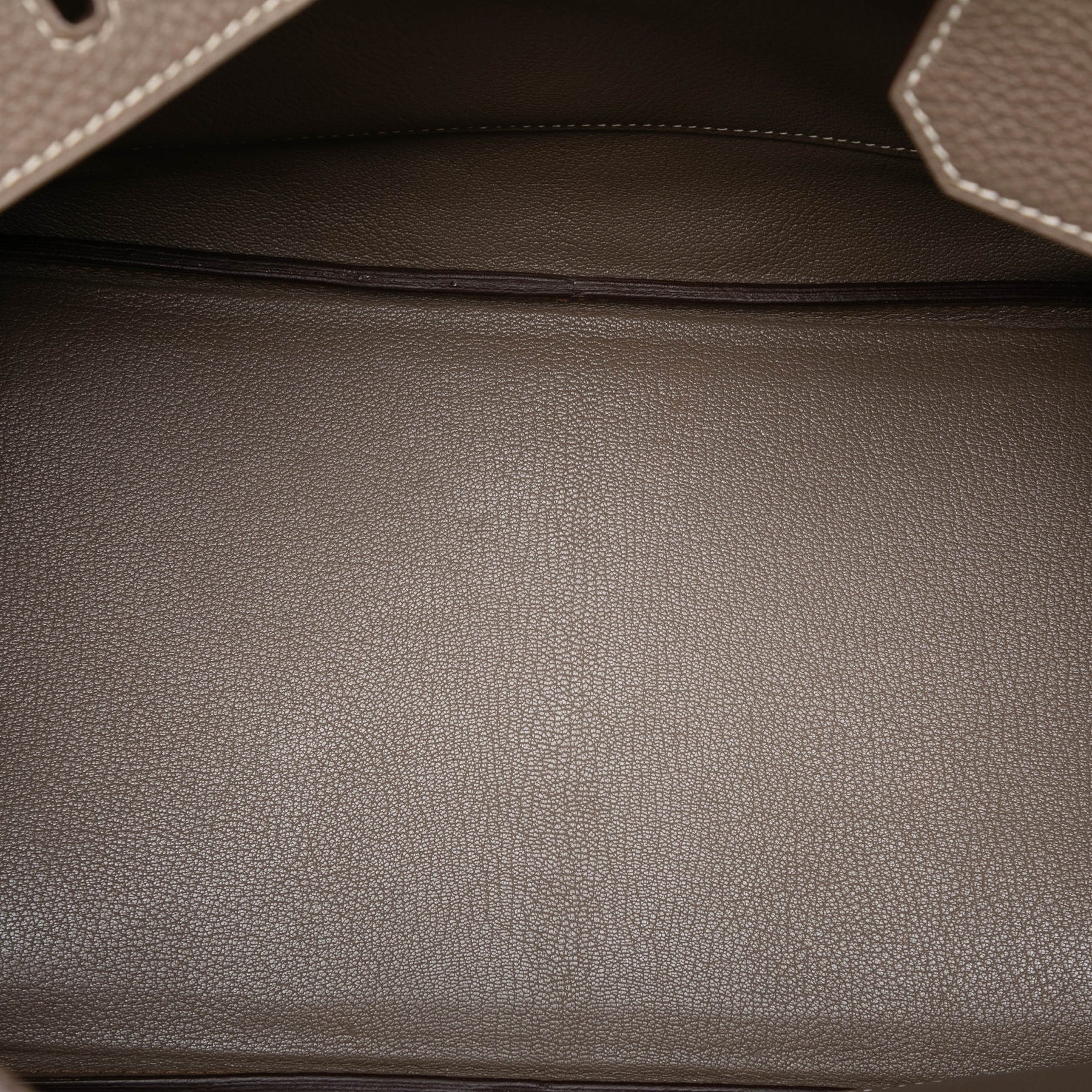 Ce Birkin 35 est confectionné en cuir Togo couleur Gris Asphalte, avec des anses roulées, un rabat avant à fermoir tourniquet et des poches intérieures plaquées et zippées. Les coins extérieurs ont été repeints. Son état est correct.