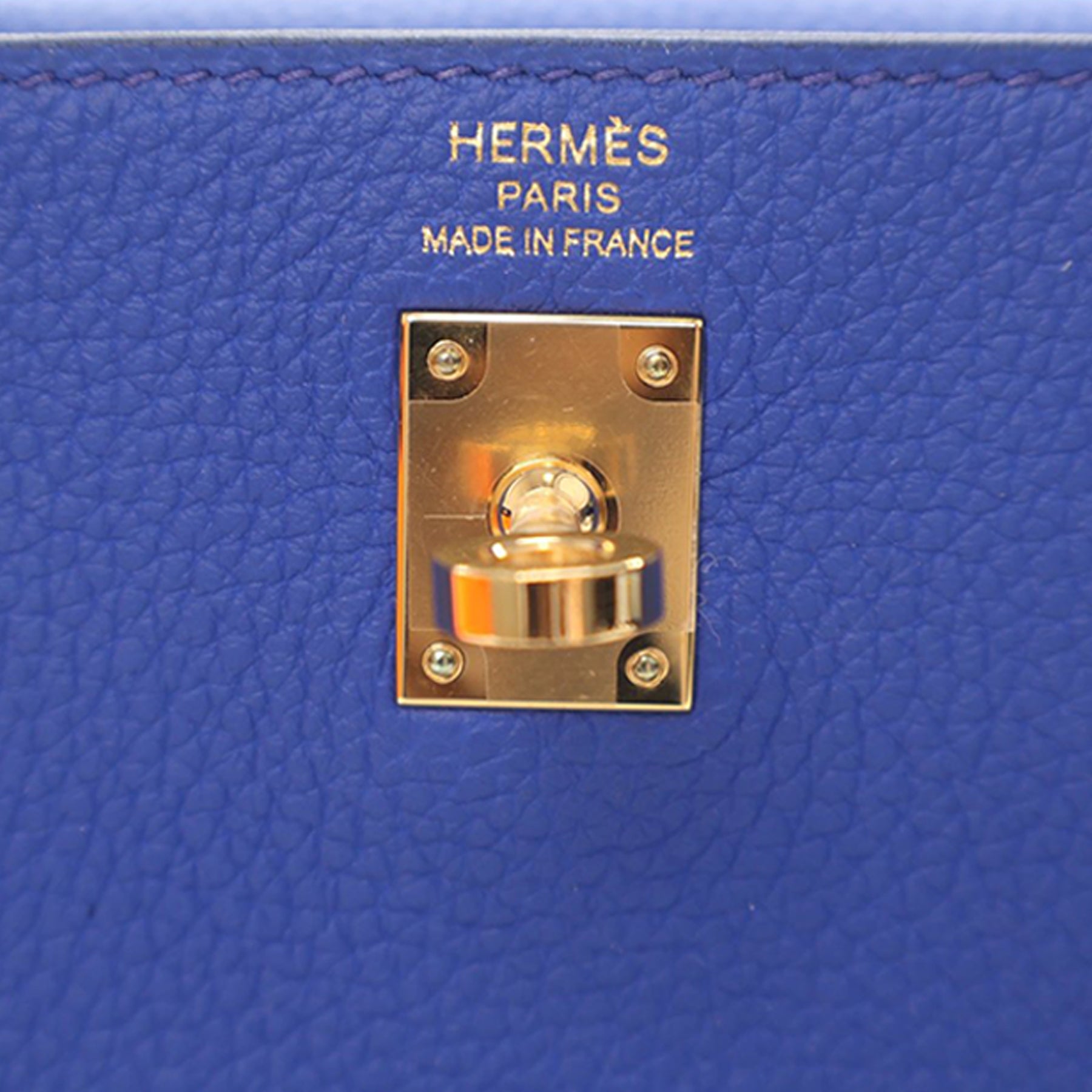 Ce sac Kelly 25 est confectionné en cuir Togo bleu royal et possède une poignée supérieure plate en cuir, une bandoulière plate amovible, un rabat avant avec fermeture à tourniquet, ainsi que des poches intérieures zippées et plaquées. Il est en parfait état.
