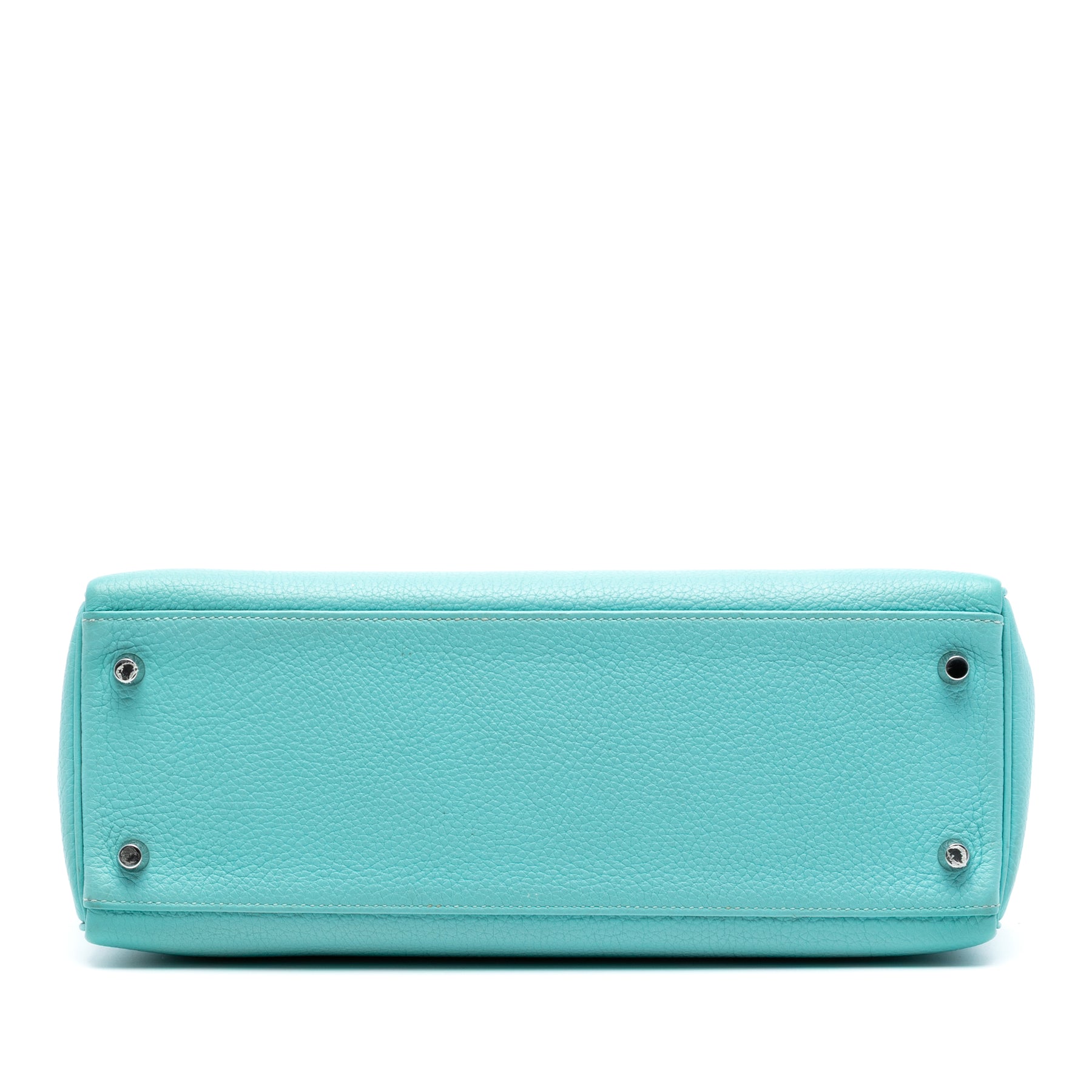 Ce sac Kelly 32 est confectionné en cuir Togo couleur Bleu Atoll et possède une poignée plate, une bandoulière amovible, un rabat avec fermoir pivotant, ainsi que des poches intérieures zippées et plaquées. Il est en bon état.