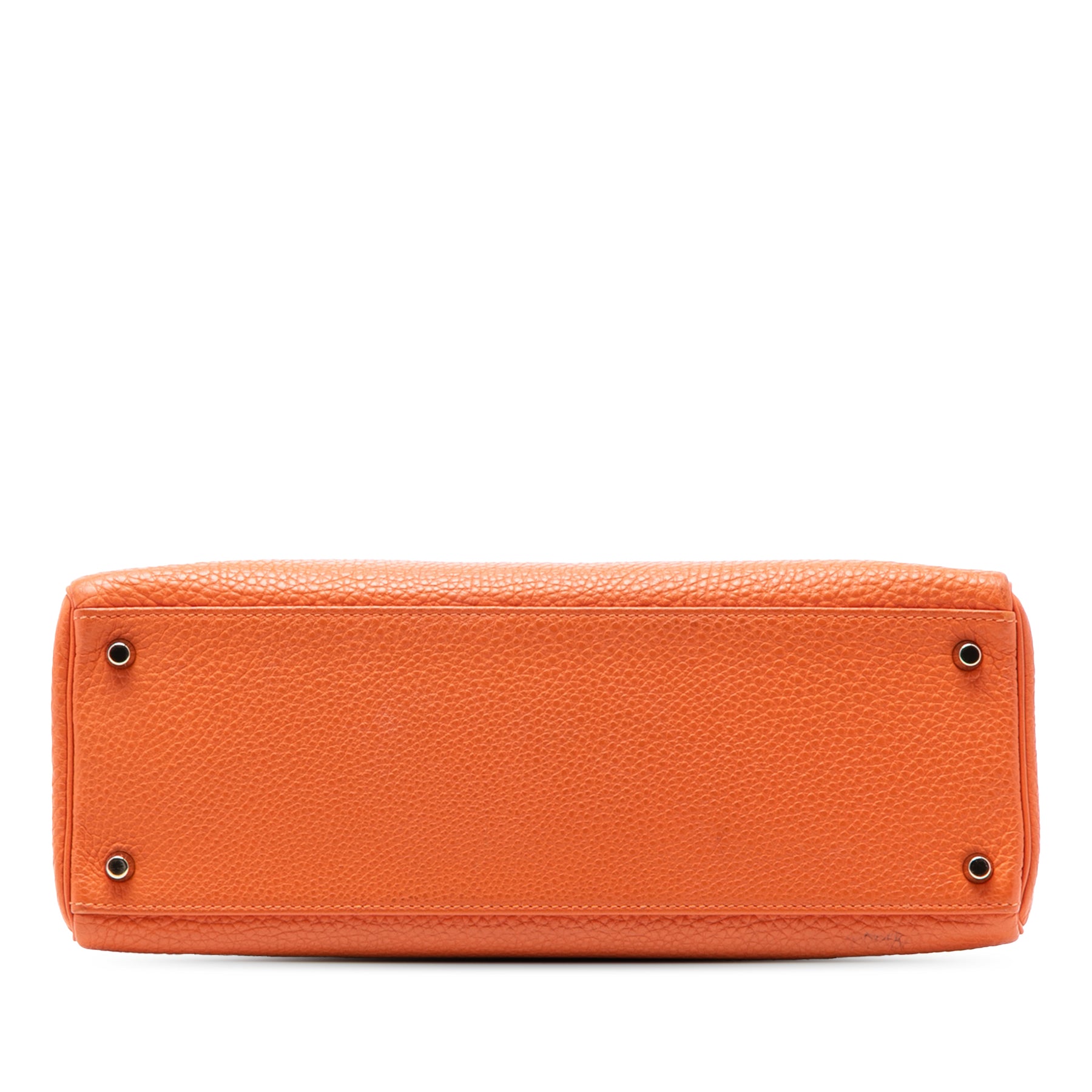 Ce sac Kelly 35 est confectionné en cuir Togo orange et possède une poignée plate en cuir, une bandoulière plate amovible, un rabat avec fermoir tourniquet, des finitions dorées, ainsi que des poches intérieures zippées et plaquées. Il est en excellent état.