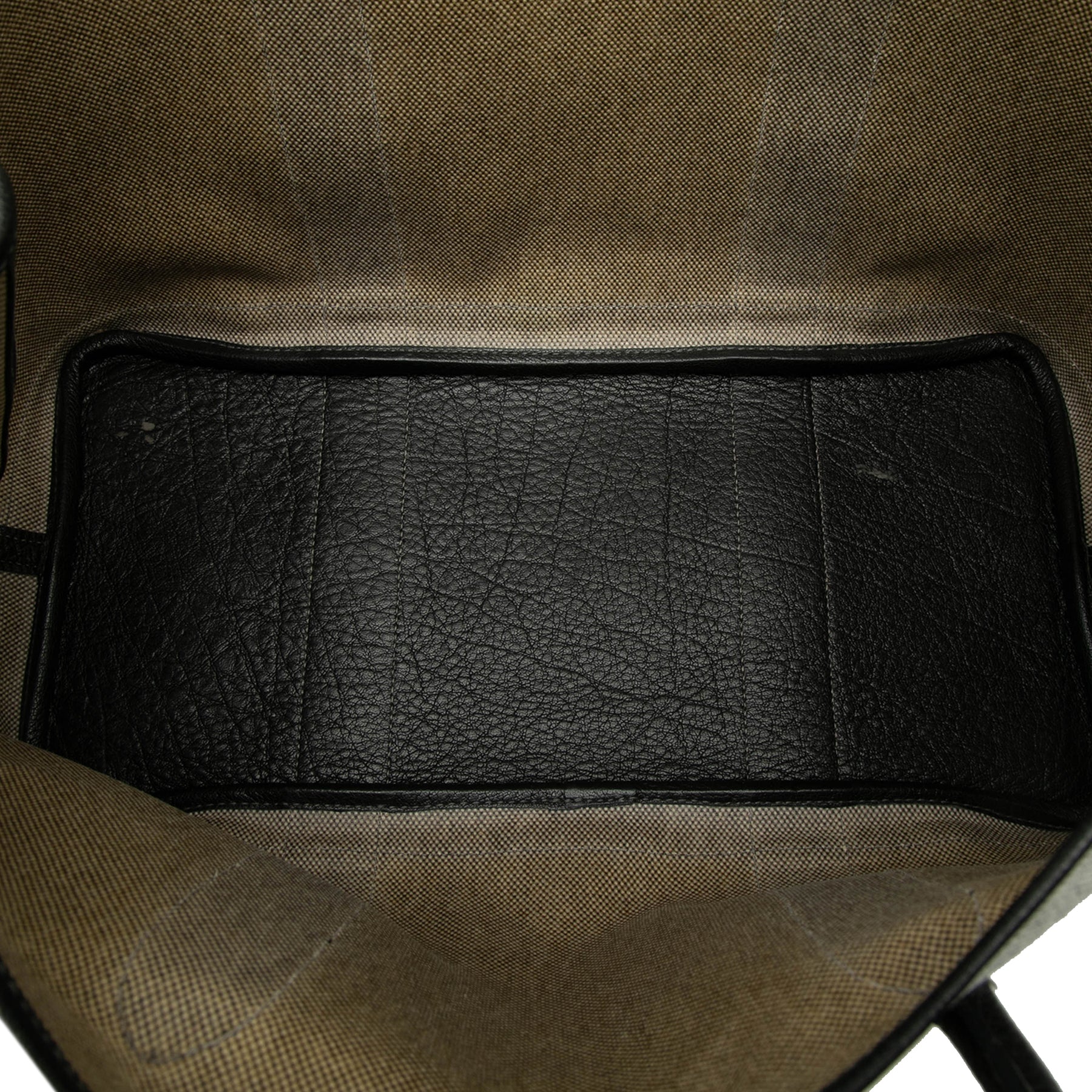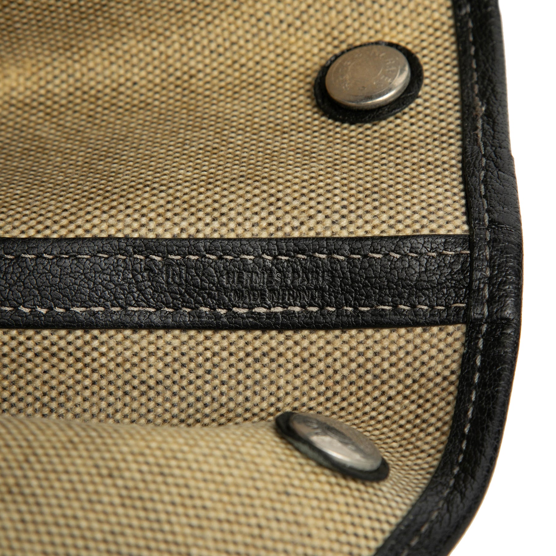 Le sac Garden Party est confectionné en toile avec des détails en cuir texturé, des anses roulées en cuir et une fermeture à bouton-pression sur le dessus. Il est en bon état.