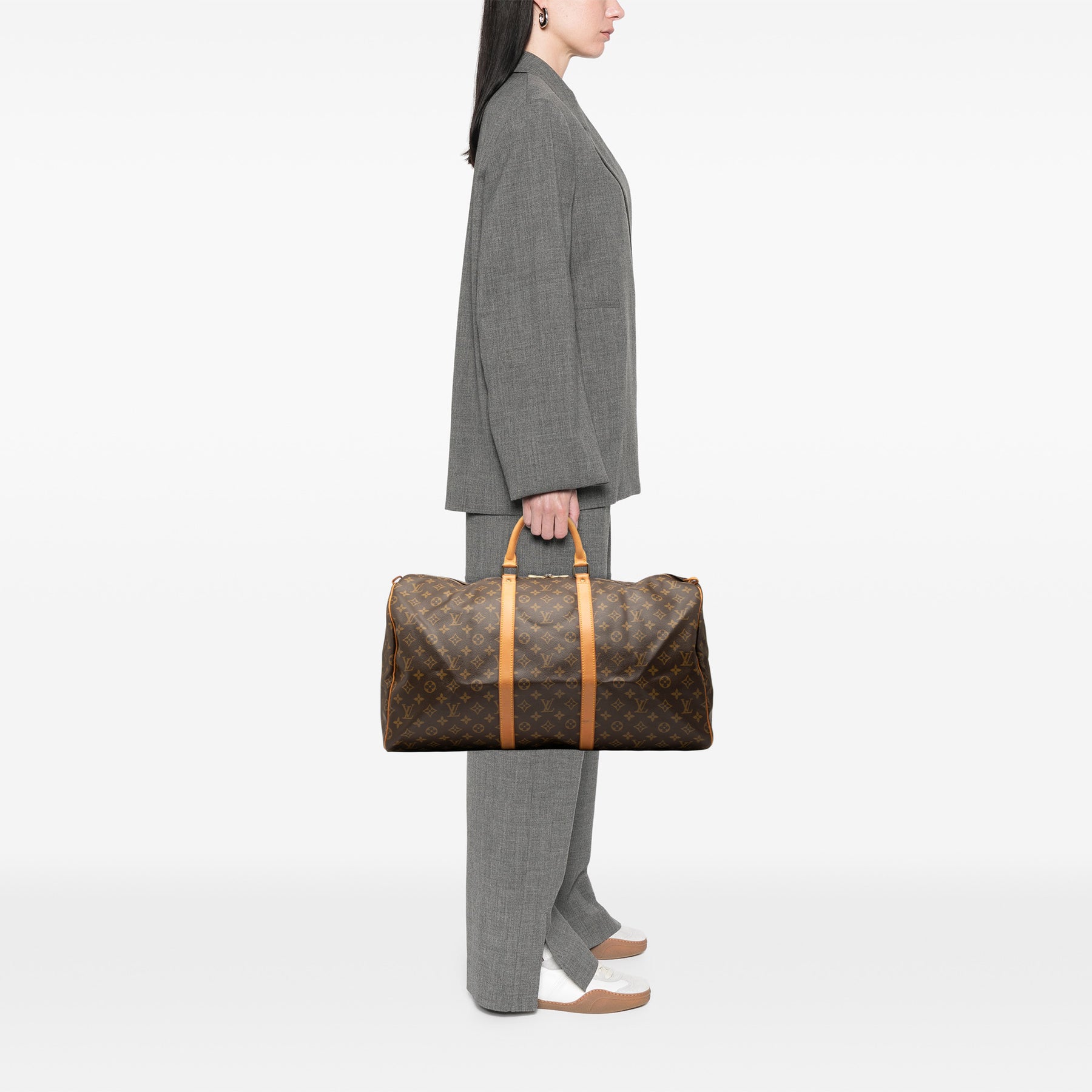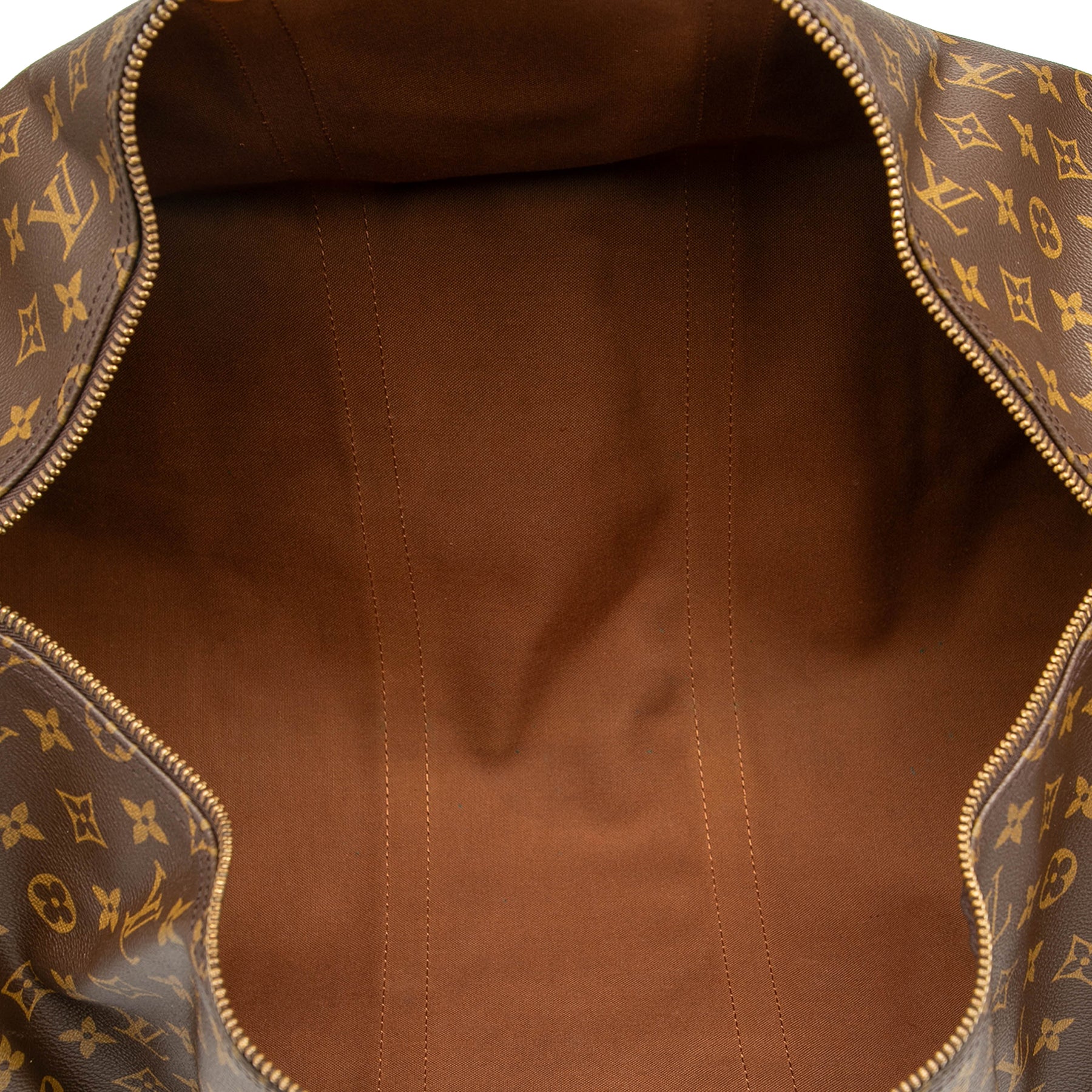 Le sac Keepall 55 est confectionné en toile monogrammée avec des finitions en cuir vachetta, des poignées roulées en cuir vachetta et une fermeture zippée sur le dessus. Il est en bon état.