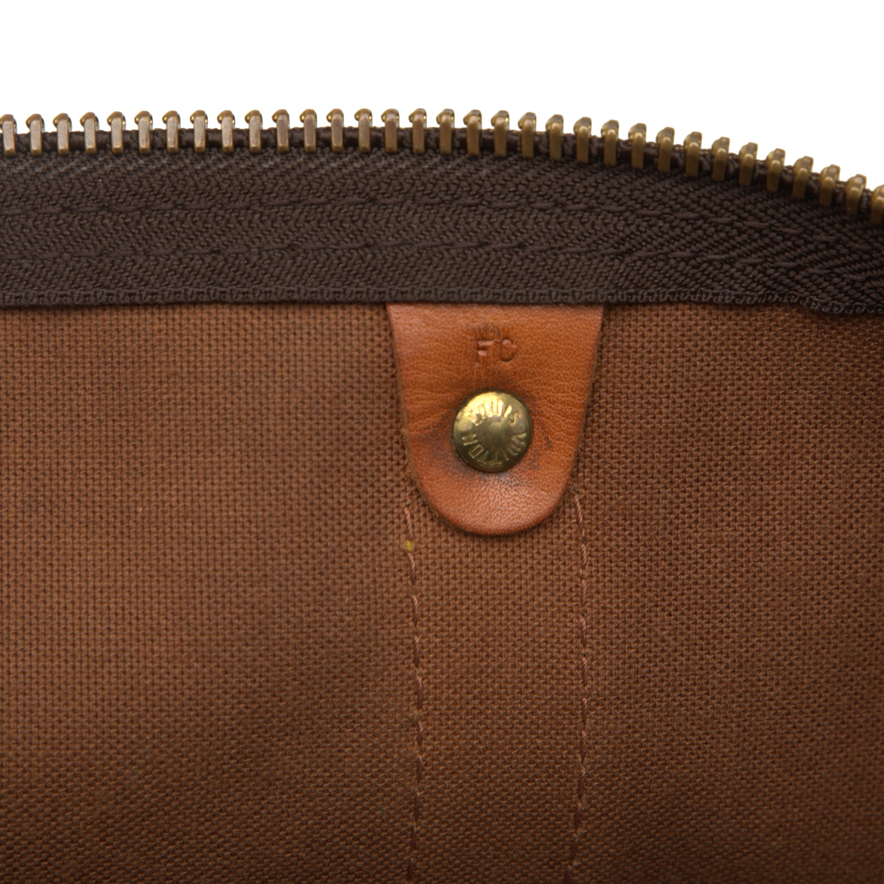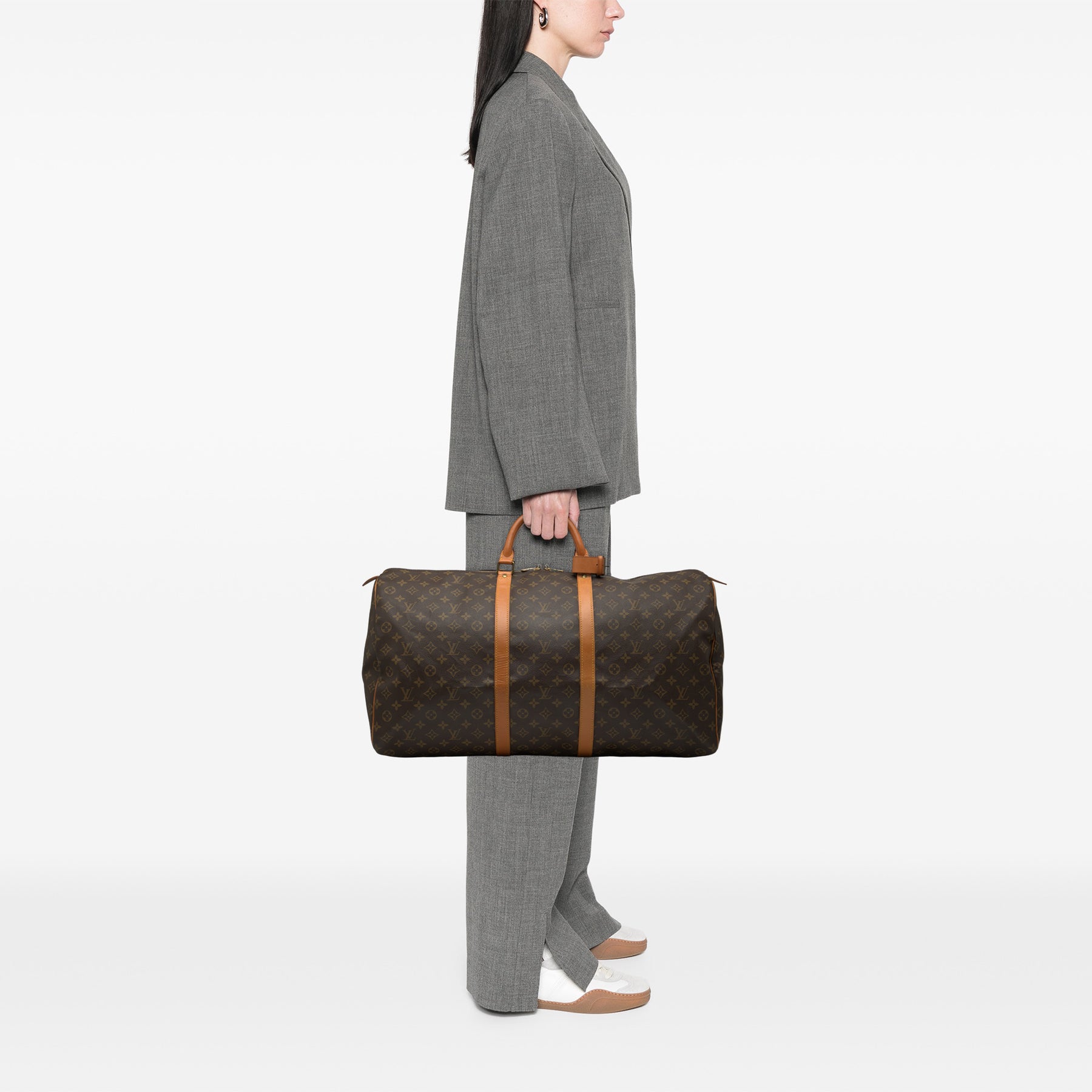 Le sac Keepall 60 est confectionné en toile monogrammée avec des finitions en cuir vachetta, des poignées roulées en cuir vachetta et une fermeture zippée sur le dessus. Il est en bon état.