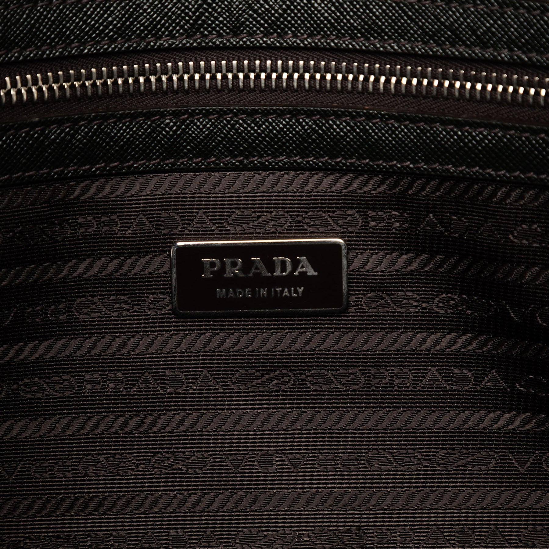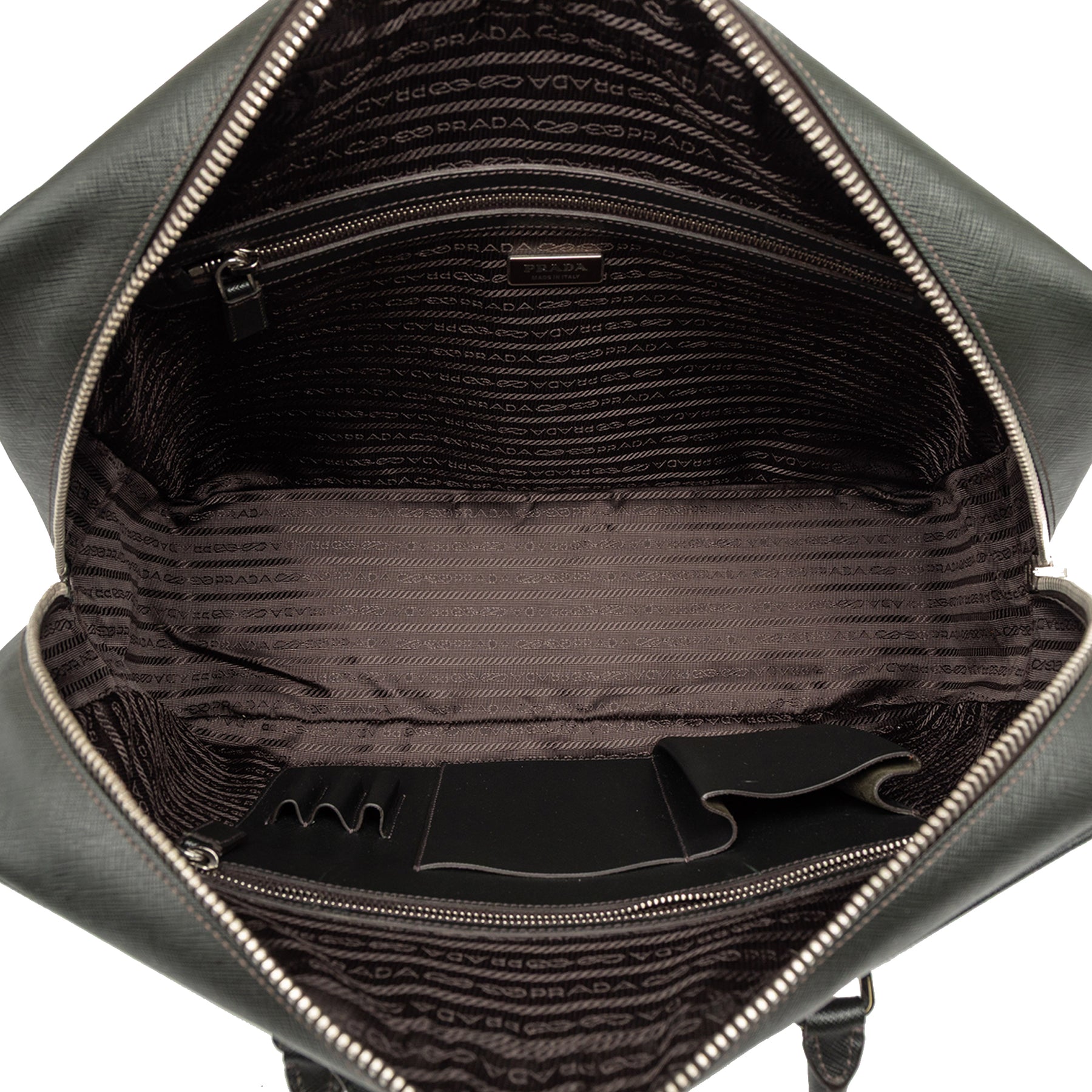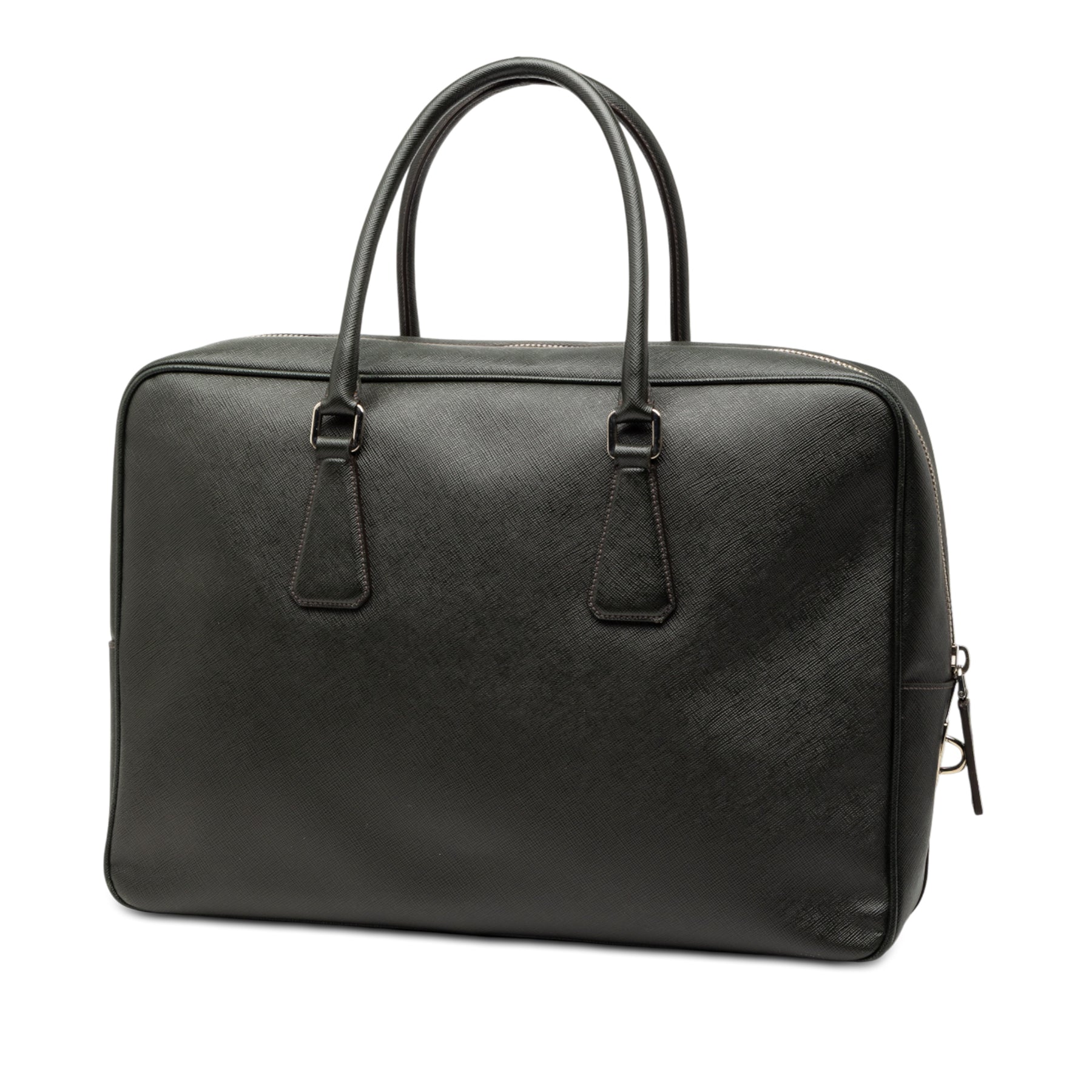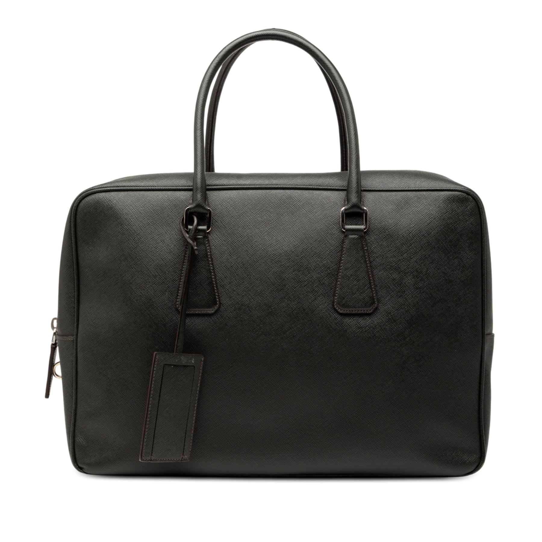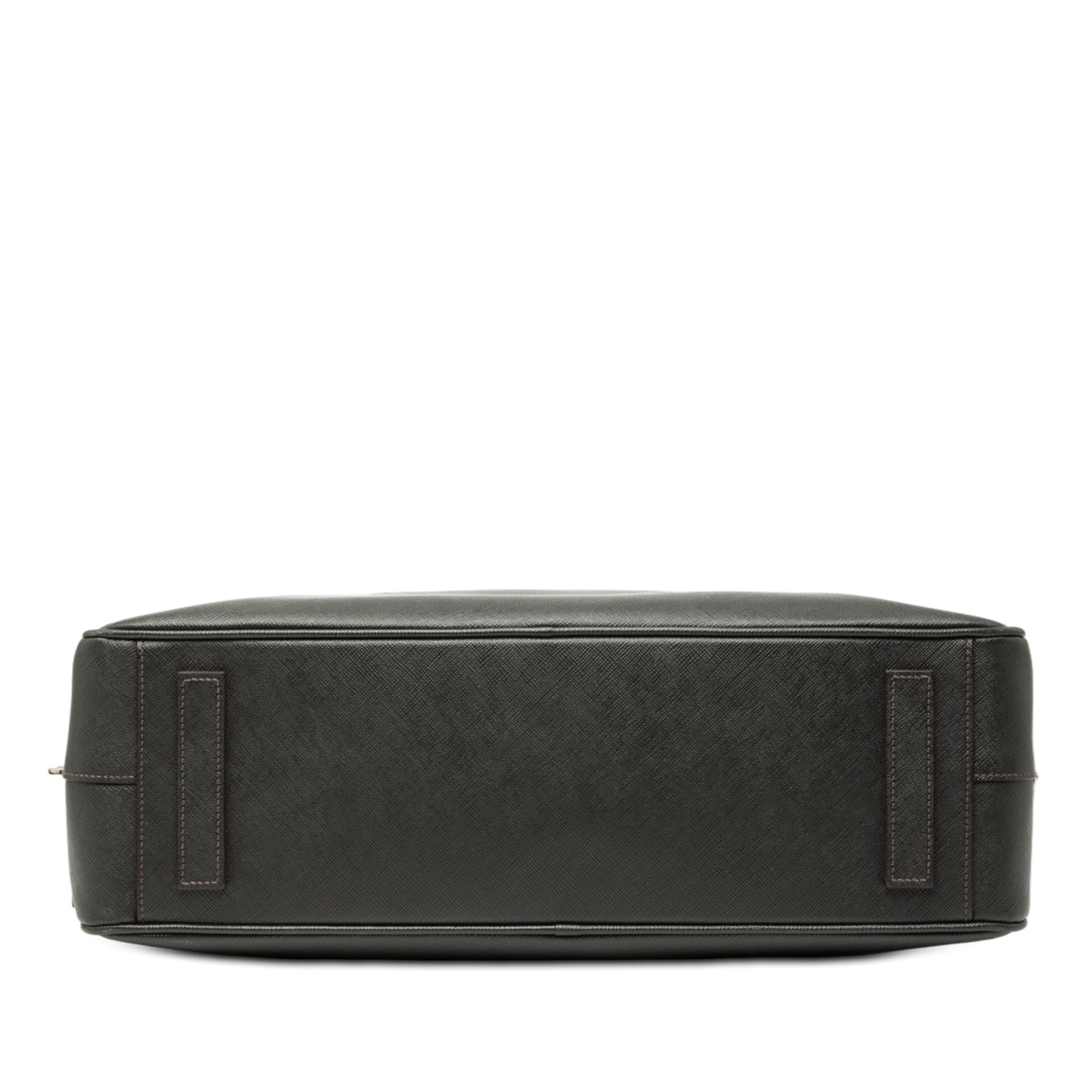 Ce sac d'affaires est en cuir saffiano, possède des poignées roulées, une fermeture zippée sur le dessus et des poches intérieures zippées et plaquées. Il est en excellent état.
