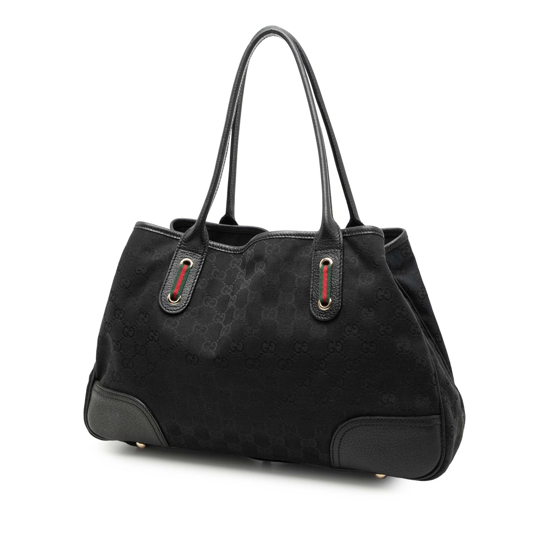 Le sac cabas Princy est en toile avec des finitions en cuir, des anses roulées en cuir, une ouverture sur le dessus et des poches intérieures zippées et plaquées. Il est en bon état.