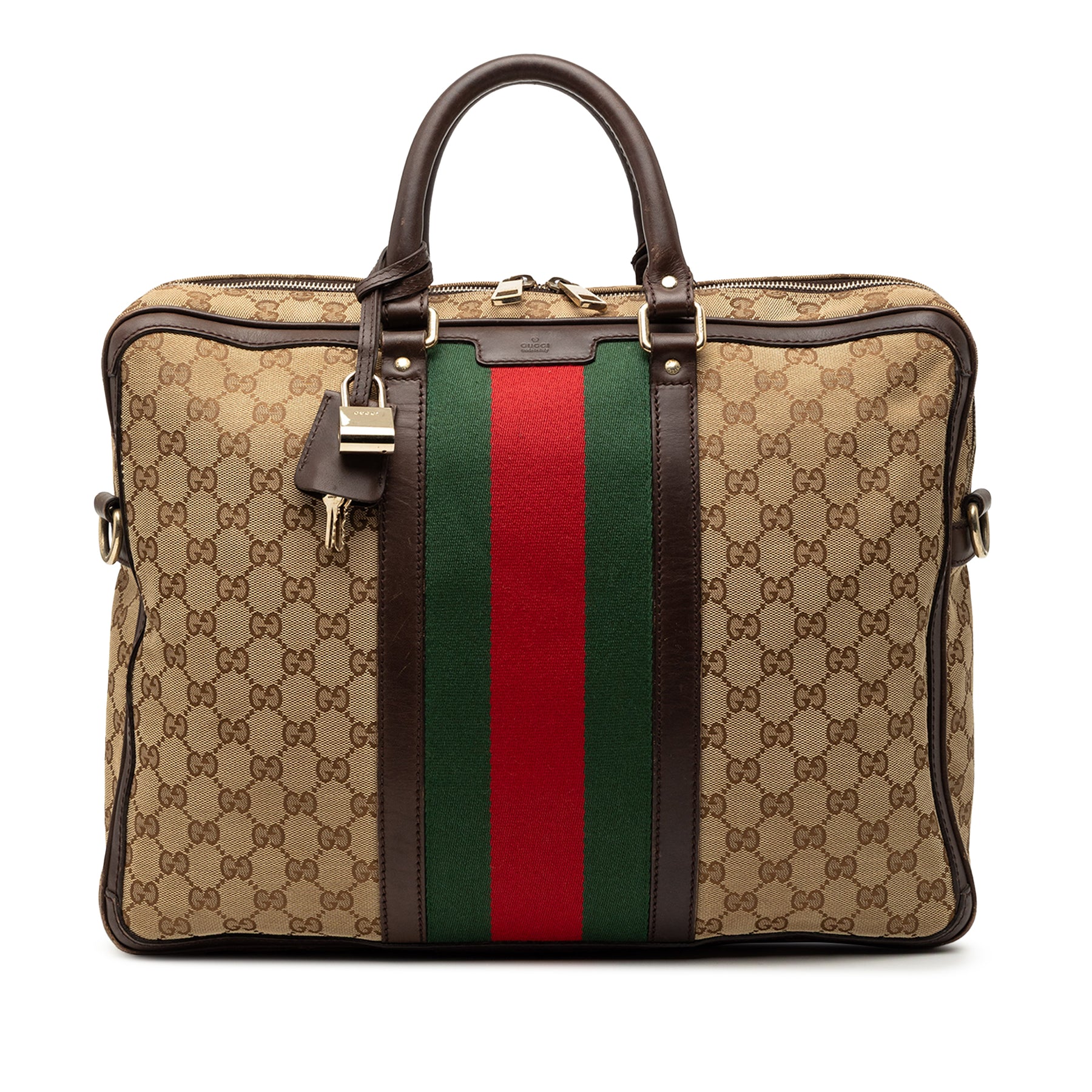 Cette mallette en toile est ornée de finitions en cuir et de détails en maille, de poignées supérieures en cuir roulé, d'une fermeture éclair sur le dessus, ainsi que d'un compartiment intérieur et de poches plaquées. Son état est correct.