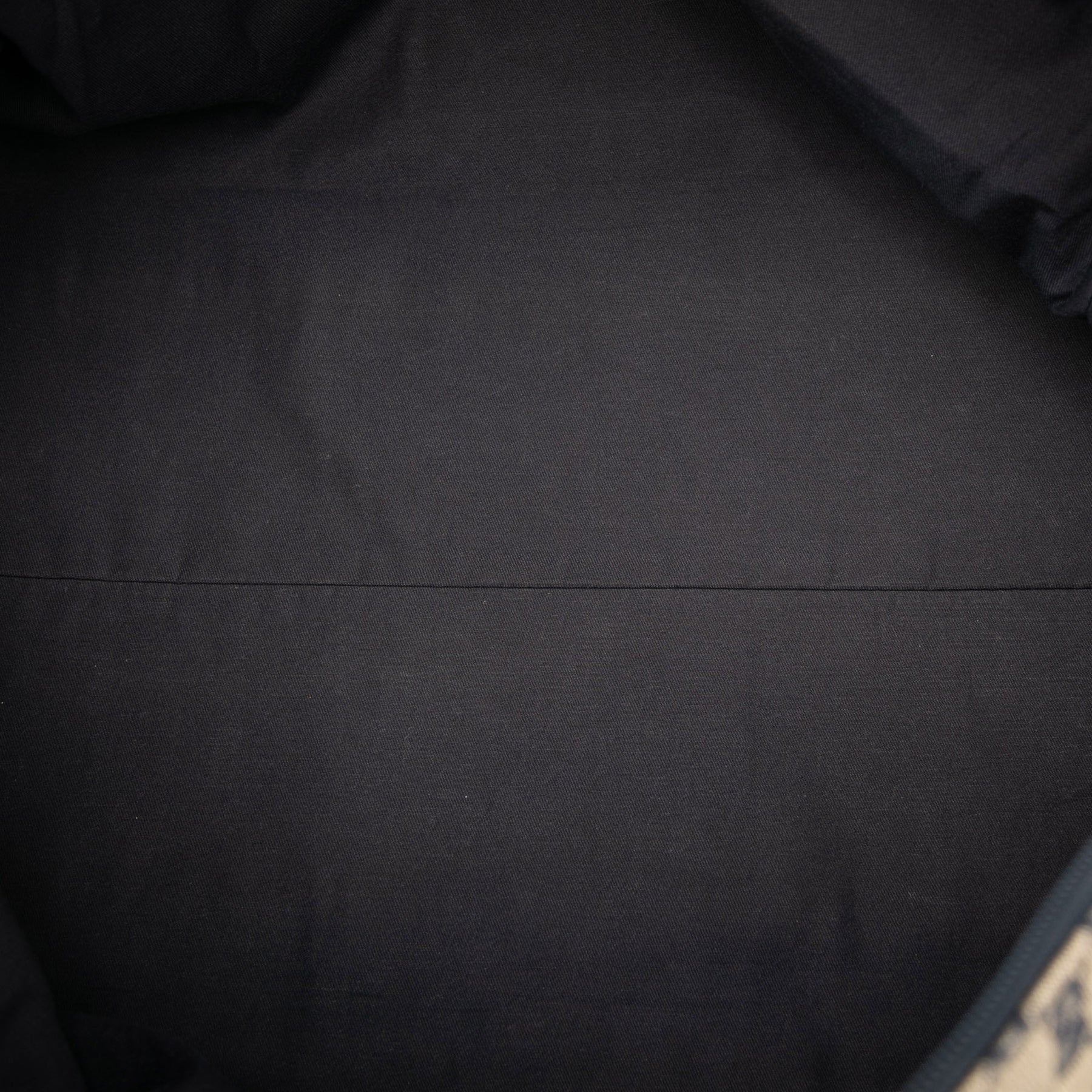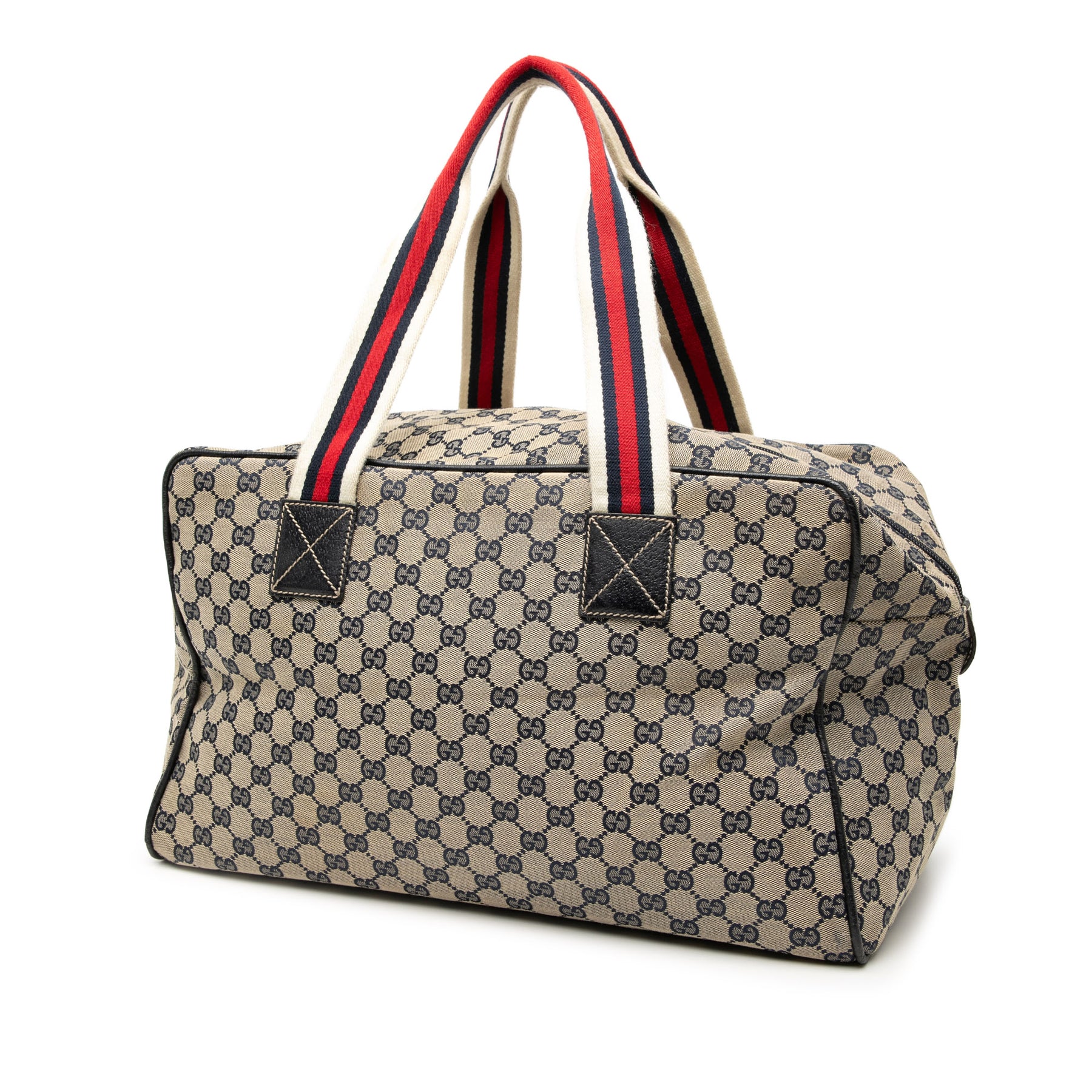 Ce sac de voyage est en toile avec des finitions en cuir, des anses plates en toile, une fermeture éclair sur le dessus et une poche intérieure zippée. Il est en bon état.