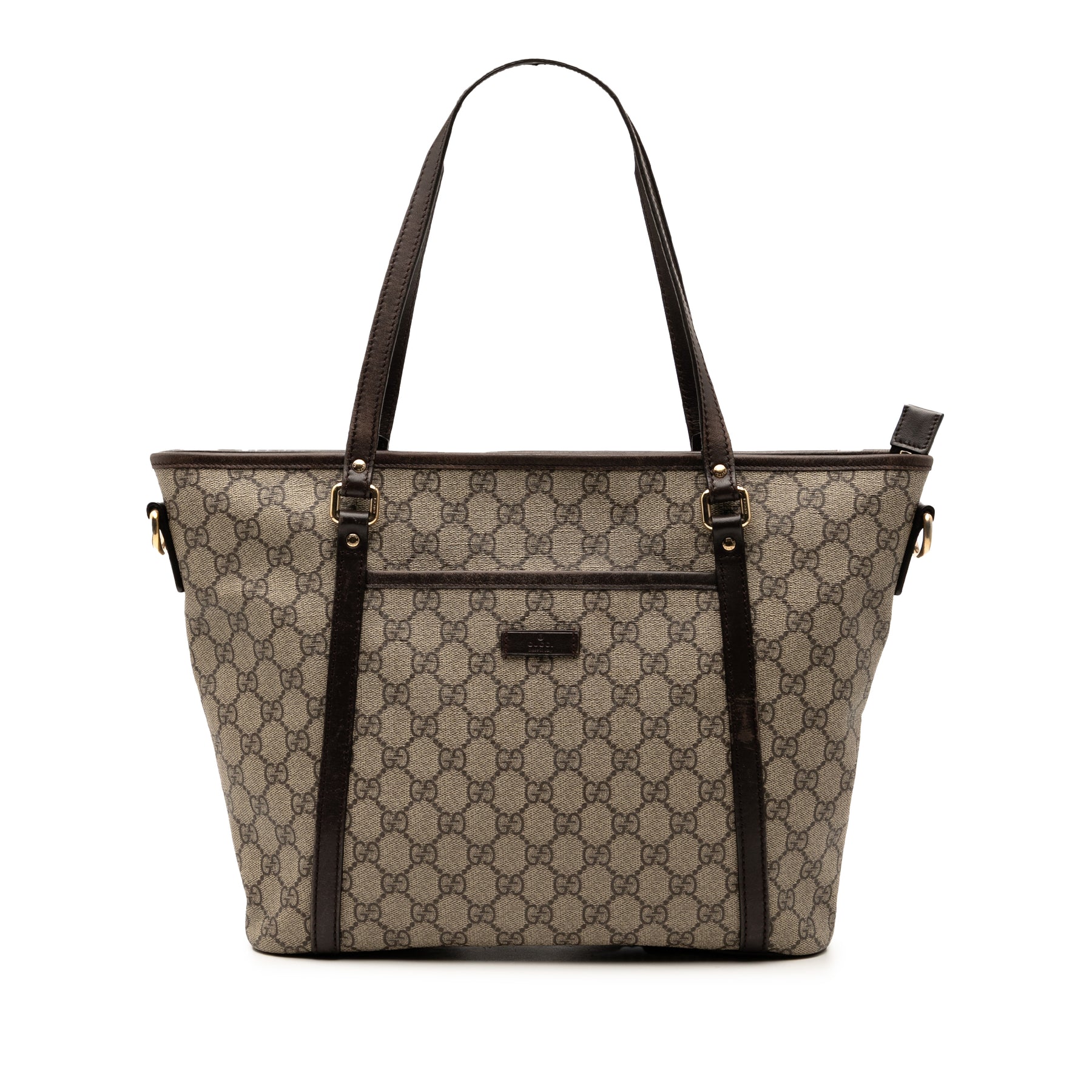 Ce sac à main est confectionné en toile enduite avec des finitions en cuir, des anses plates en cuir, une bandoulière amovible en cuir, une fermeture zippée sur le dessus, une poche extérieure plaquée et des poches intérieures zippées et plaquées. Il est en bon état.