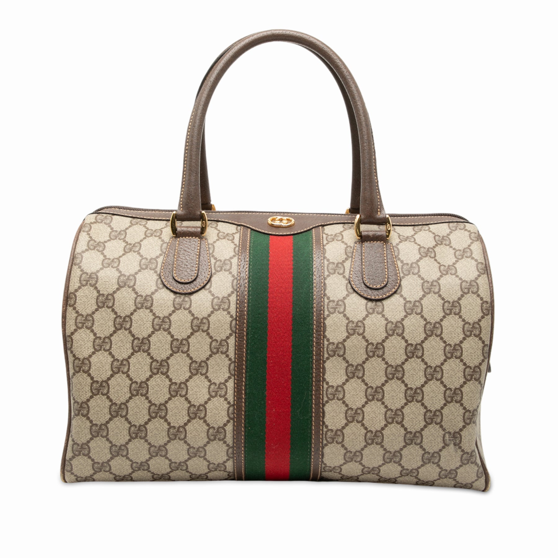 Ce sac Boston est confectionné en toile enduite avec des finitions en cuir et des détails en toile, des anses roulées en cuir, une fermeture zippée sur le dessus et une poche intérieure zippée. Il est en bon état.
