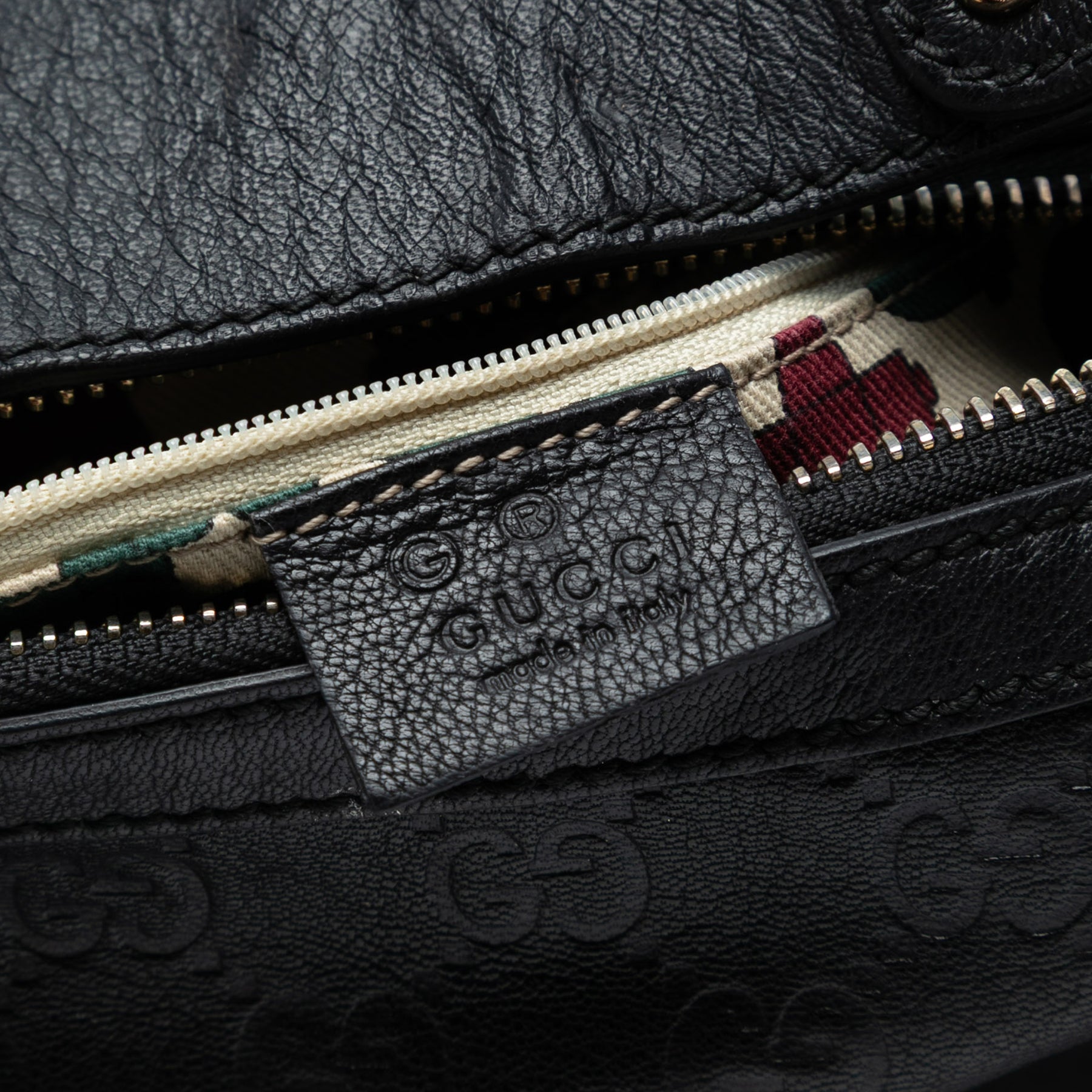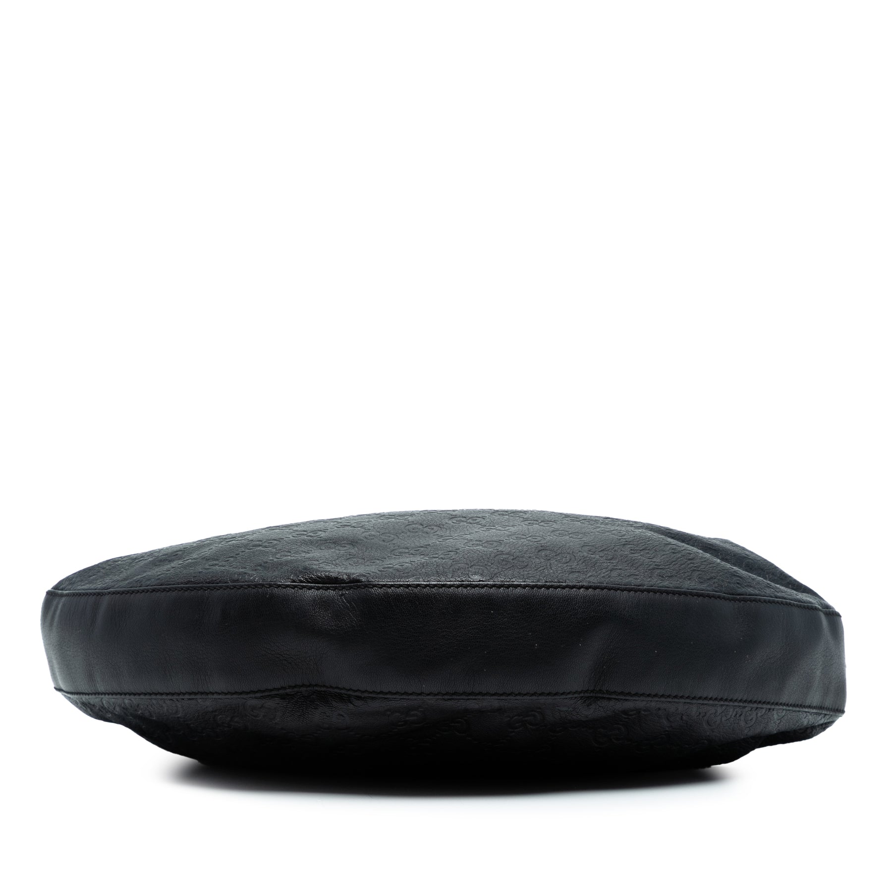 Ce sac hobo est en cuir gaufré, avec une bandoulière plate ornée d'un anneau en bambou, une fermeture zippée sur le dessus et une poche intérieure zippée. Le fond a été repeint. Il est en bon état.