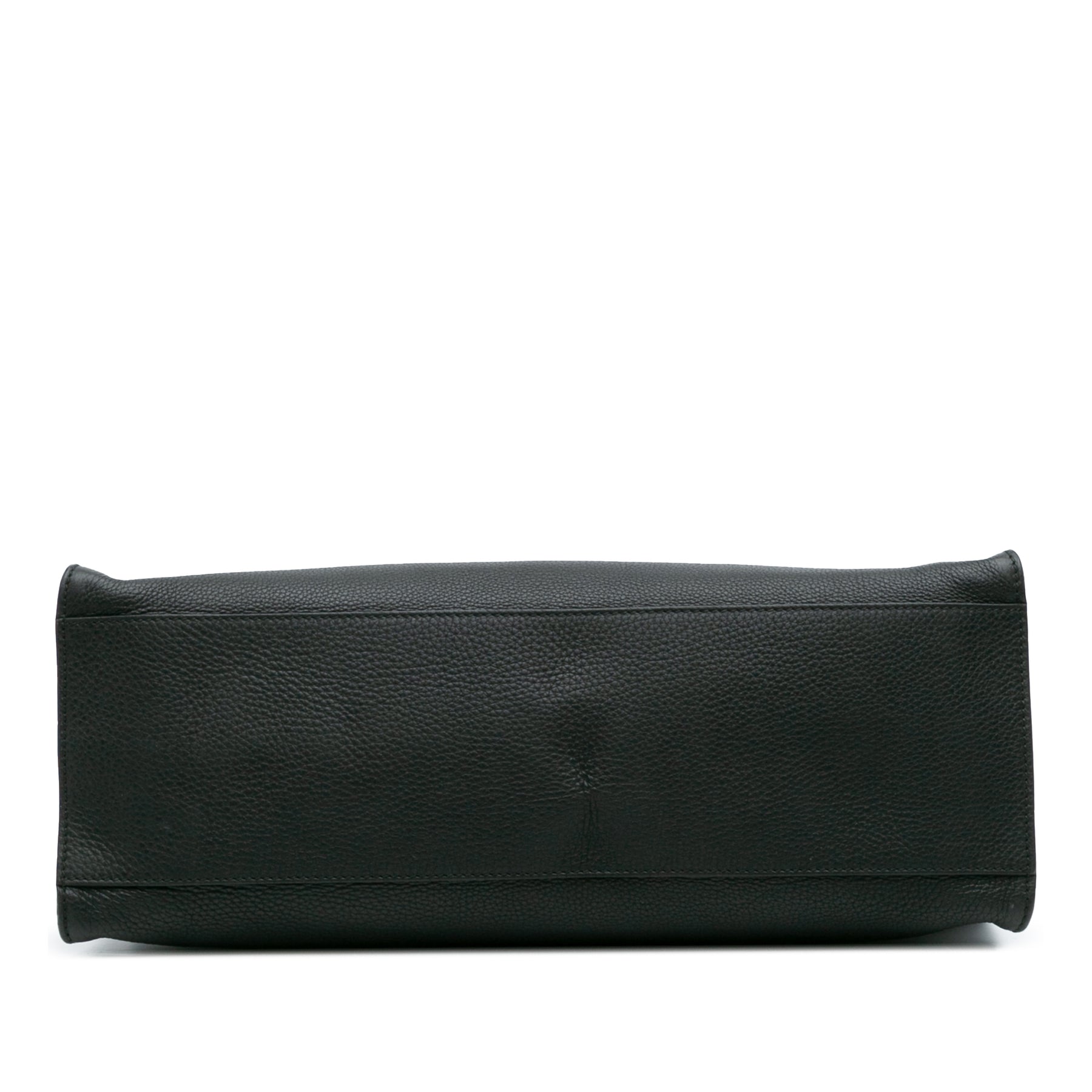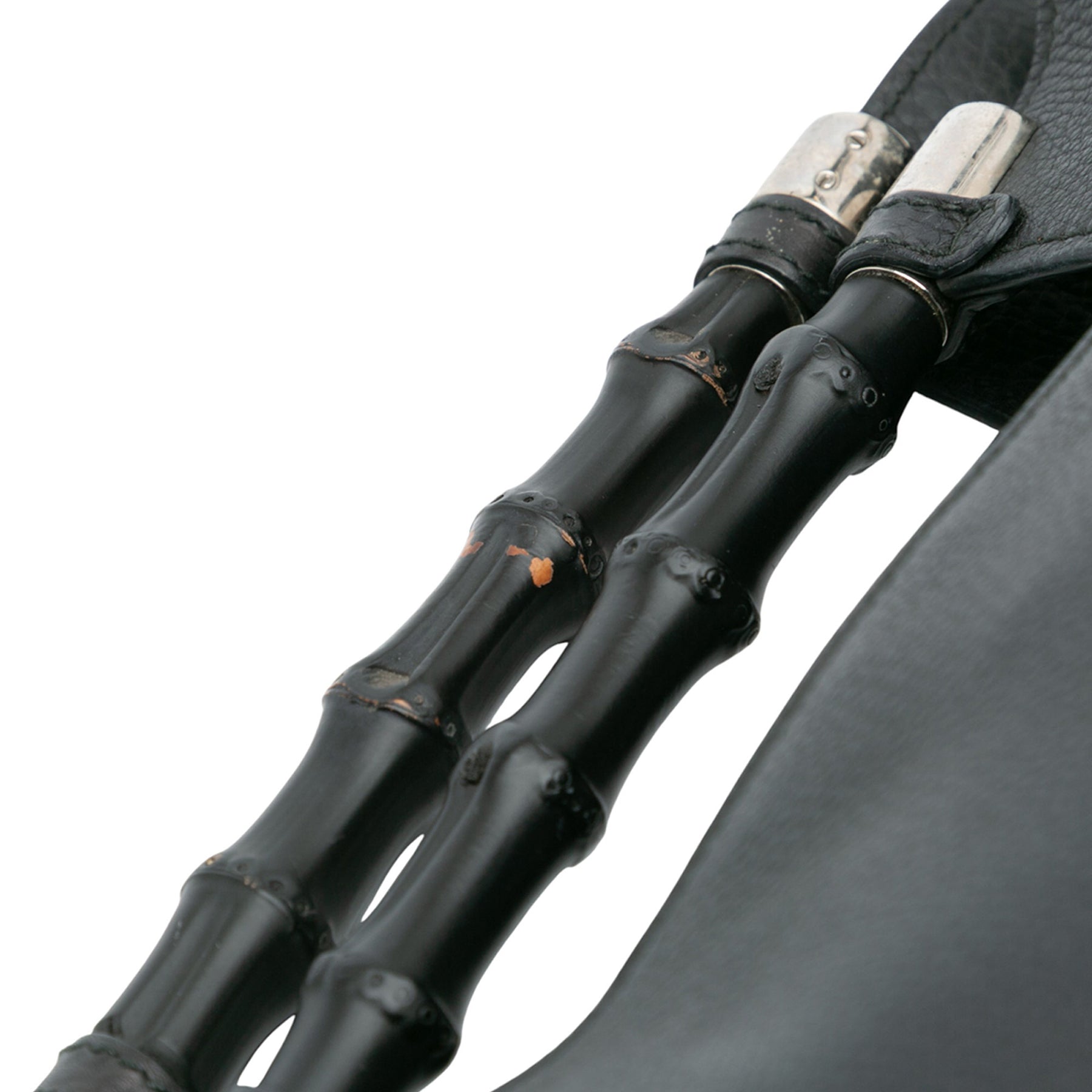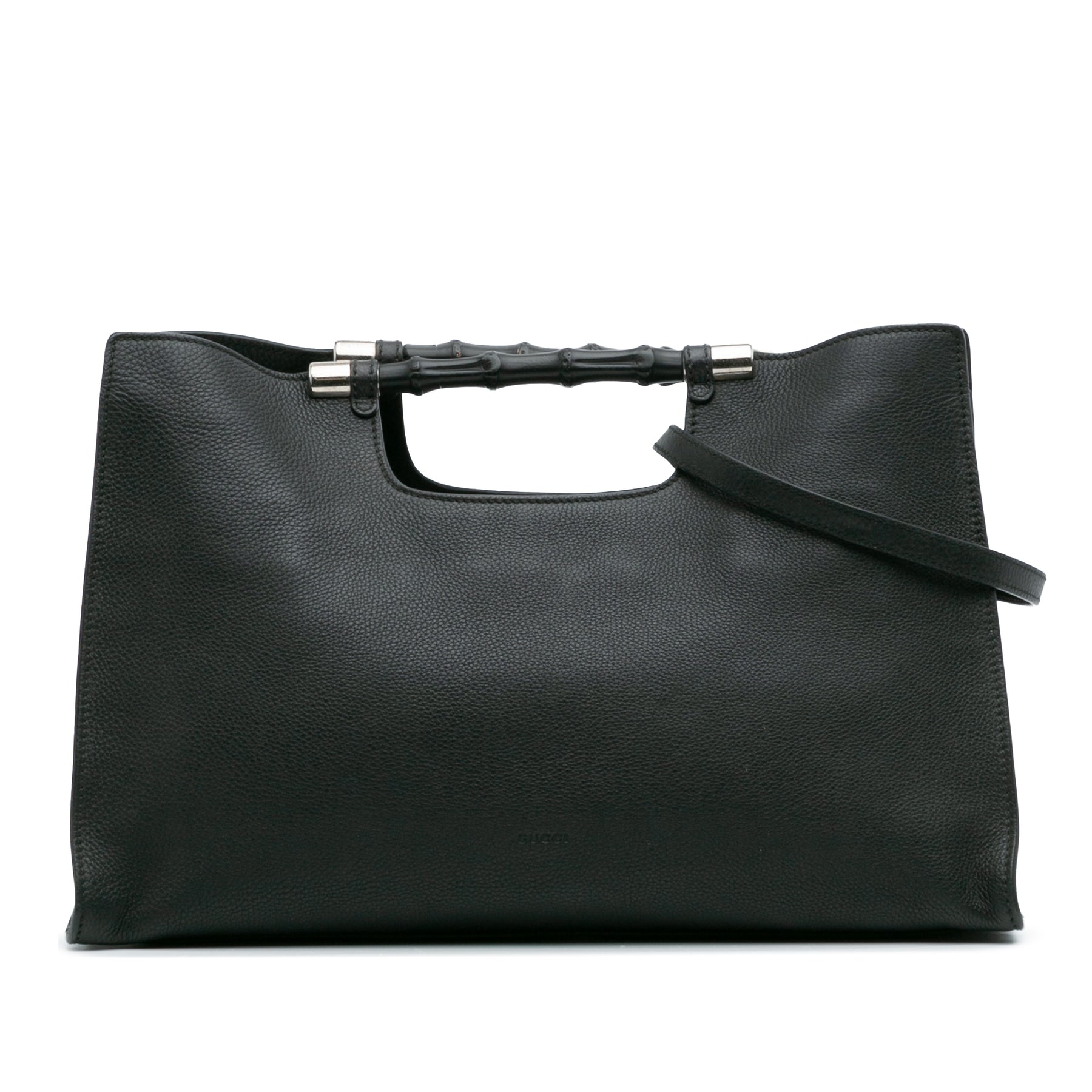 Ce sac à main est en cuir, possède des anses en bambou, une bandoulière plate amovible, une ouverture sur le dessus, un compartiment intérieur zippé et des poches intérieures zippées. Il est en bon état.