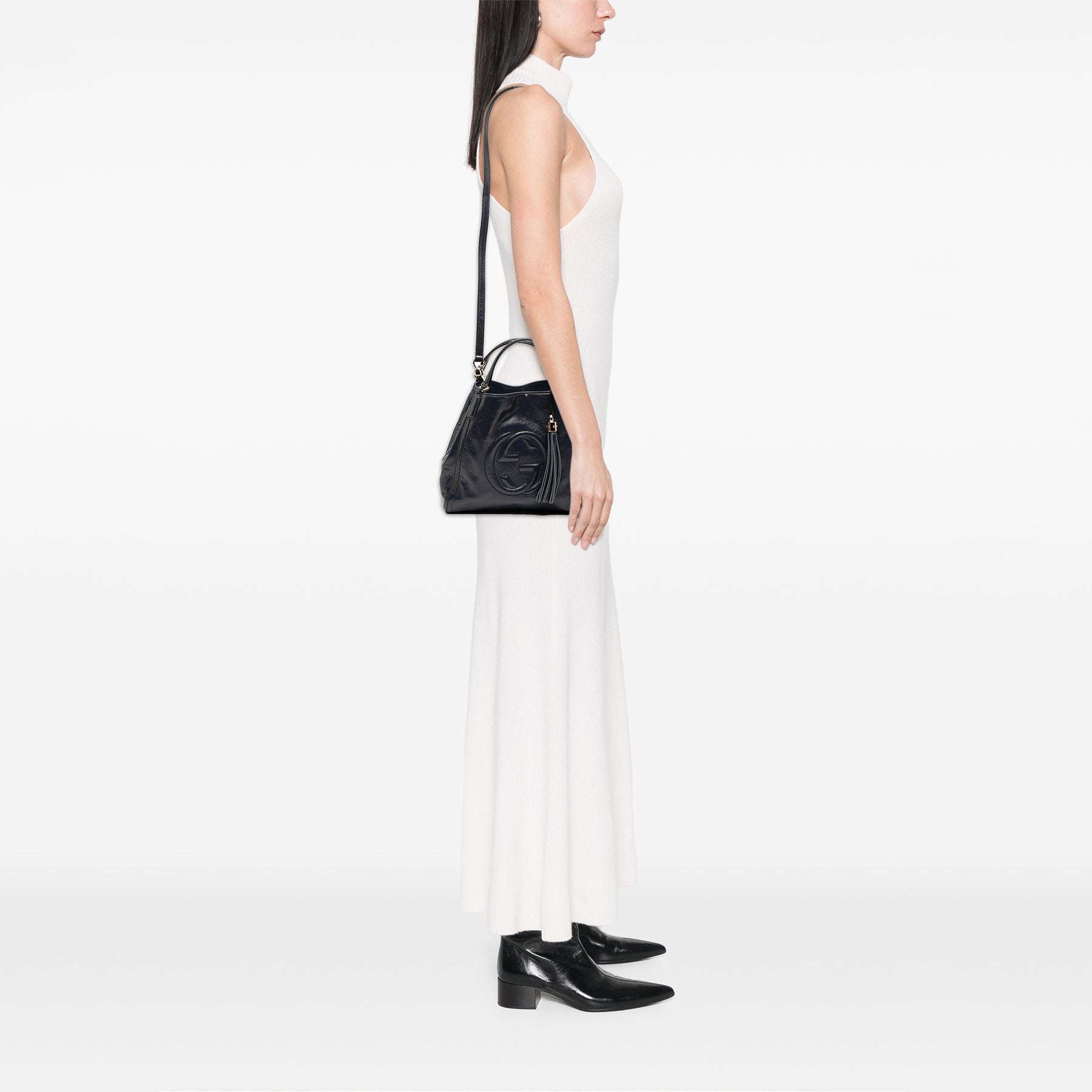 Le sac Soho est confectionné en cuir verni et possède des poignées plates en cuir ornées de pompons, une bandoulière plate amovible, une ouverture sur le dessus avec fermeture à mousqueton, ainsi que des poches intérieures zippées et plaquées. Il est en excellent état.