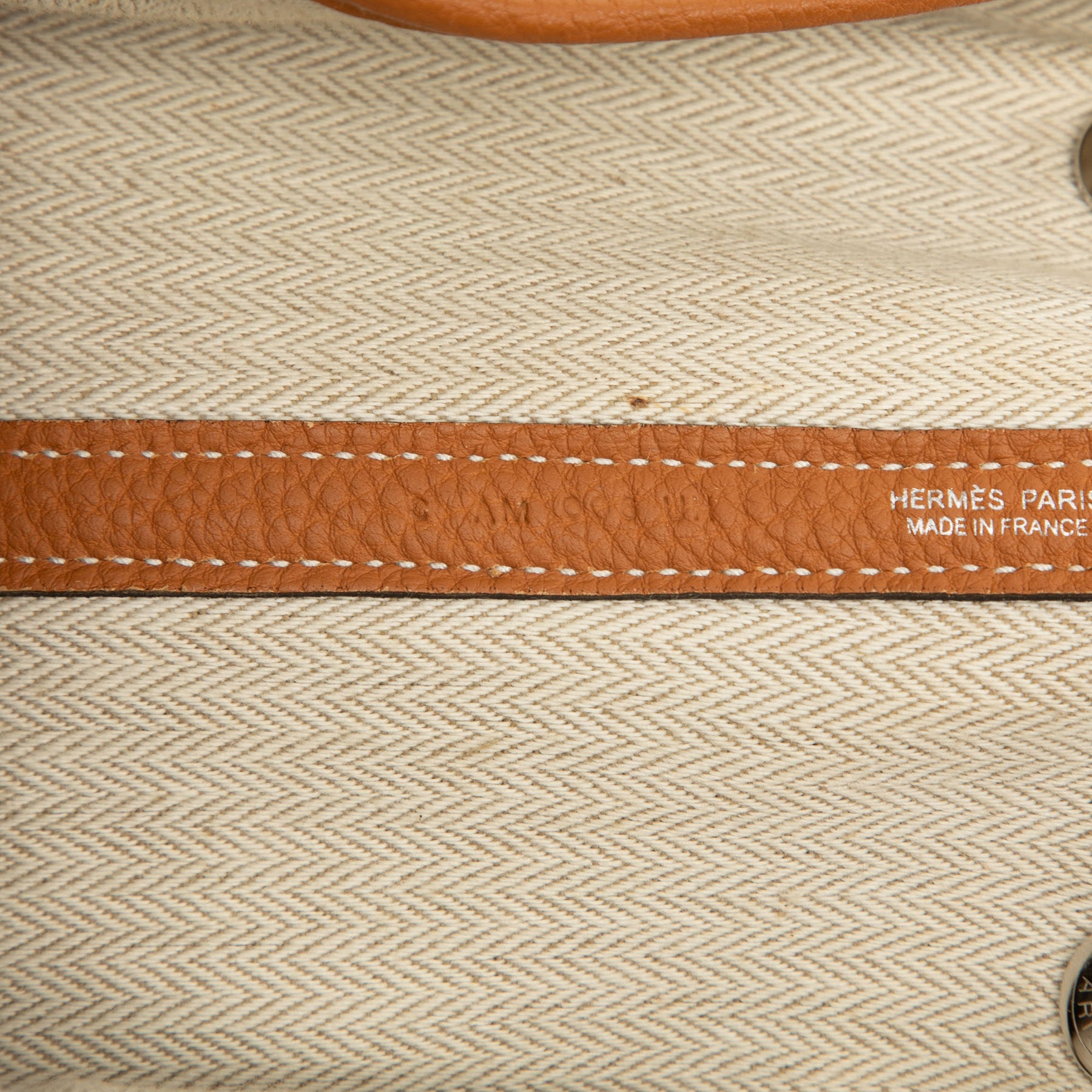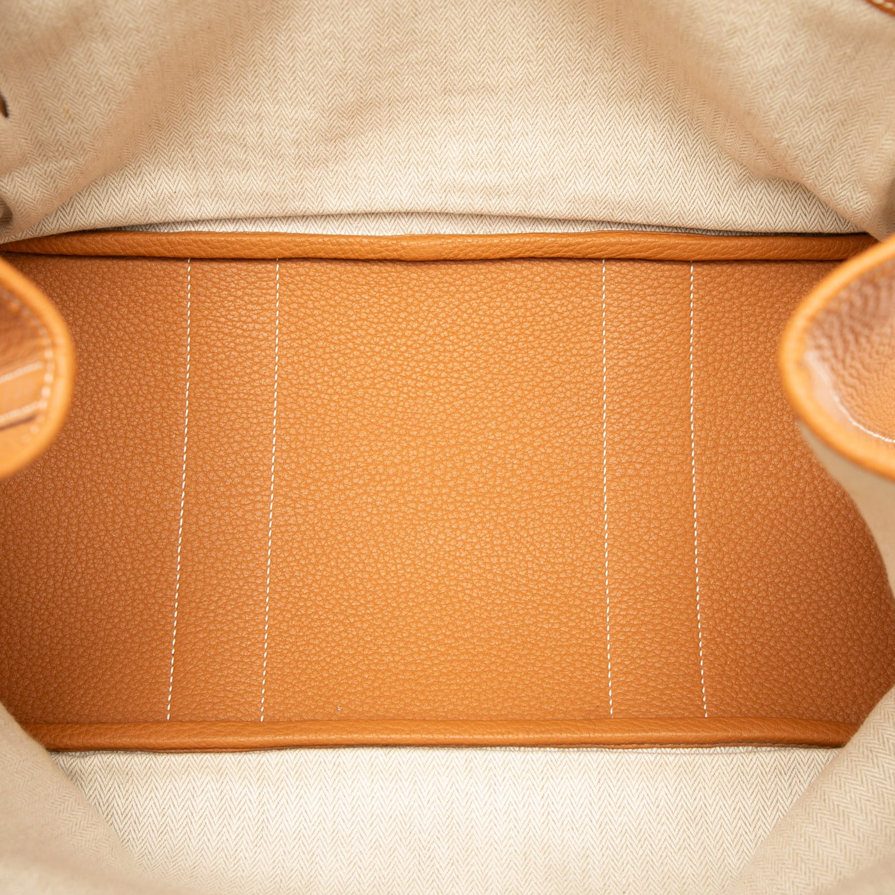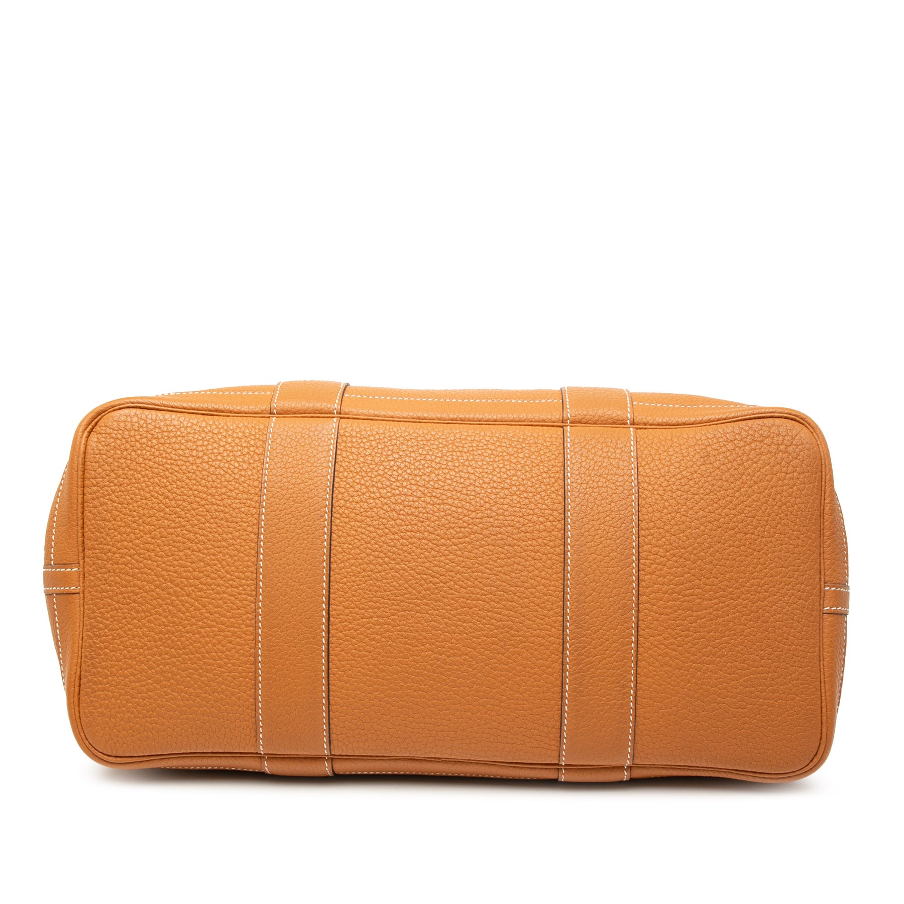 Ce sac Garden Party est confectionné en cuir Negonda couleur caramel, possède des anses roulées en cuir et se ferme par un fermoir à bouton-pression. Il est en bon état.