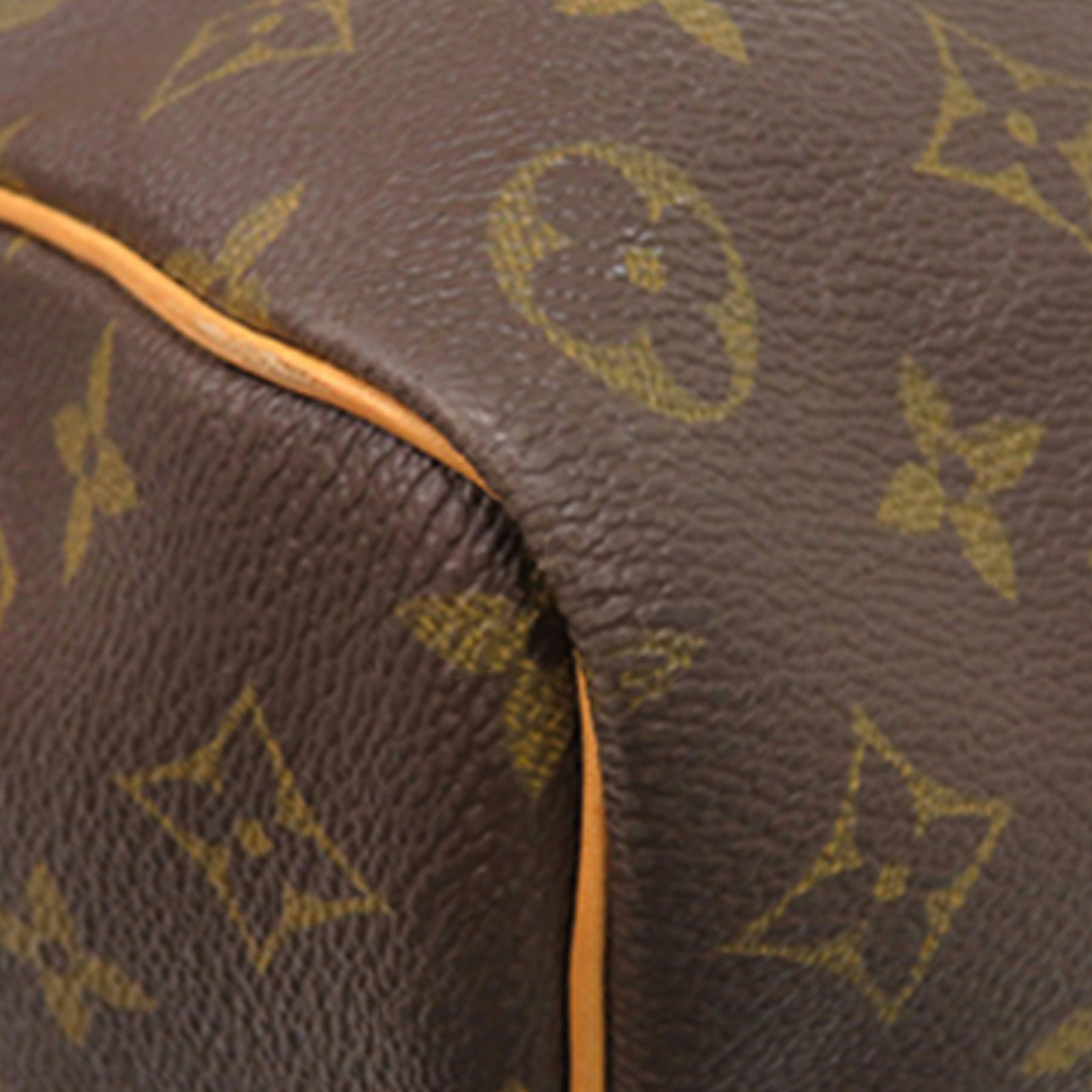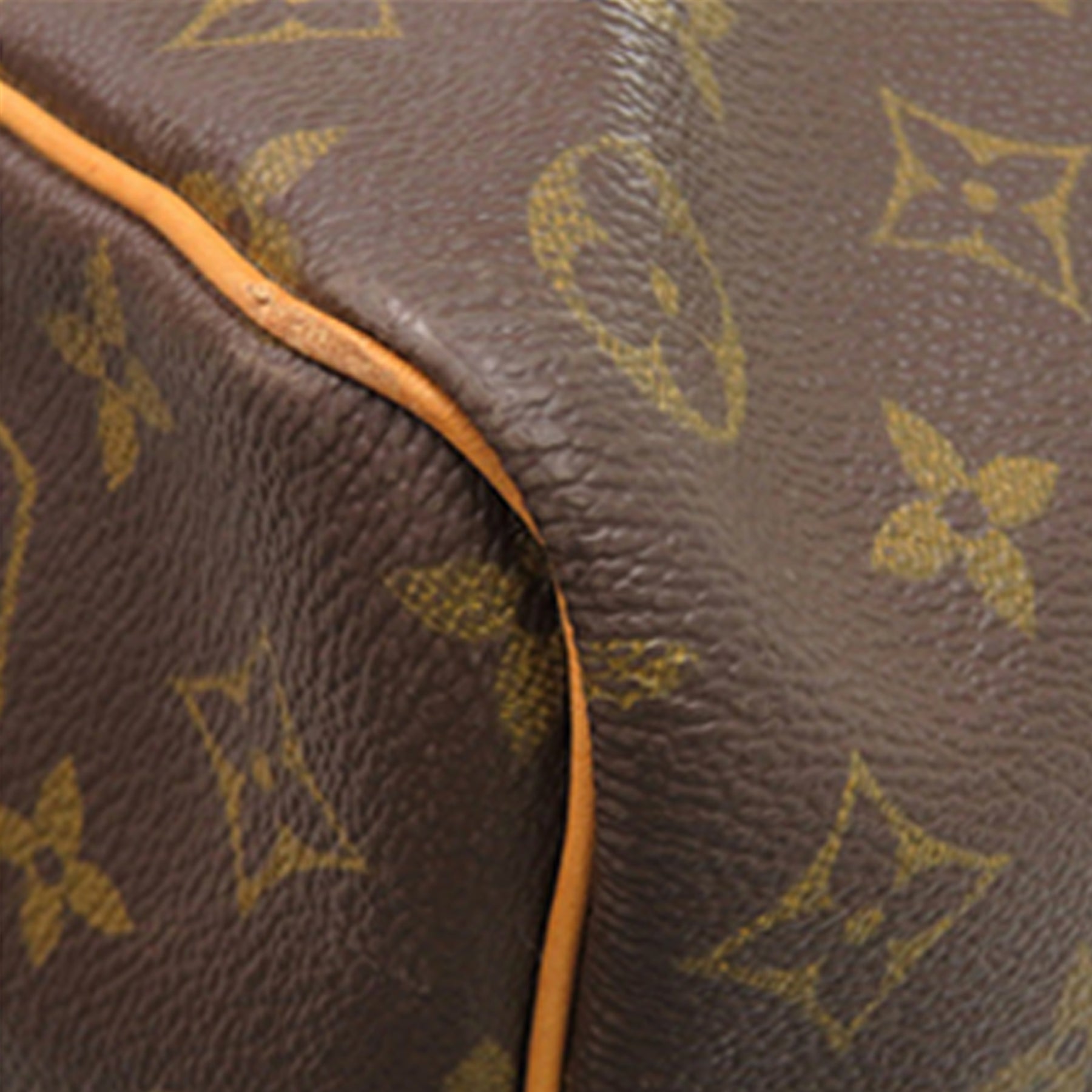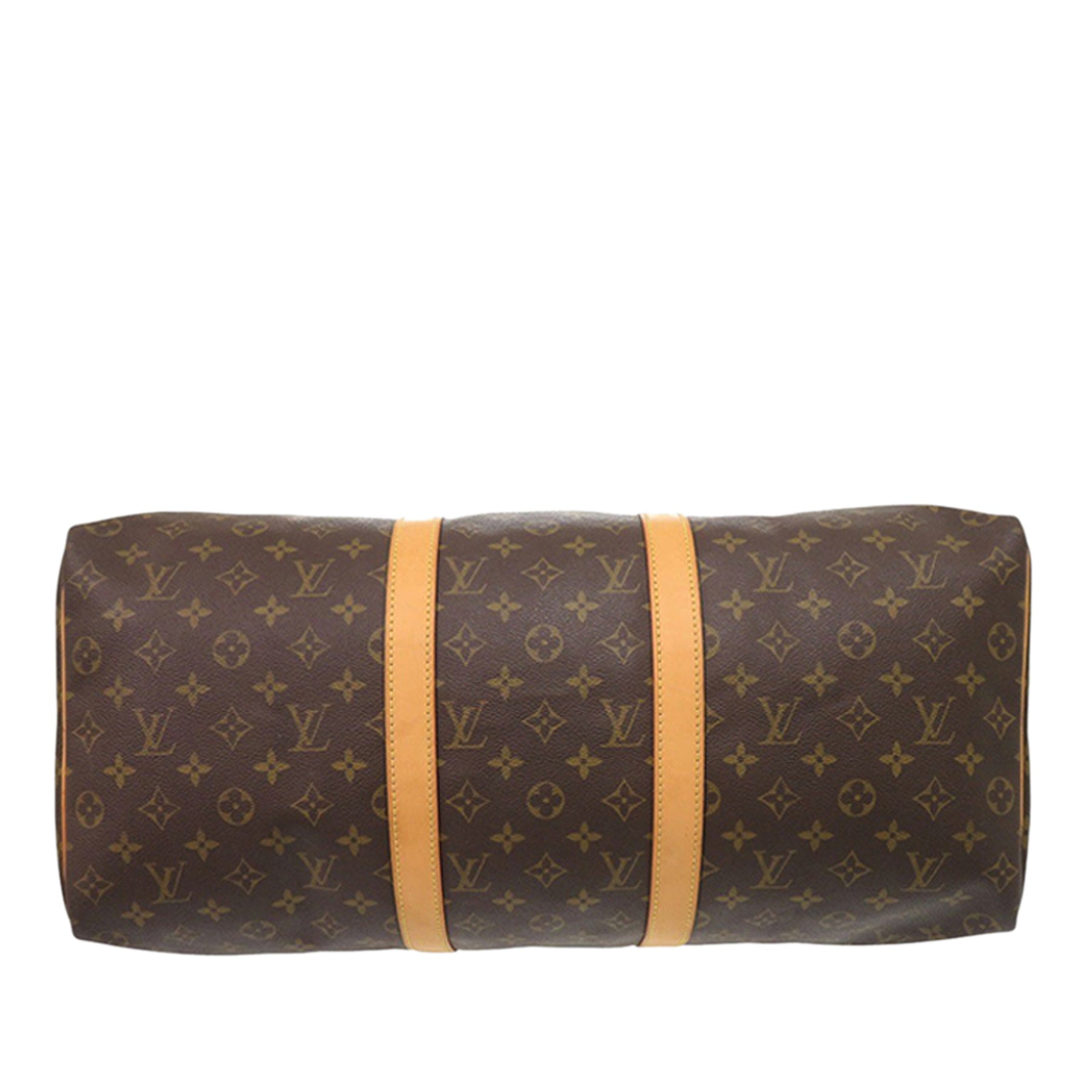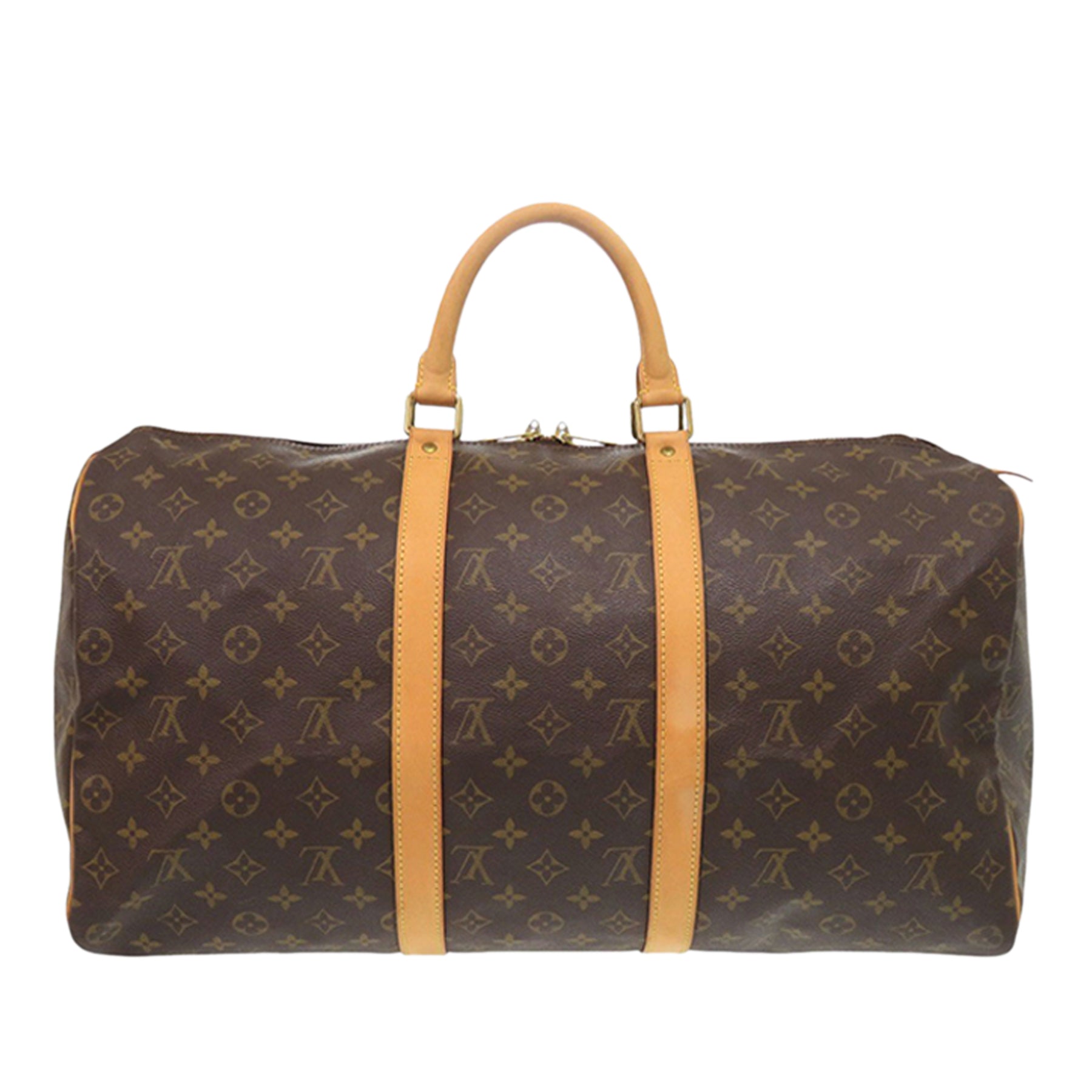 Le sac Keepall 50 est confectionné en toile monogrammée avec des finitions en cuir vachetta, des poignées roulées en cuir vachetta et une fermeture zippée sur le dessus. Il est en bon état.