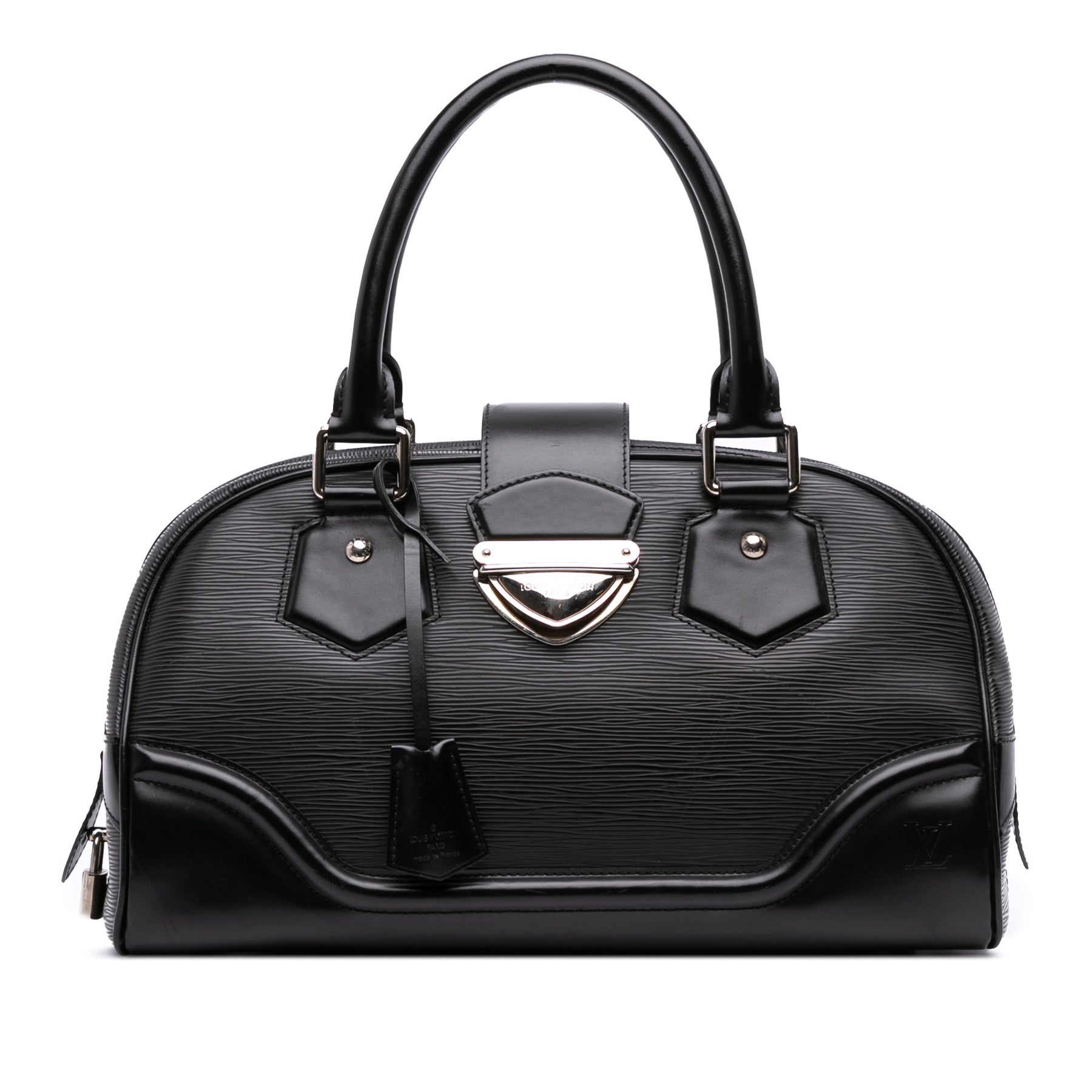 Le sac Bowling Montaigne GM est doté d'un corps en cuir Epi, de poignées roulées en cuir, d'une bandoulière plate avec fermeture à pression, d'une fermeture éclair, d'une poche extérieure ouverte à l'arrière et de poches intérieures plaquées. Il est en bon état.