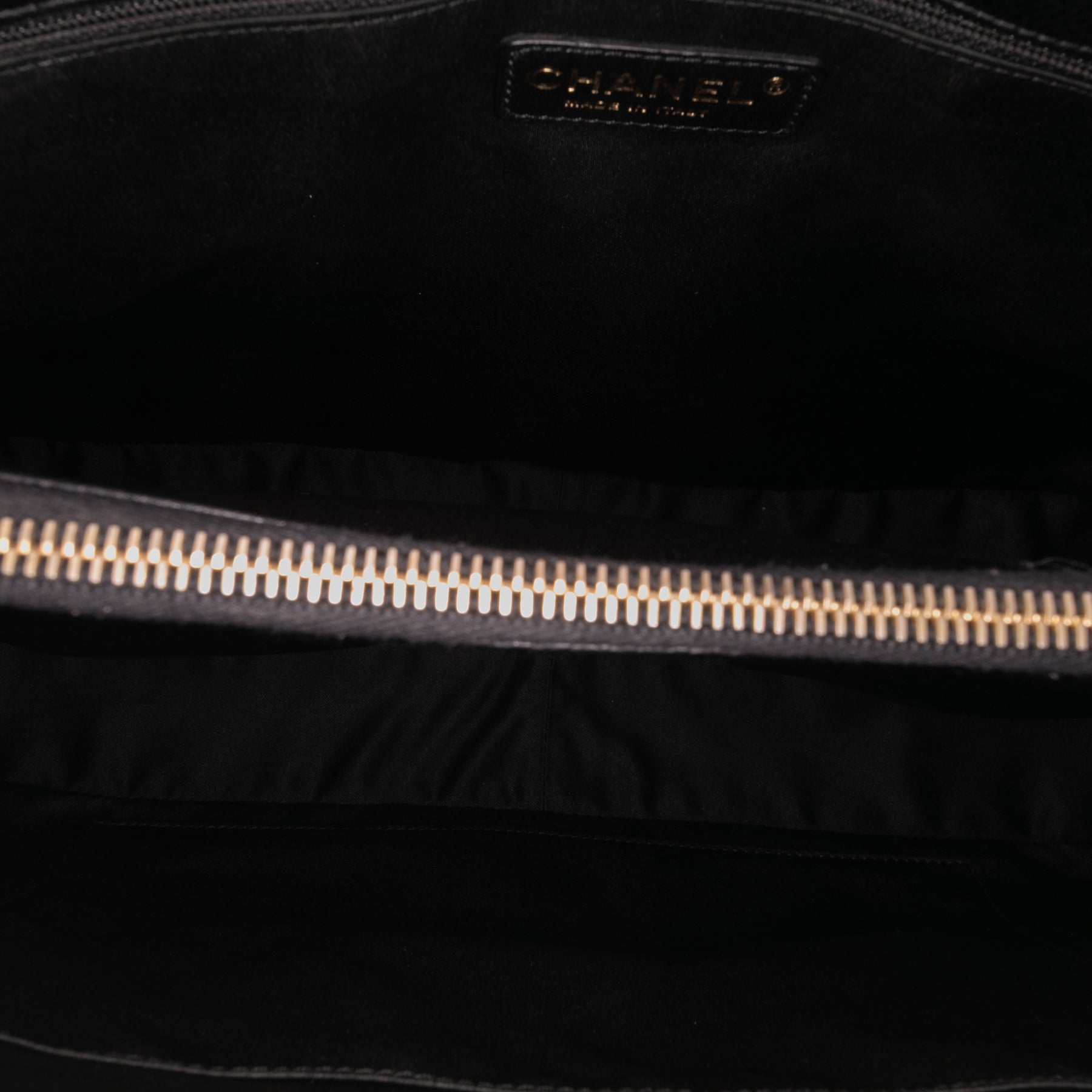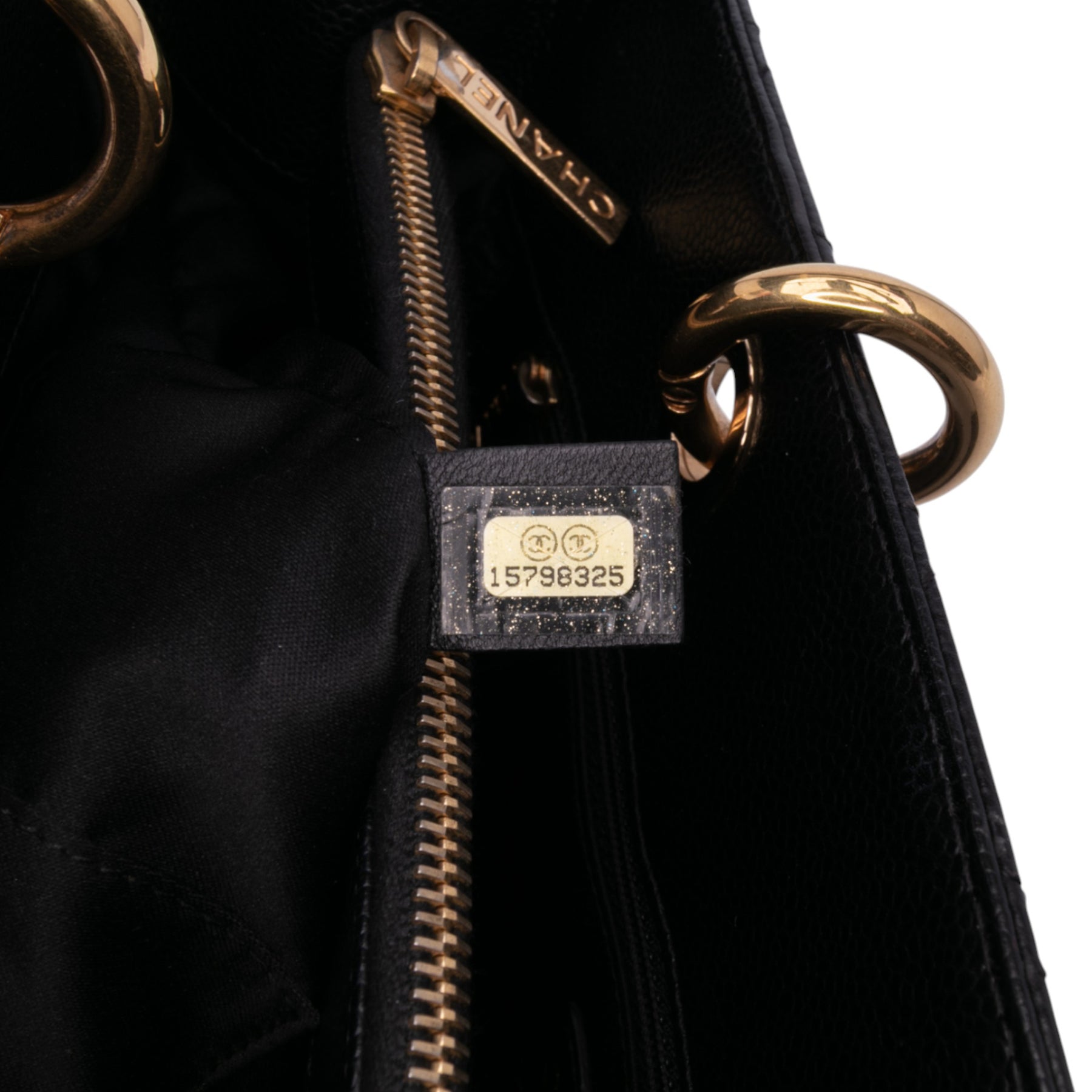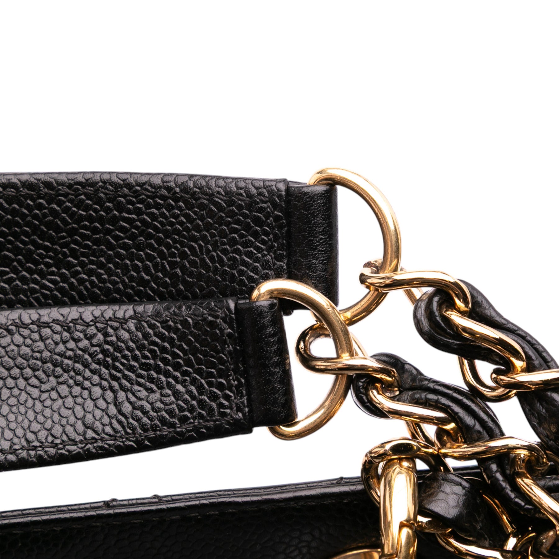 Le Grand Cabas est doté d'un corps en cuir caviar matelassé, de bandoulières en chaîne tressée en cuir, d'un dessus ouvert, d'un compartiment intérieur zippé, d'une poche arrière extérieure plaquée et de poches intérieures zippées et plaquées. Il est en excellent état.