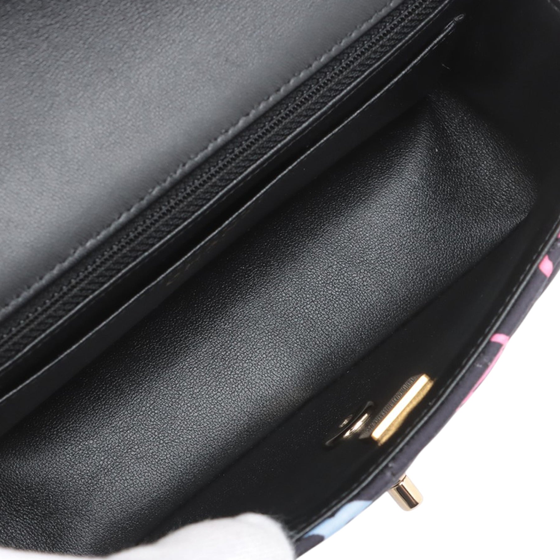 Ce sac à rabat est doté d'un corps en coton matelassé, d'une bandoulière en cuir tressé, d'un rabat avant avec fermoir à tourniquet, d'une poche extérieure plaquée au dos et de poches intérieures zippées et plaquées. Il est en excellent état.