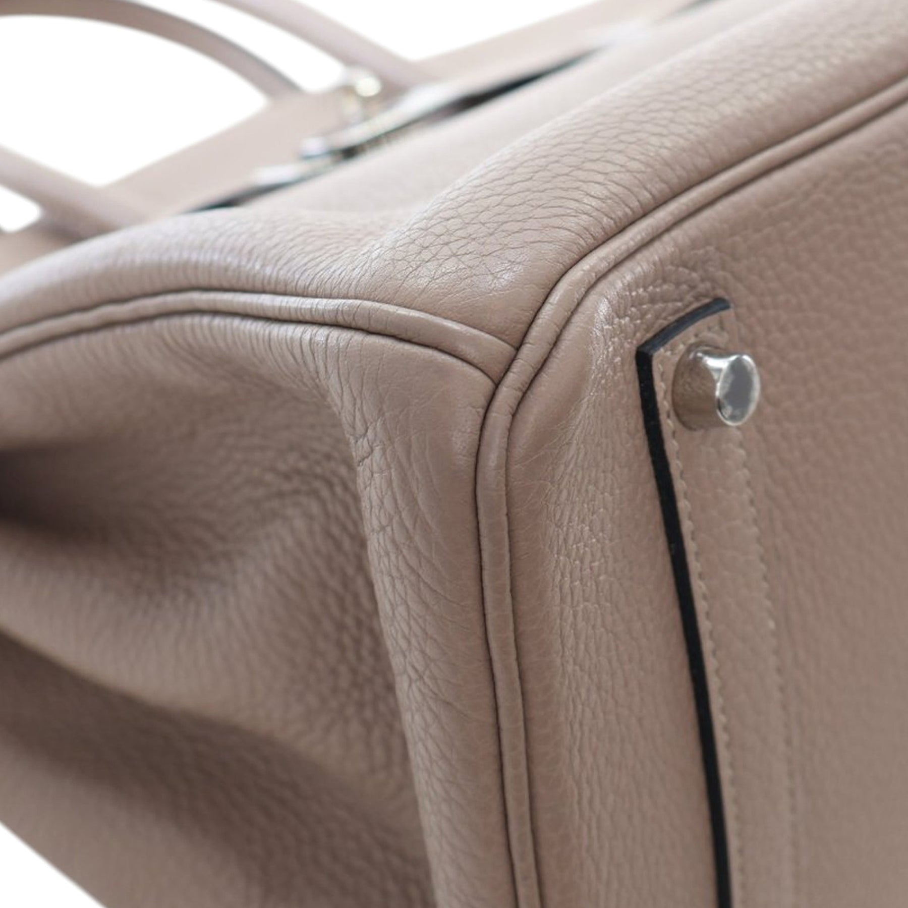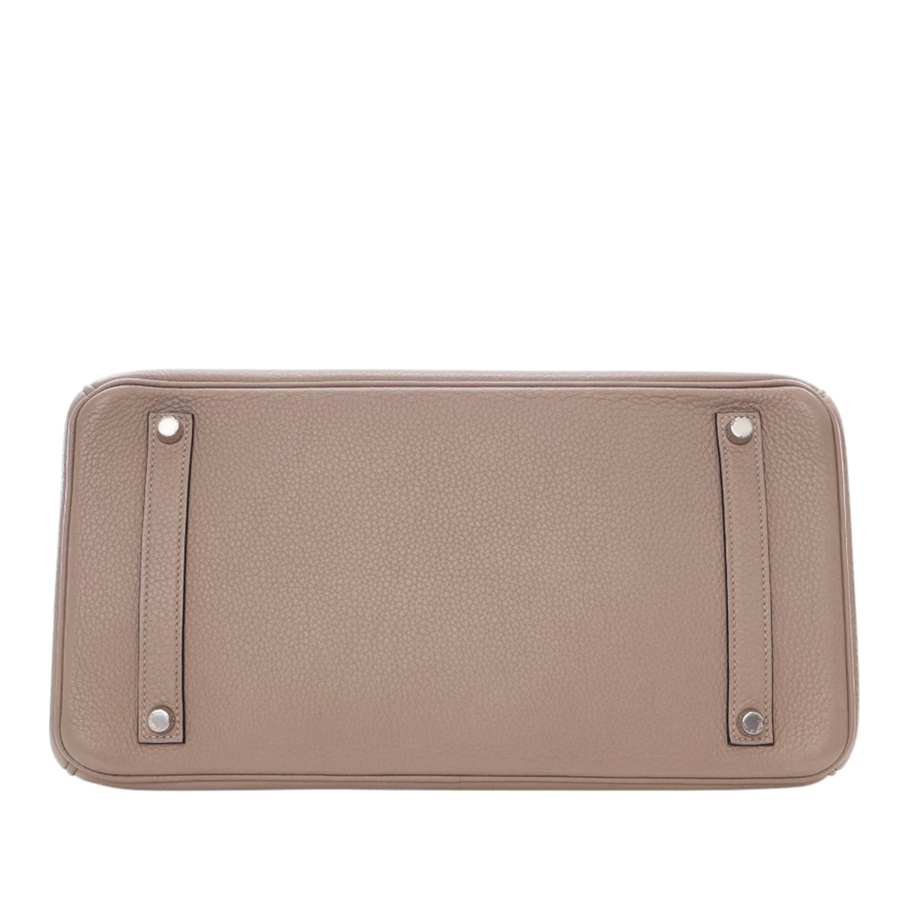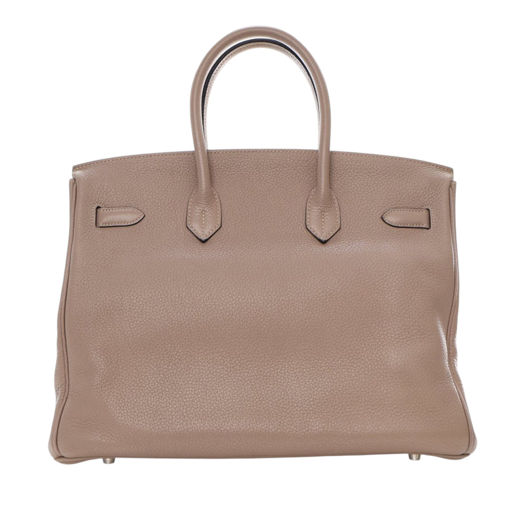Ce Birkin 35 est doté d'un corps en cuir Togo couleur Gris Tourterelle, de poignées en cuir roulées, d'un rabat avant avec fermoir à tourniquet et de poches intérieures plaquées et zippées. Il est en excellent état.