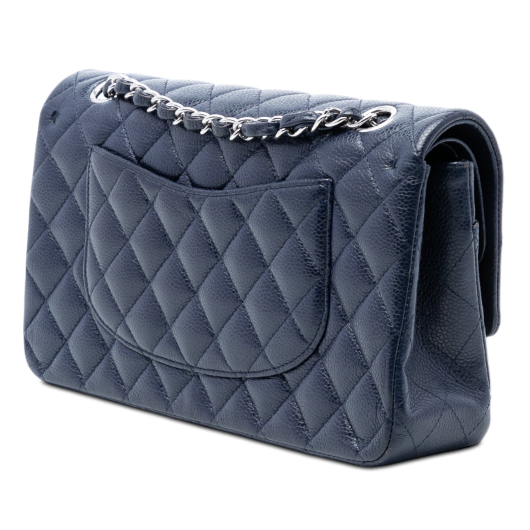 Ce sac bandoulière est confectionné en cuir caviar matelassé et possède une bandoulière en chaîne tressée, un double rabat avant avec fermoir CC, une poche plaquée extérieure au dos, ainsi que des poches intérieures zippées et plaquées. Il est en bon état.