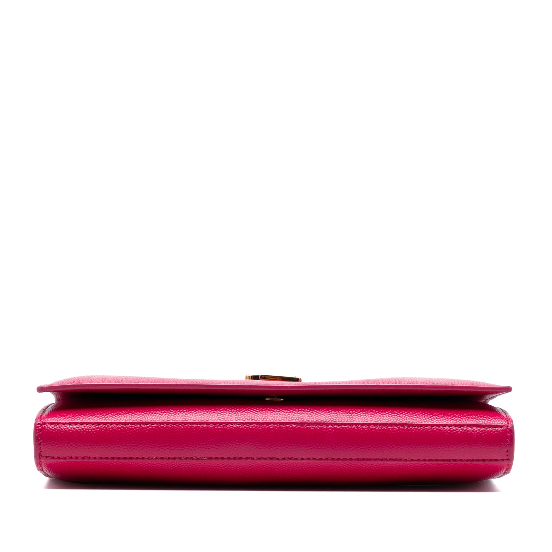 Ce portefeuille à chaîne est en cuir, possède une bandoulière à maillons, un rabat avant à fermeture magnétique, ainsi que des poches intérieures zippées et plaquées. Le dessous extérieur a été repeint. Il est en bon état.