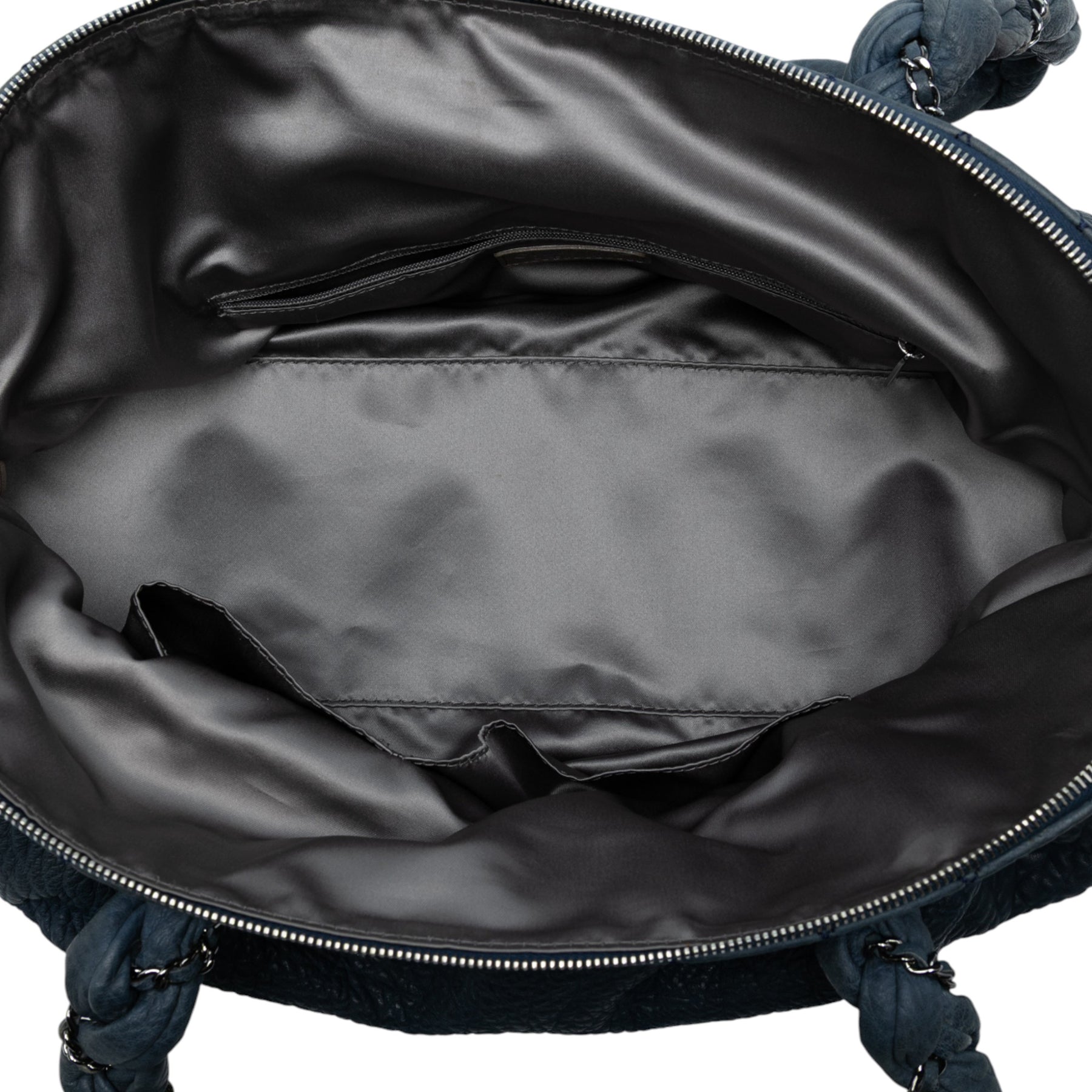 Le sac bandoulière Lady Braid est confectionné en cuir matelassé et possède une bandoulière en chaîne tressée de cuir, une fermeture zippée sur le dessus et une poche intérieure zippée. Il est en bon état.