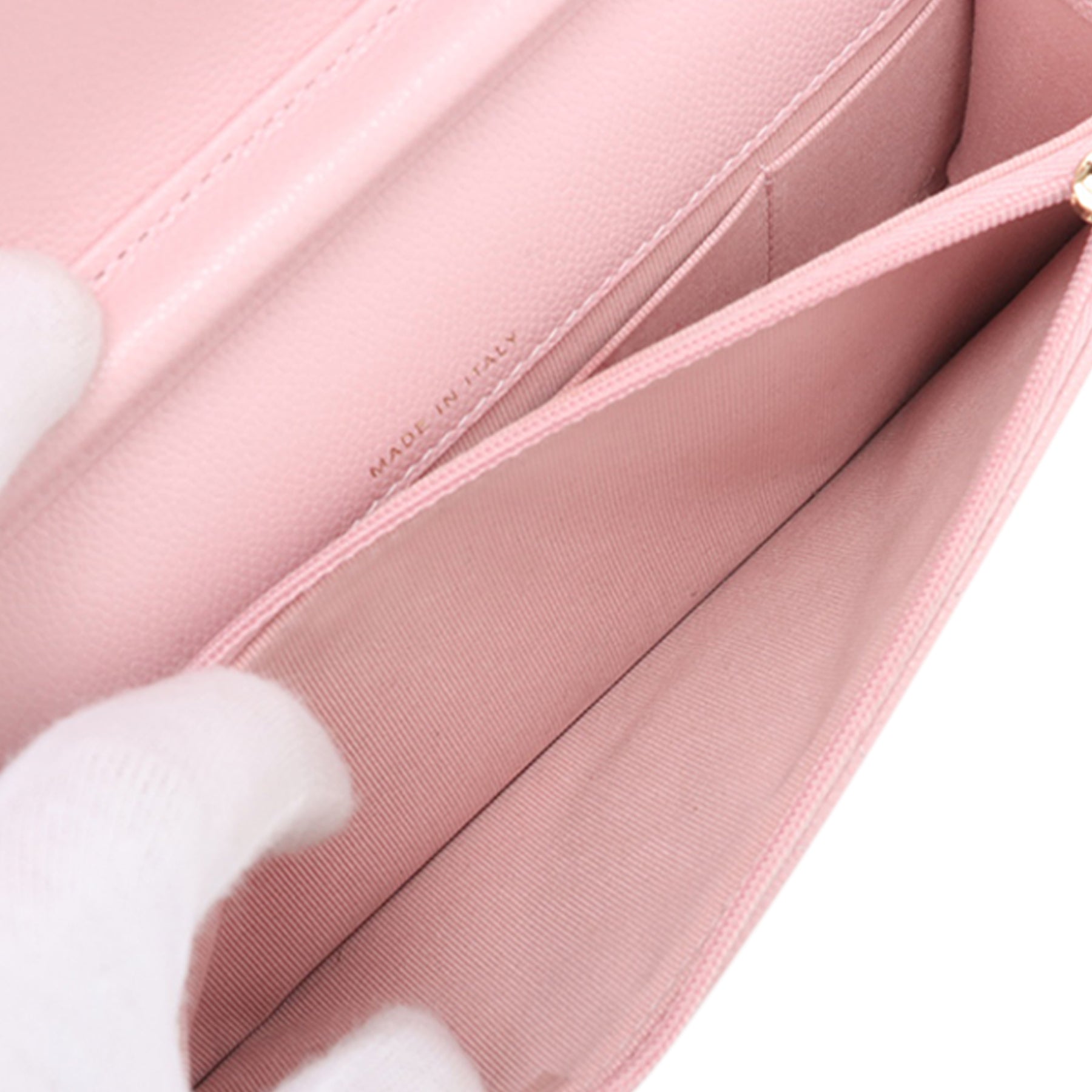 Ce portefeuille à chaîne est confectionné en cuir caviar matelassé et possède une bandoulière amovible en chaîne tressée de cuir, un rabat avant à fermeture magnétique, un compartiment extérieur plaqué au dos, ainsi que des poches intérieures zippées et plaquées. Il est en excellent état.