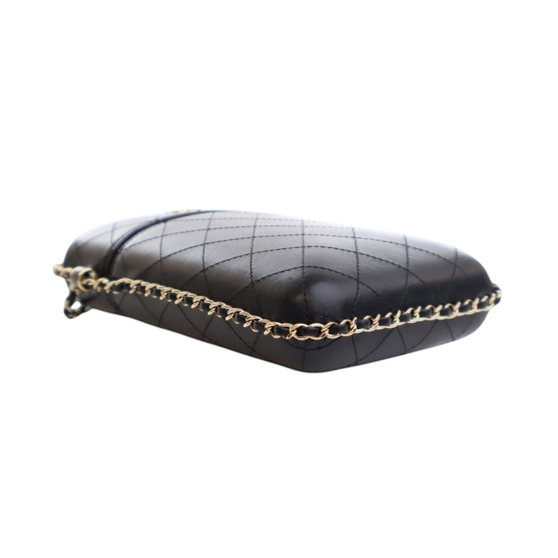 Cet étui pour téléphone est en cuir matelassé, possède une bandoulière en chaîne tressée de cuir et un capuchon amovible sur le dessus. Il est en bon état.