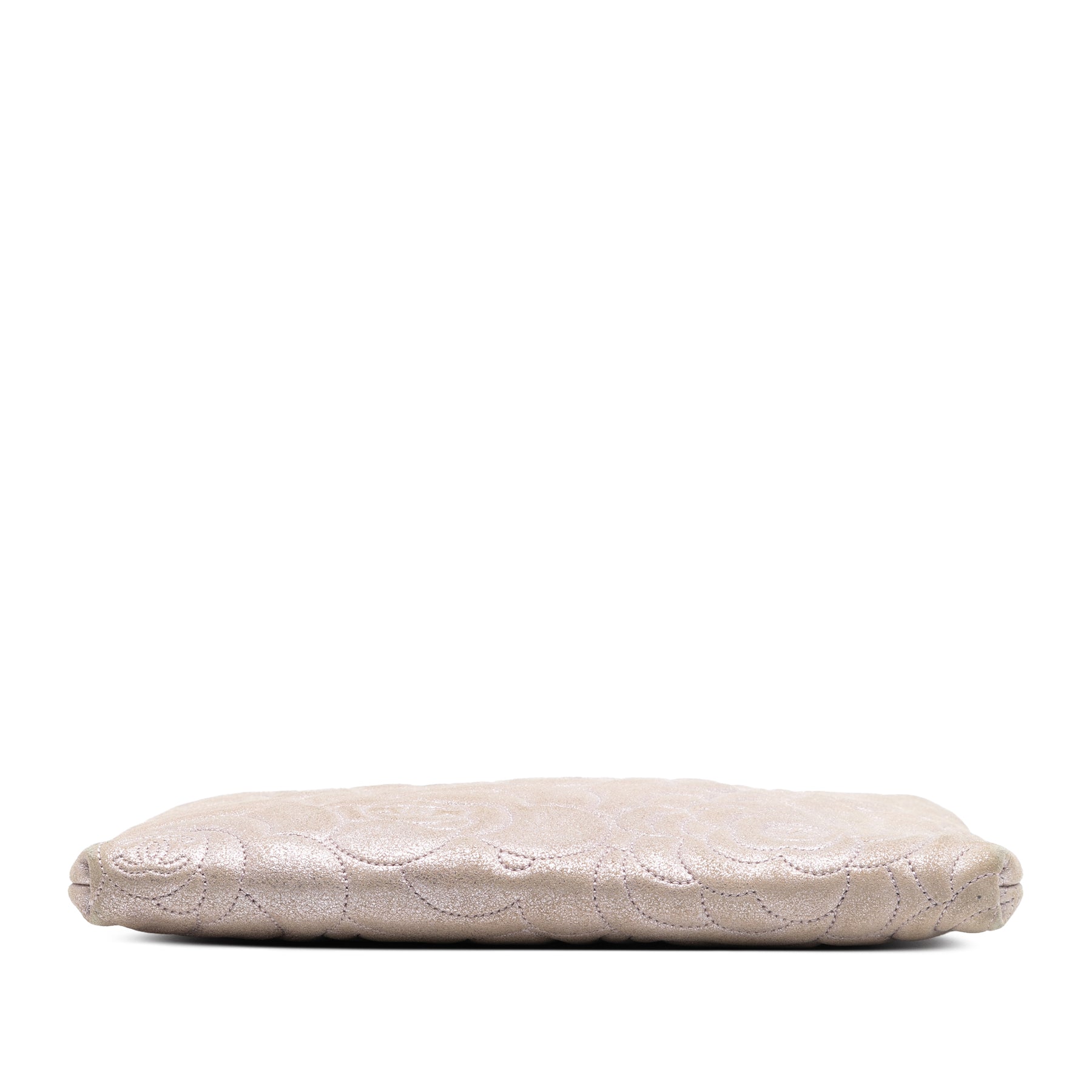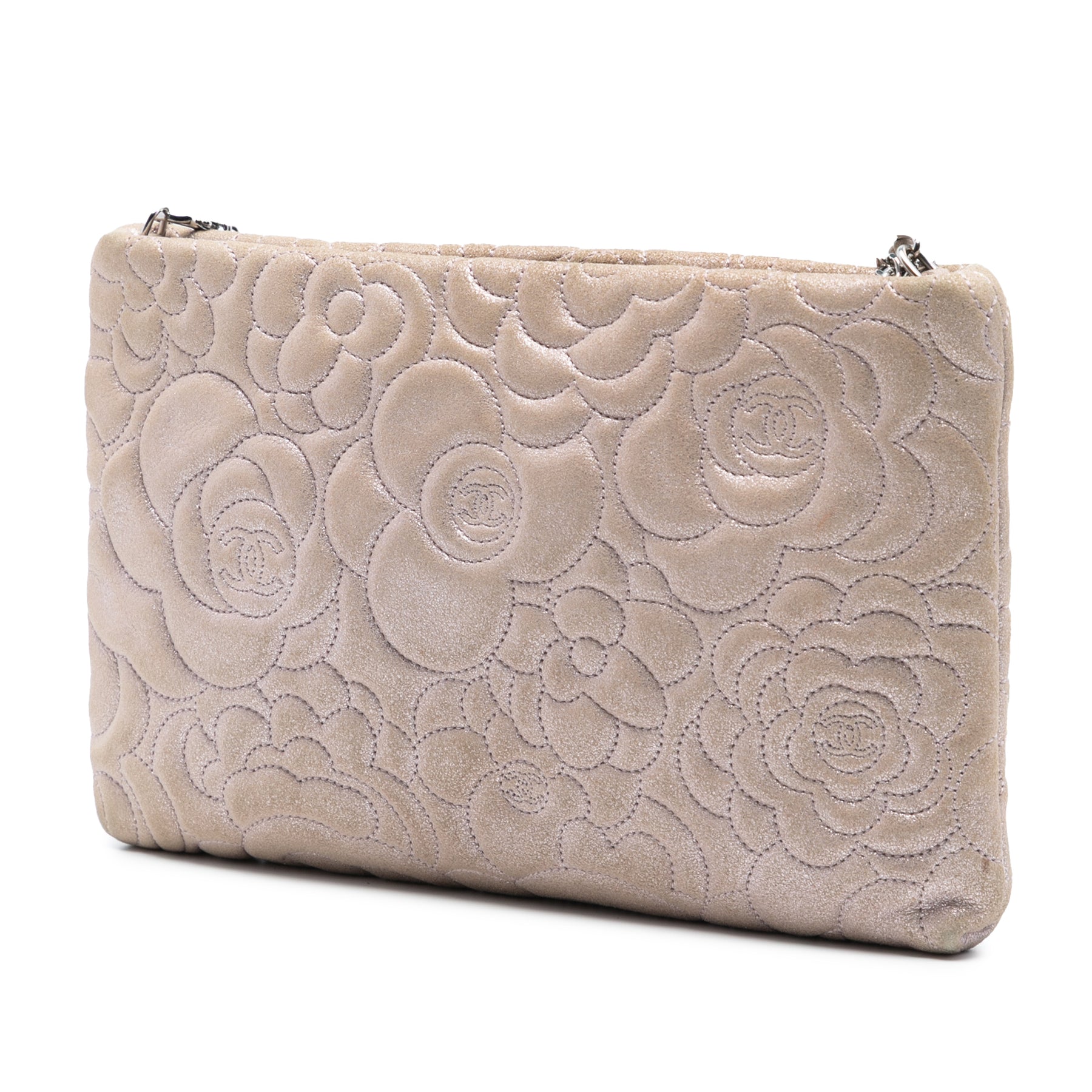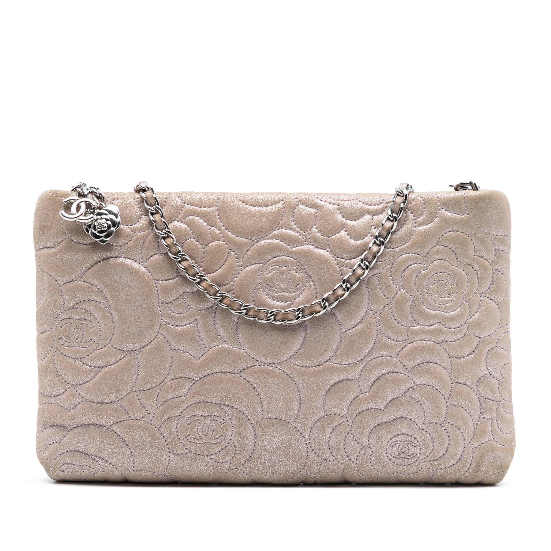 Ce sac bandoulière est confectionné en cuir d'agneau métallisé gaufré, possède une bandoulière en chaîne tressée et se ferme par une fermeture éclair sur le dessus. Il est en bon état.