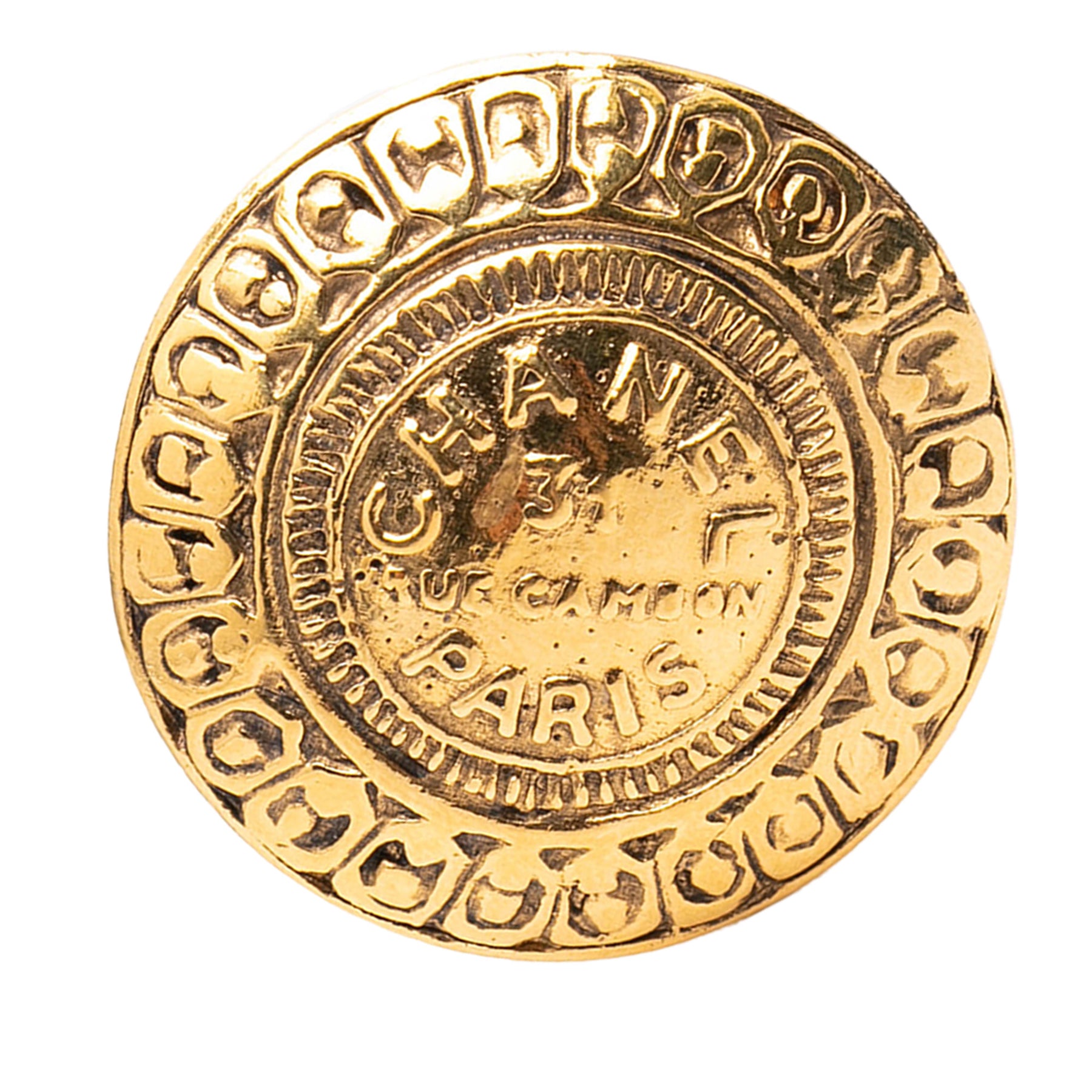 Cette broche est en métal doré et se ferme par une épingle au dos. Elle est en bon état.