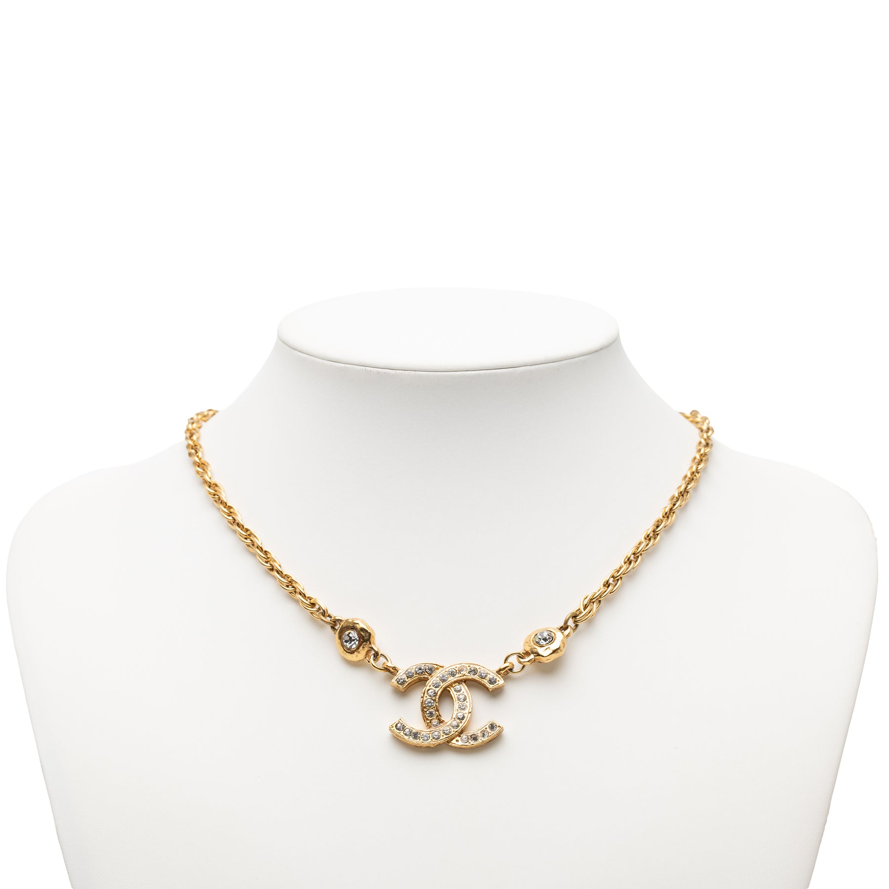 Ce collier est composé d'une chaîne plaquée or, d'un pendentif orné de strass et d'un fermoir à ressort. Il est en excellent état.