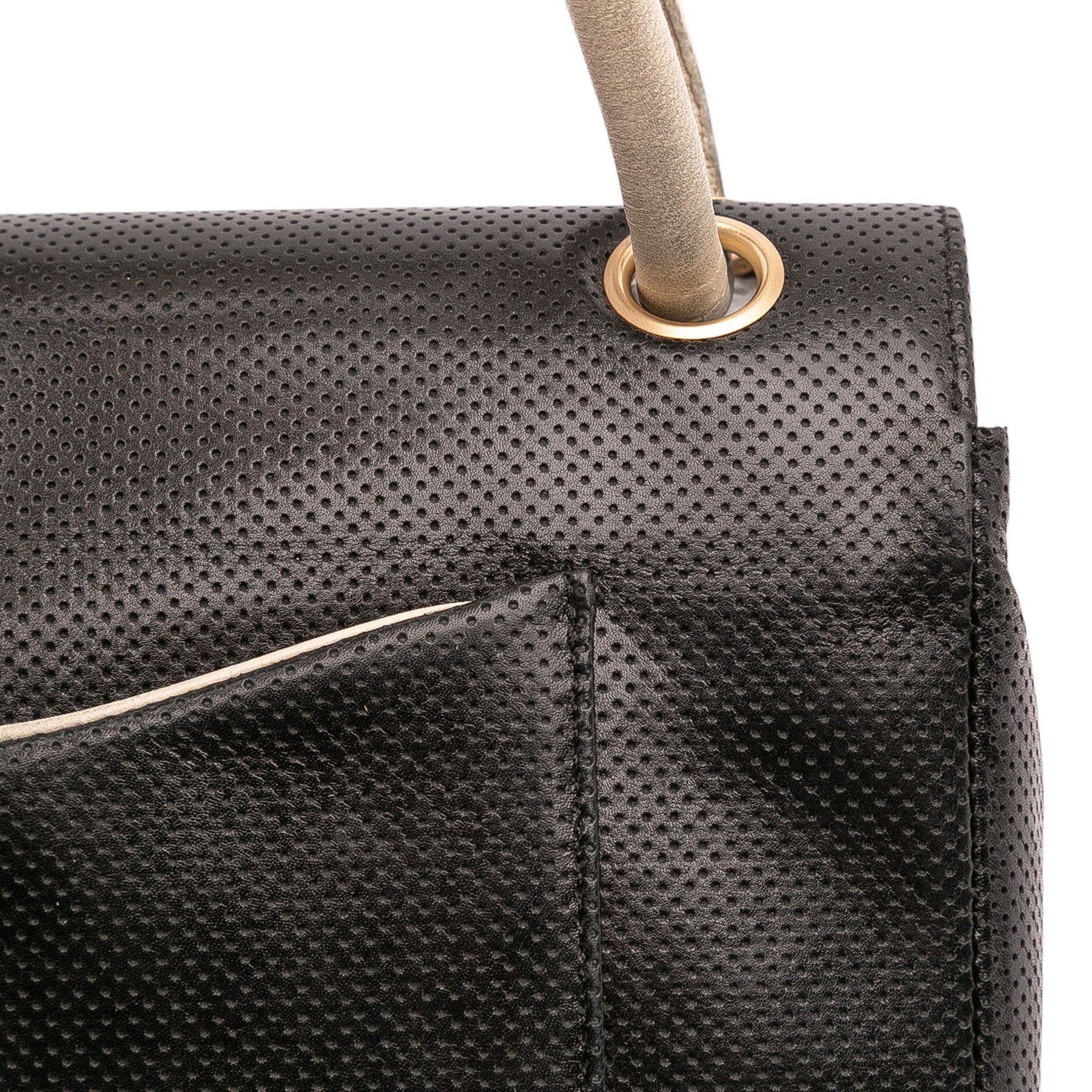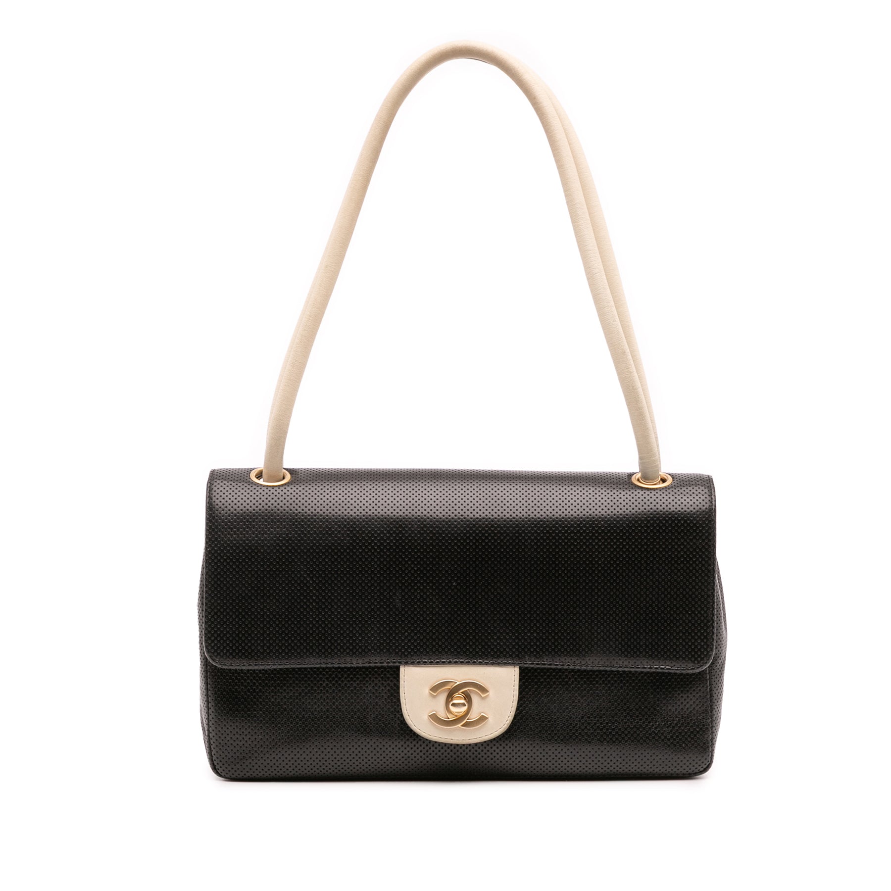 Ce sac bandoulière est doté d'un corps en cuir de veau perforé, de bandoulières en cuir roulé, d'un rabat avant avec fermoir à tourniquet CC, d'une poche extérieure plaquée au dos et d'une poche intérieure zippée. Il est en excellent état.