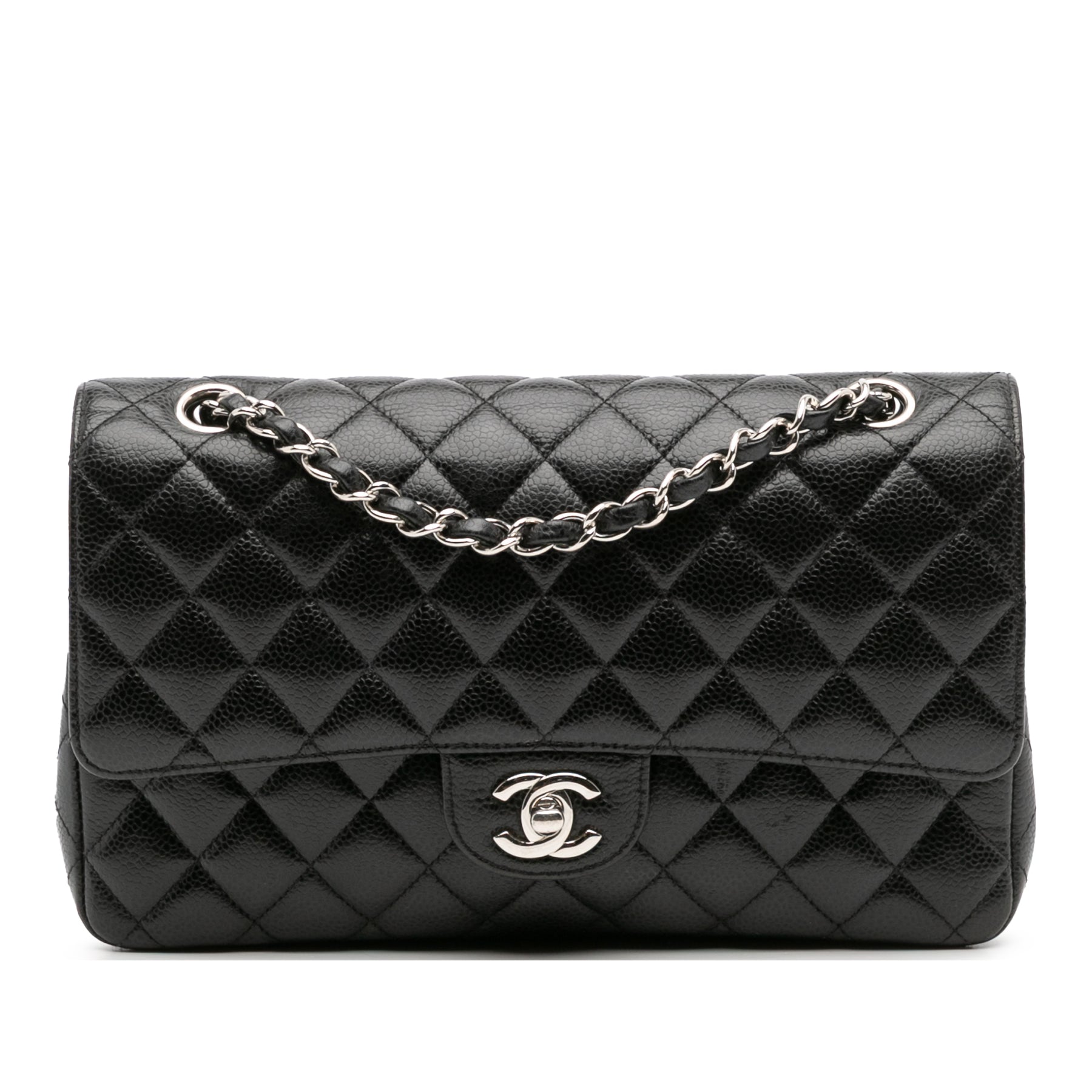 Ce sac bandoulière est confectionné en cuir caviar matelassé et possède des bandoulières en chaîne tressée de cuir, un double rabat avant orné du double C entrelacé et d'une fermeture à tourniquet, une poche plaquée extérieure au dos, ainsi que des poches intérieures zippées et plaquées. Il est en bon état.