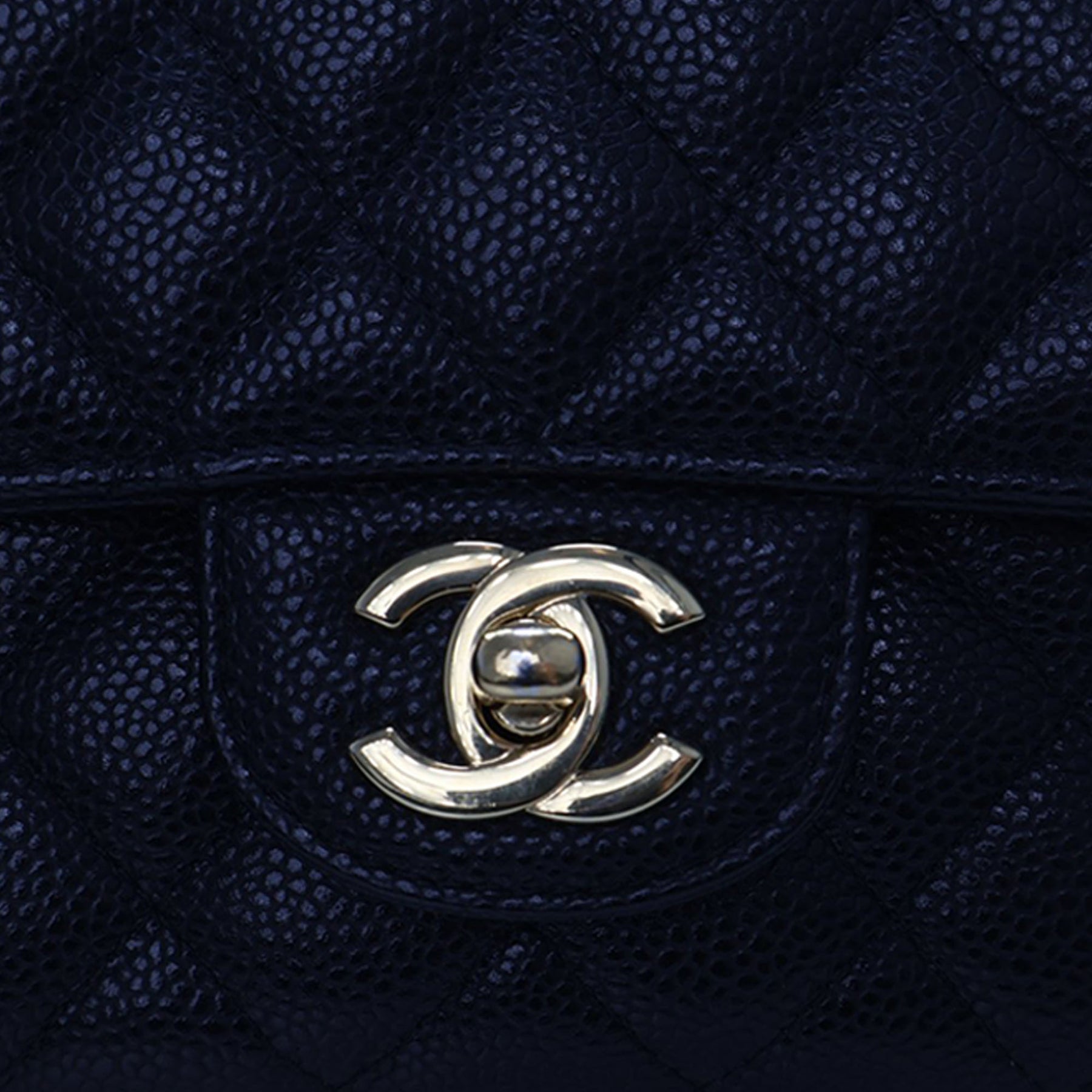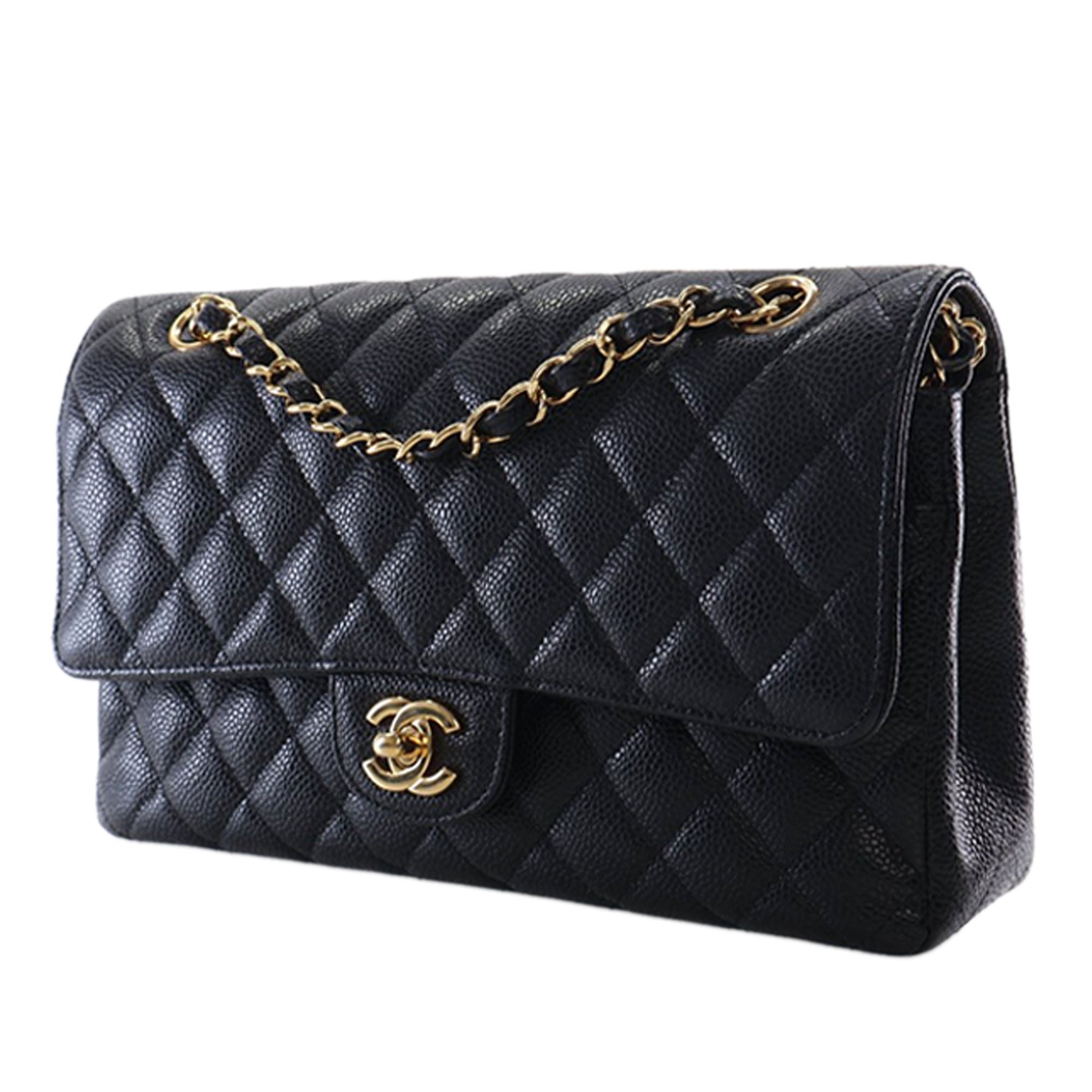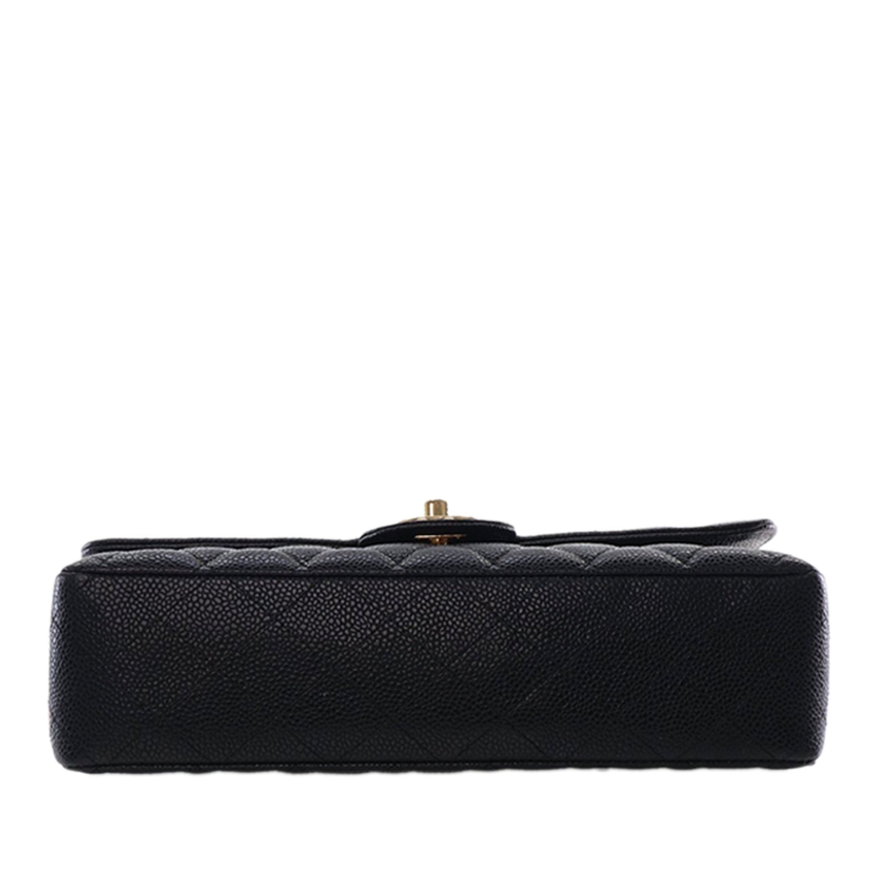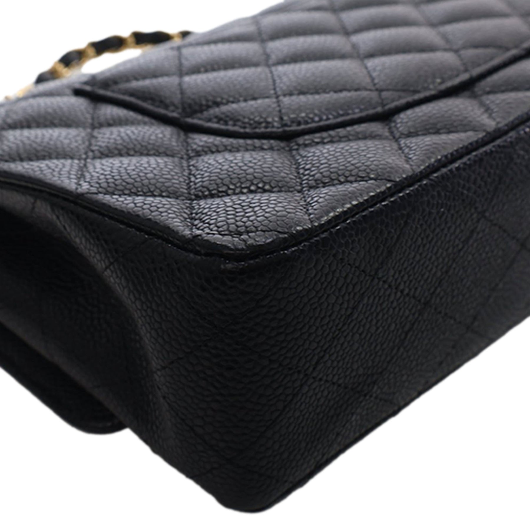 Le sac Classic Flap est confectionné en cuir caviar matelassé et possède une bandoulière en chaîne tressée couleur or, un double rabat avec fermoir CC, une poche plaquée extérieure au dos, ainsi que des poches intérieures zippées et plaquées. Il est en excellent état.
