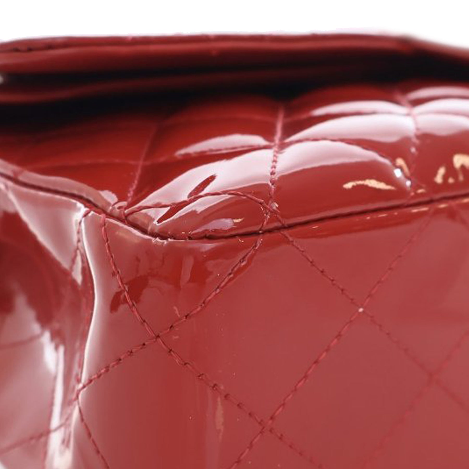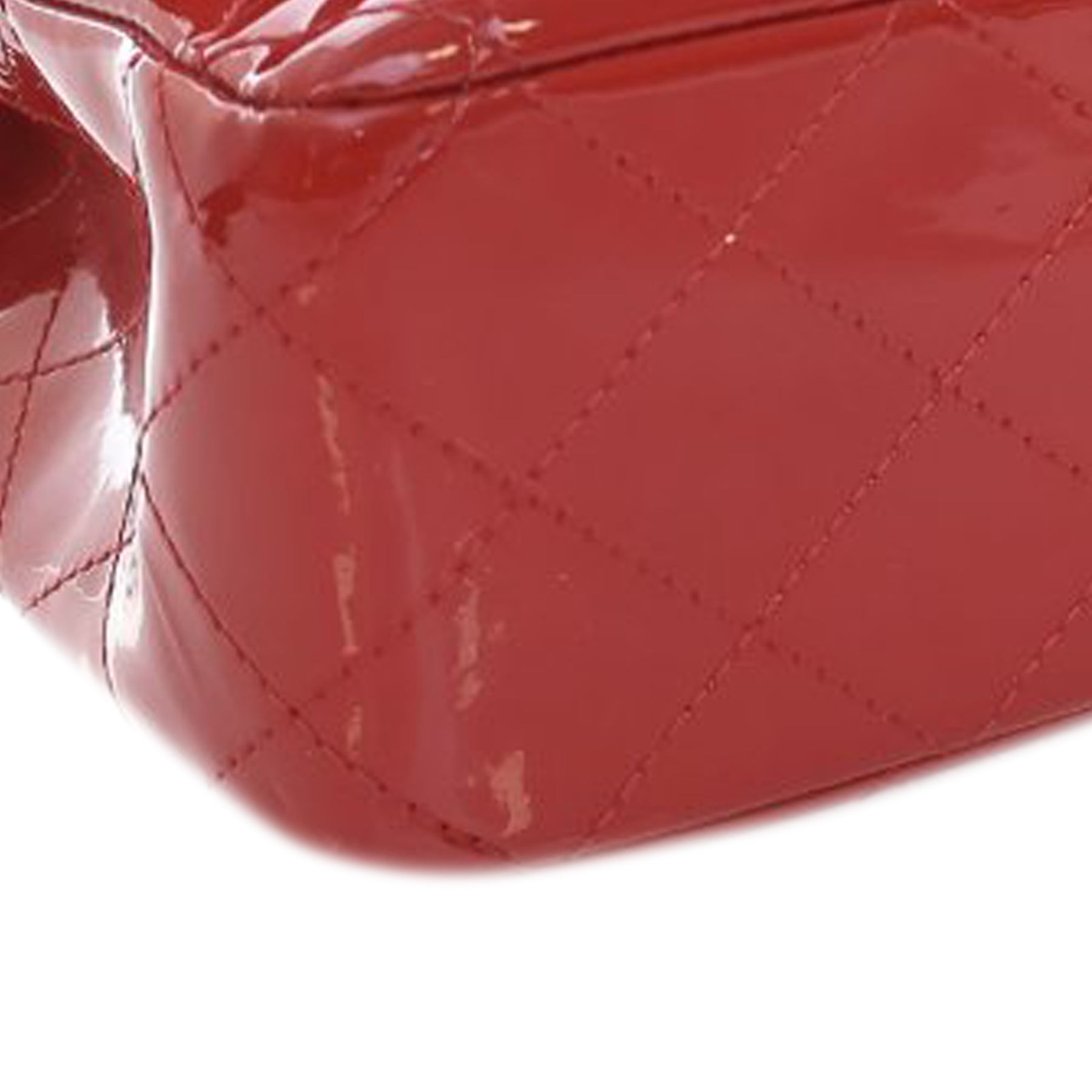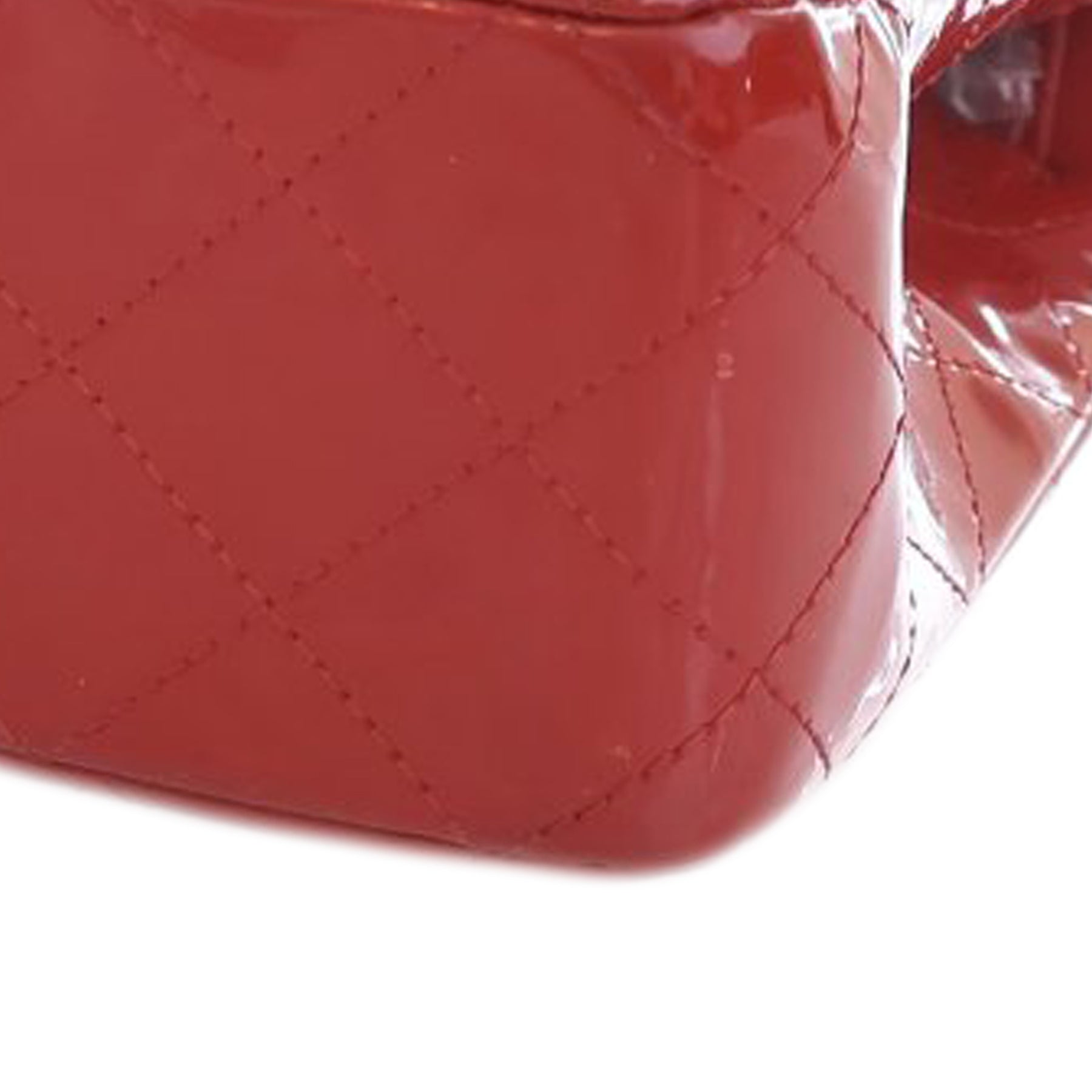 Ce sac bandoulière est confectionné en cuir verni matelassé et possède une bandoulière en chaîne tressée de cuir, un double rabat avant avec fermoir CC, une poche plaquée extérieure au dos et des poches plaquées intérieures. Il est en bon état.