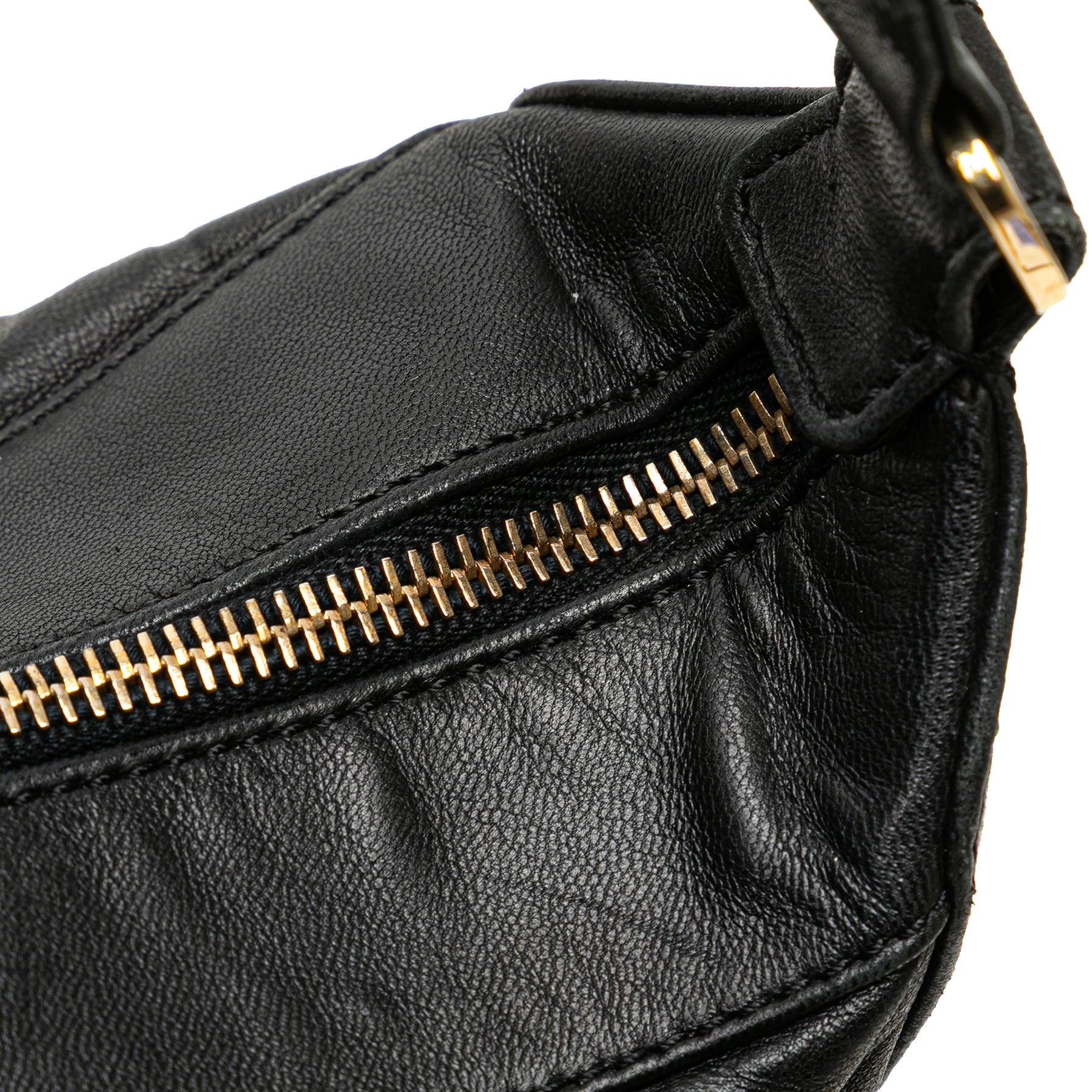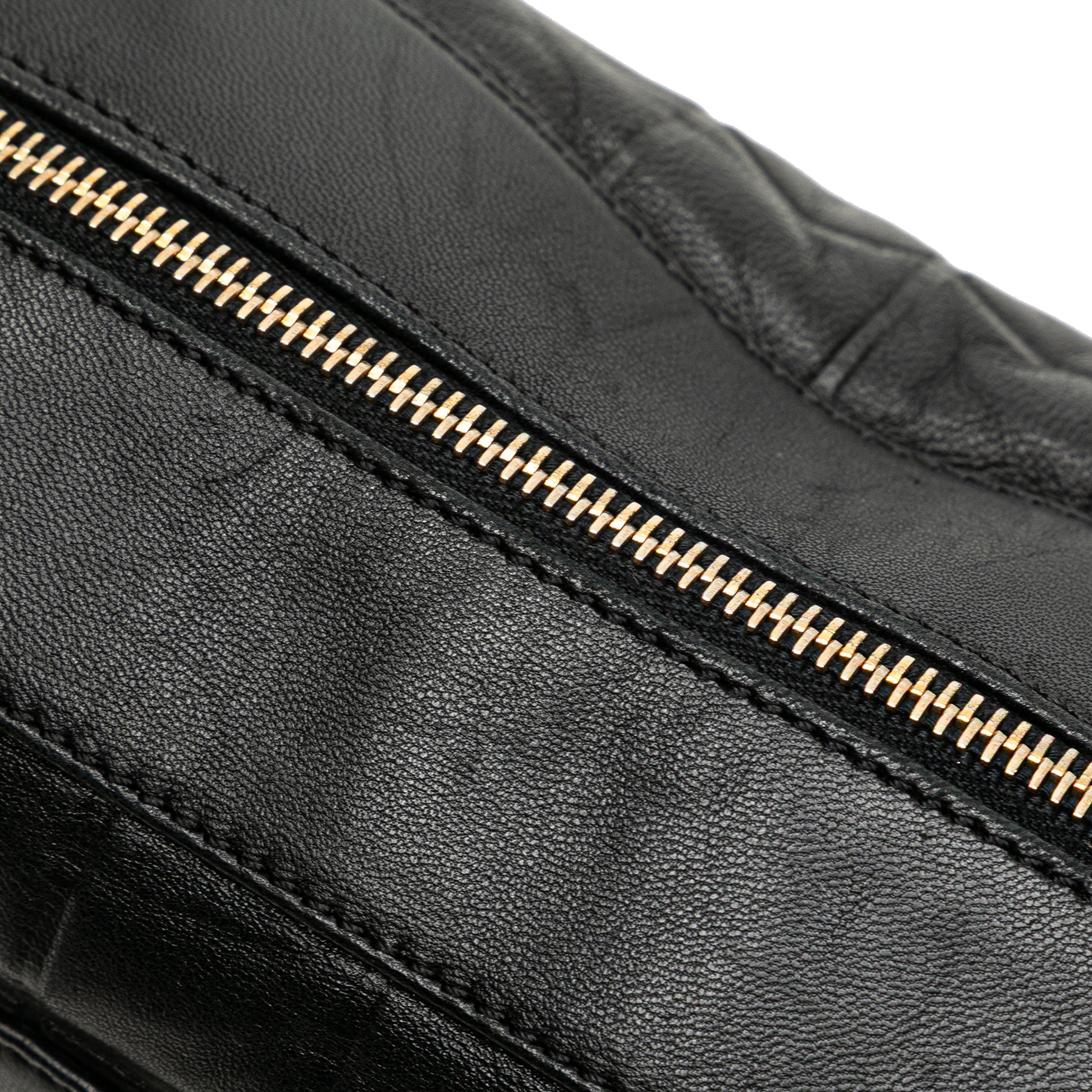 Ce sac bandoulière est doté d'un corps en cuir d'agneau matelassé, d'une bandoulière plate réglable en cuir, d'une fermeture zippée sur le dessus et de poches intérieures zippées et plaquées. Il est en bon état.