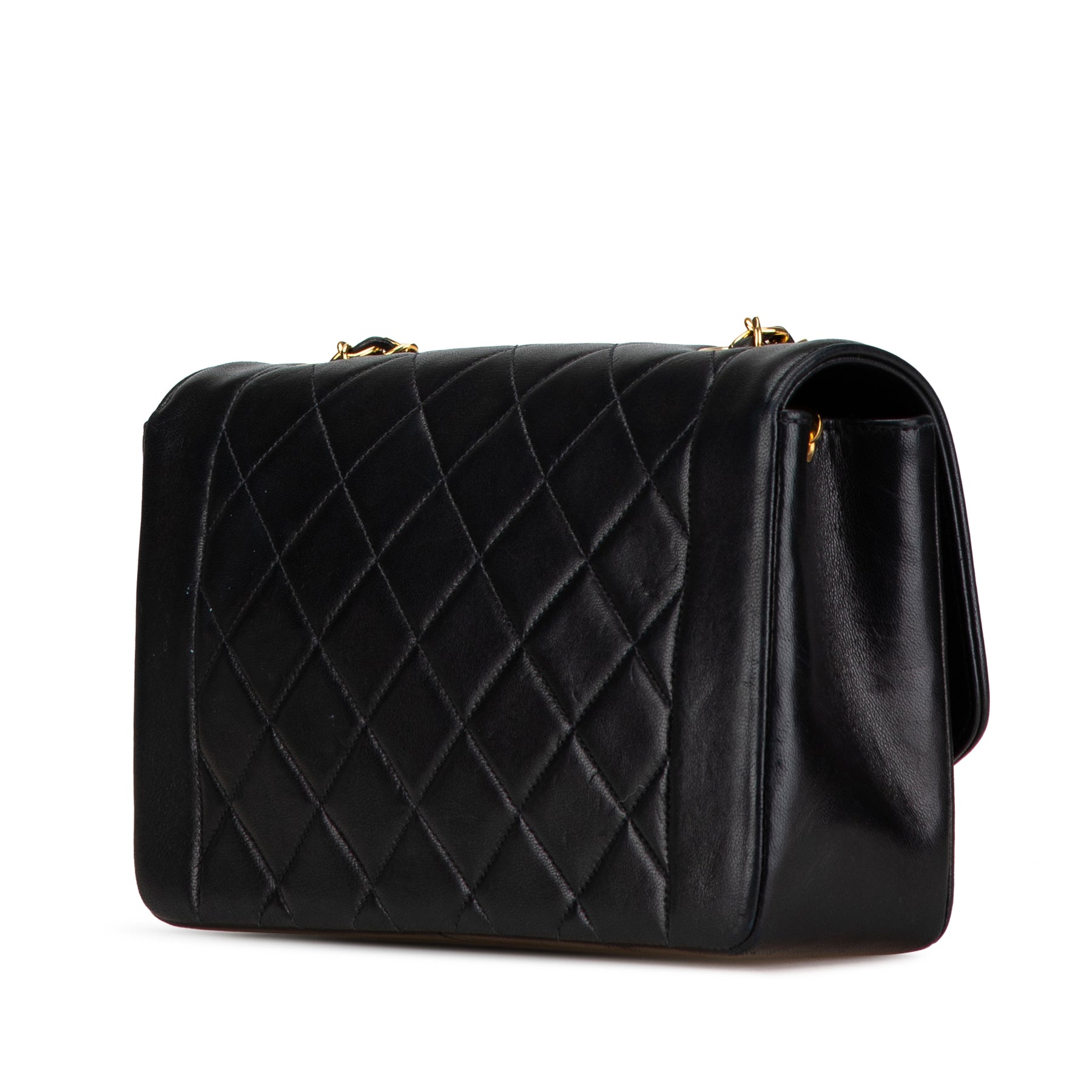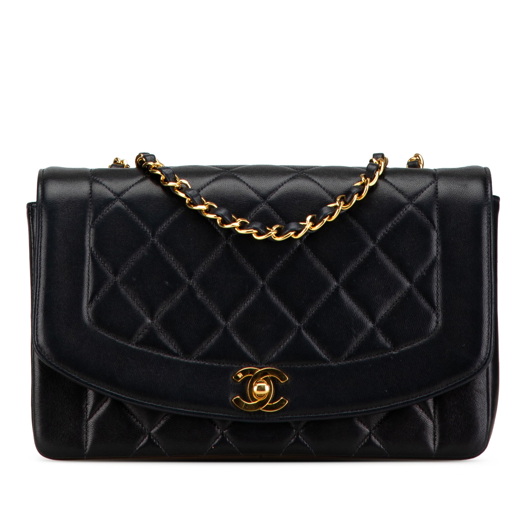 Le sac Diana à rabat est confectionné en cuir d'agneau matelassé et possède une bandoulière en chaîne tressée de cuir, un rabat avant orné du double C entrelacé et d'une fermeture à tourniquet, ainsi que des poches intérieures zippées et plaquées. Il est en bon état.