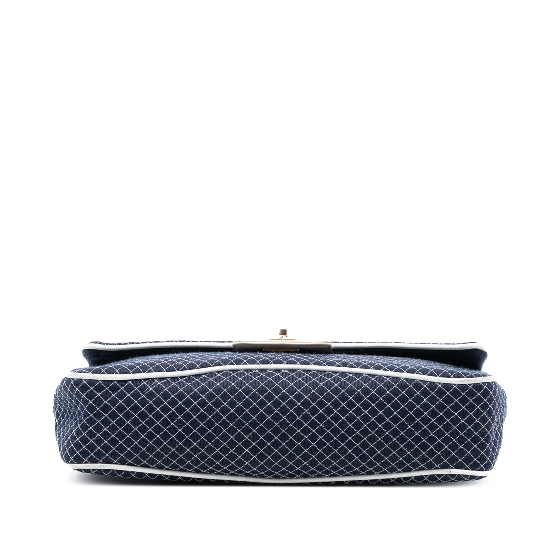 Ce sac à rabat est confectionné en jersey matelassé avec des finitions en cuir, une bandoulière en chaîne tressée de cuir, un rabat avant à fermeture pivotante, une poche plaquée extérieure au dos et une poche intérieure zippée. Les côtés extérieurs ont été repeints. Il est en bon état.