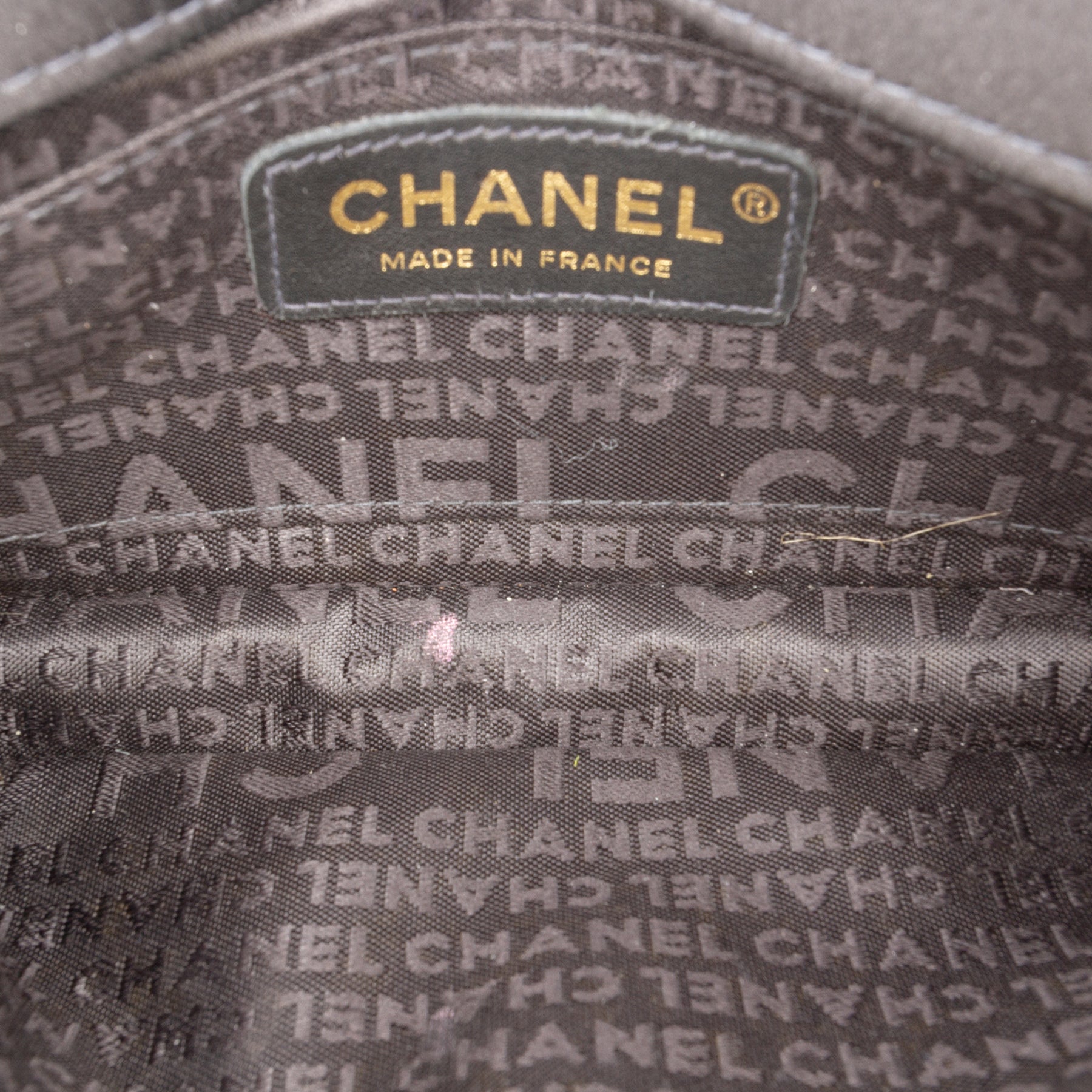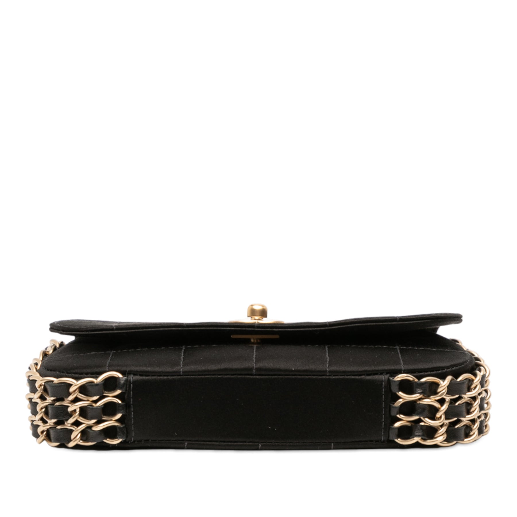 Ce sac bandoulière est en satin matelassé, possède trois bandoulières en chaîne tressée de cuir, un rabat avant orné de deux C entrelacés et d'une fermeture à tourniquet, ainsi que des poches intérieures plaquées. Il est en excellent état.