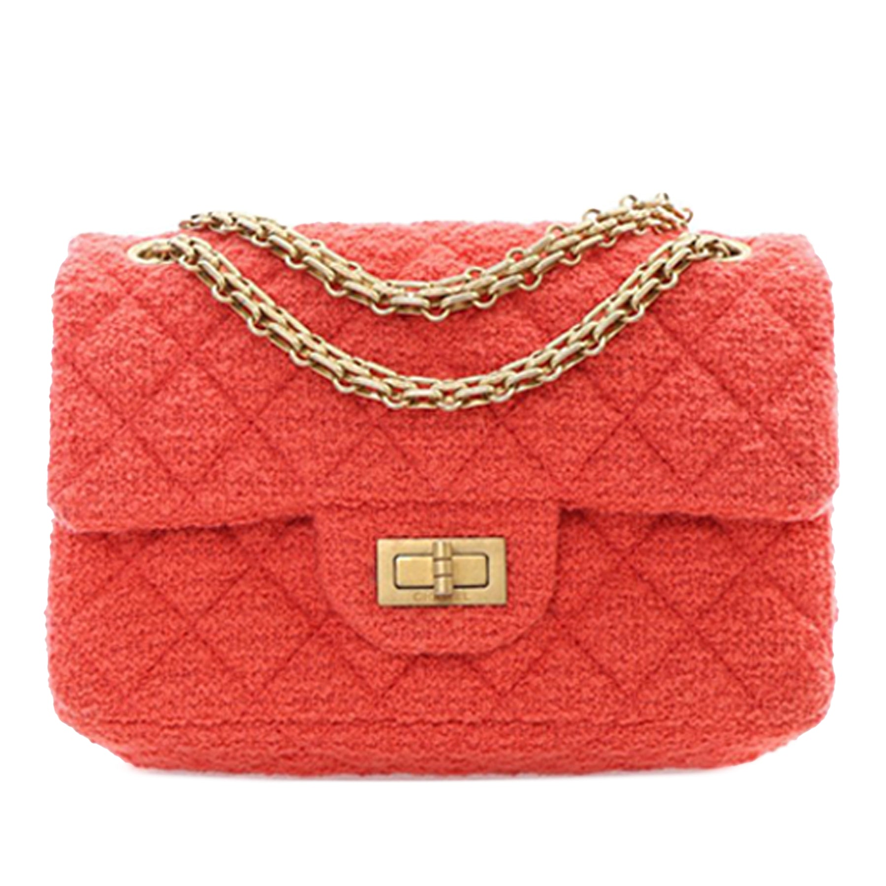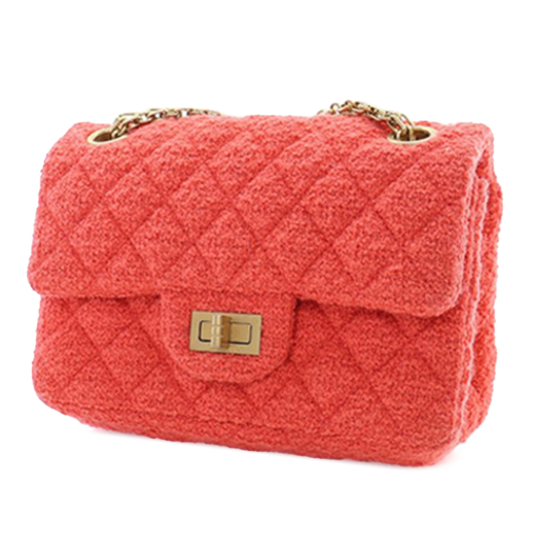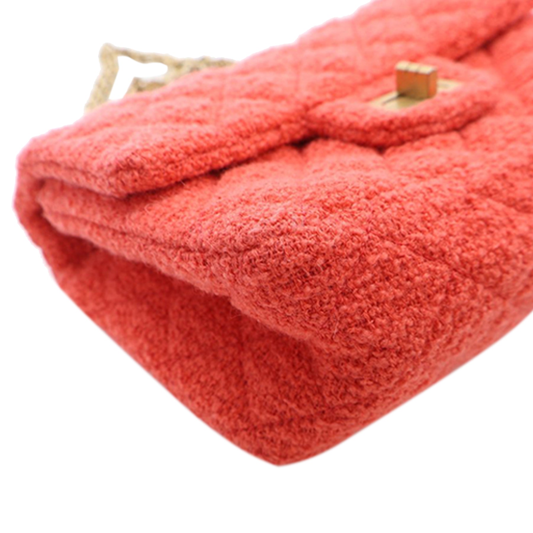 Ce sac à rabat est en tweed, avec des anses en chaîne dorée, un rabat avant à fermeture pivotante, une poche plaquée extérieure au dos et des poches intérieures zippées et plaquées. Il est en excellent état.